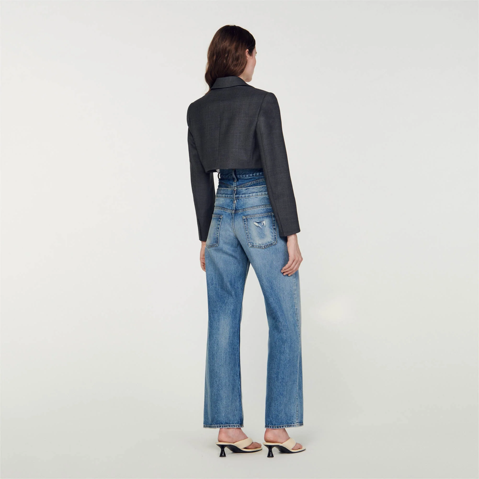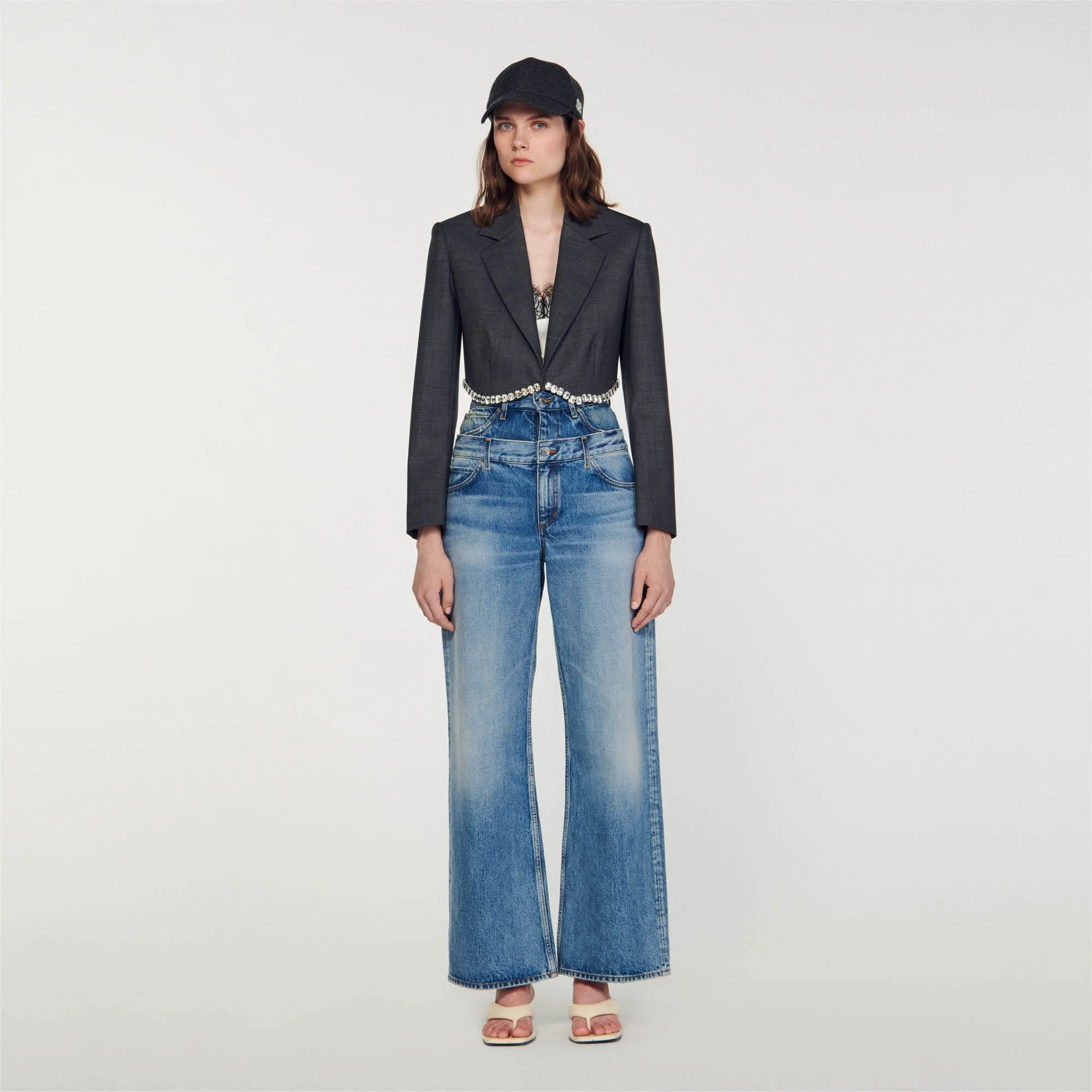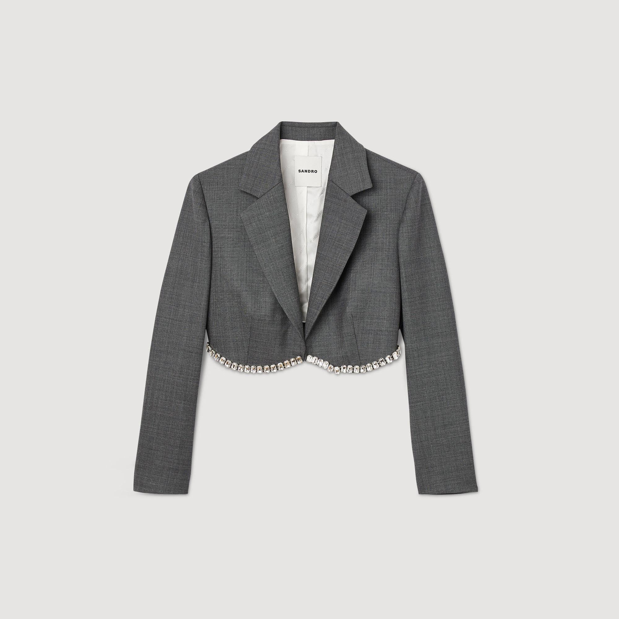 Chaqueta corta de traje de manga larga y cuello con dobladillo, adornada con estrás en la parte inferior.• Chaqueta de traje corta Sandro Mujer