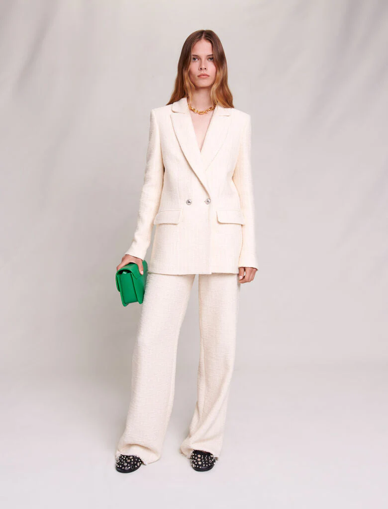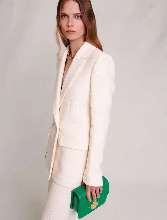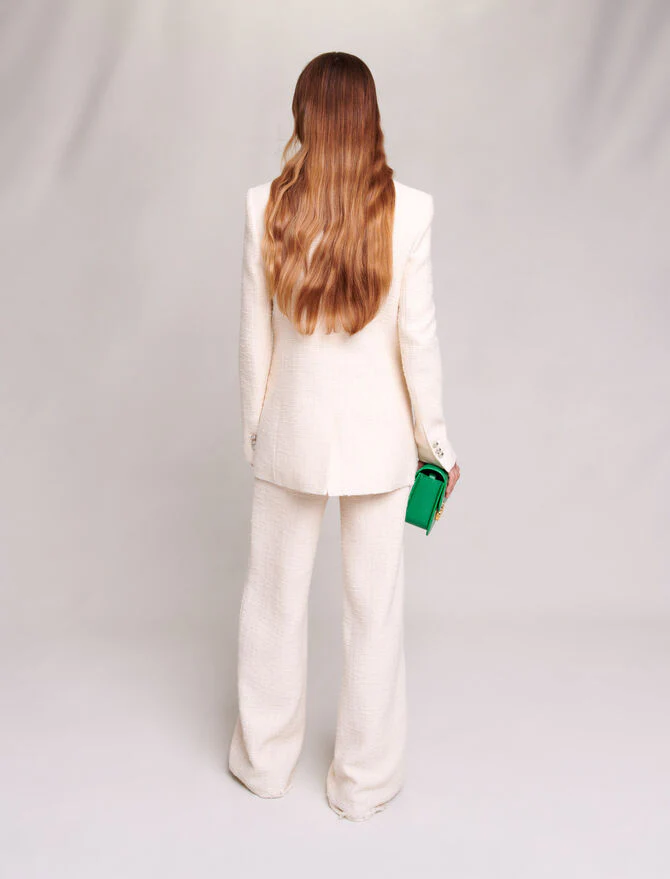Sumérjase en el atrevido mundo urbano de nuestra nueva colección, diseñada con pasión por nuestro estudio de diseño. Cada pieza es una prenda indispensable rediseñada del guardarropa. Exprese su creatividad mezclando estilos y creando «looks» que reflejen su personalidad única.Elegante e intemporal, esta chaqueta de tweed con mangas largas y bolsillos con solapa tiene una figura entallada. Con un cierre de dos botones, tiene un cuello clásico y ofrece muchas posibilidades dependiendo de los accesorios que lleve.Combínela con un pantalón a juego para crear un traje de dos piezas y añada un bolso insignia y manoletinas con tachuelas.Ref.: MFPVE00490