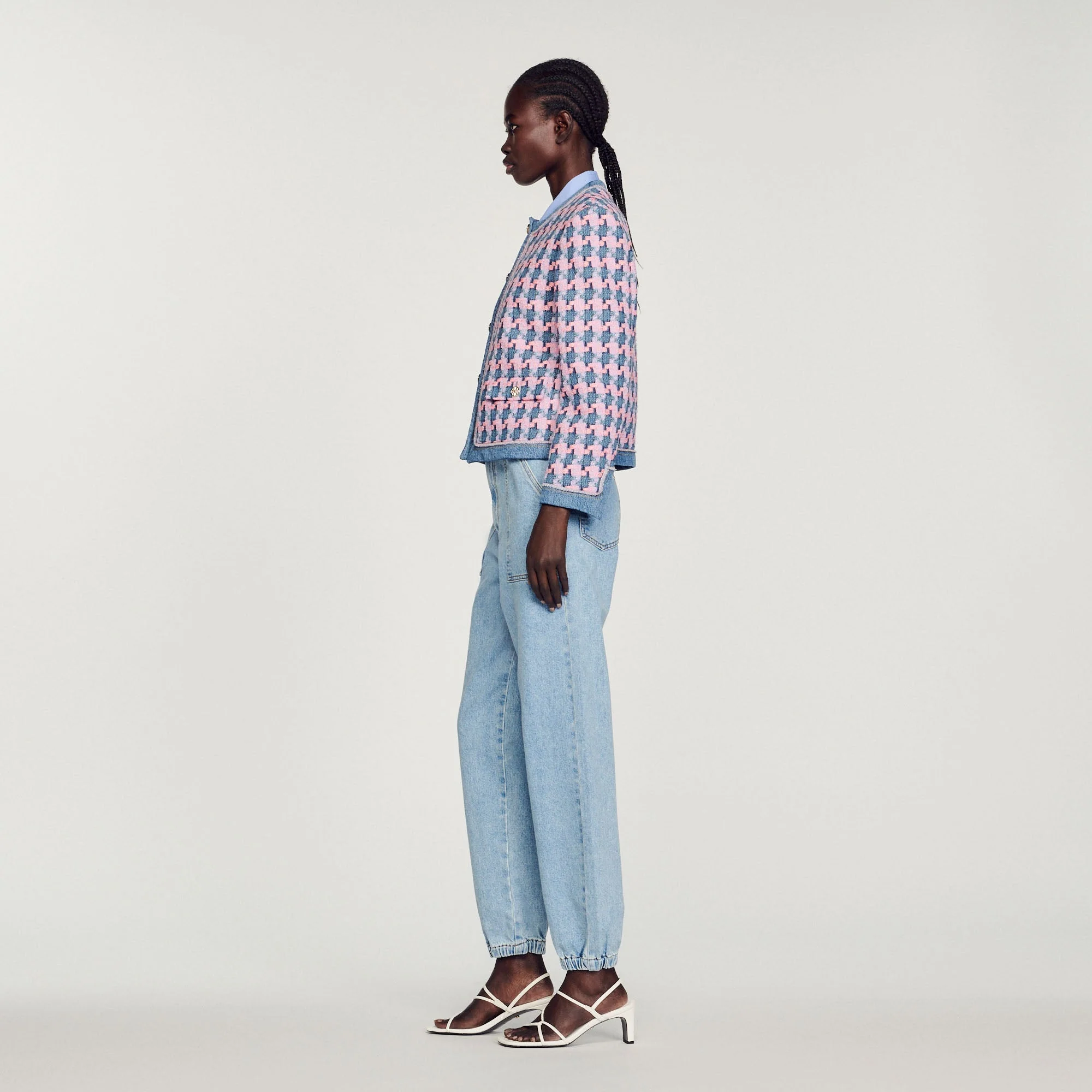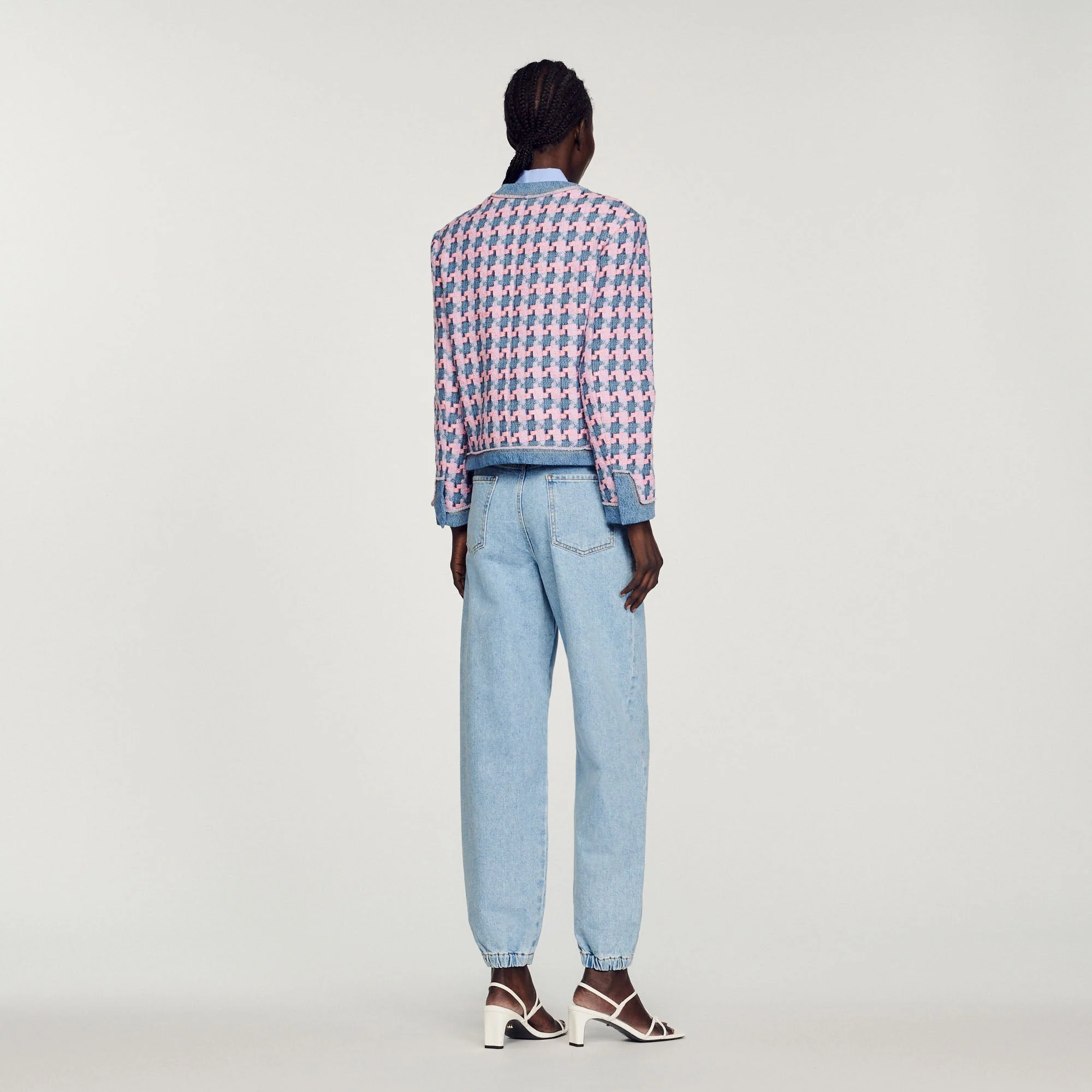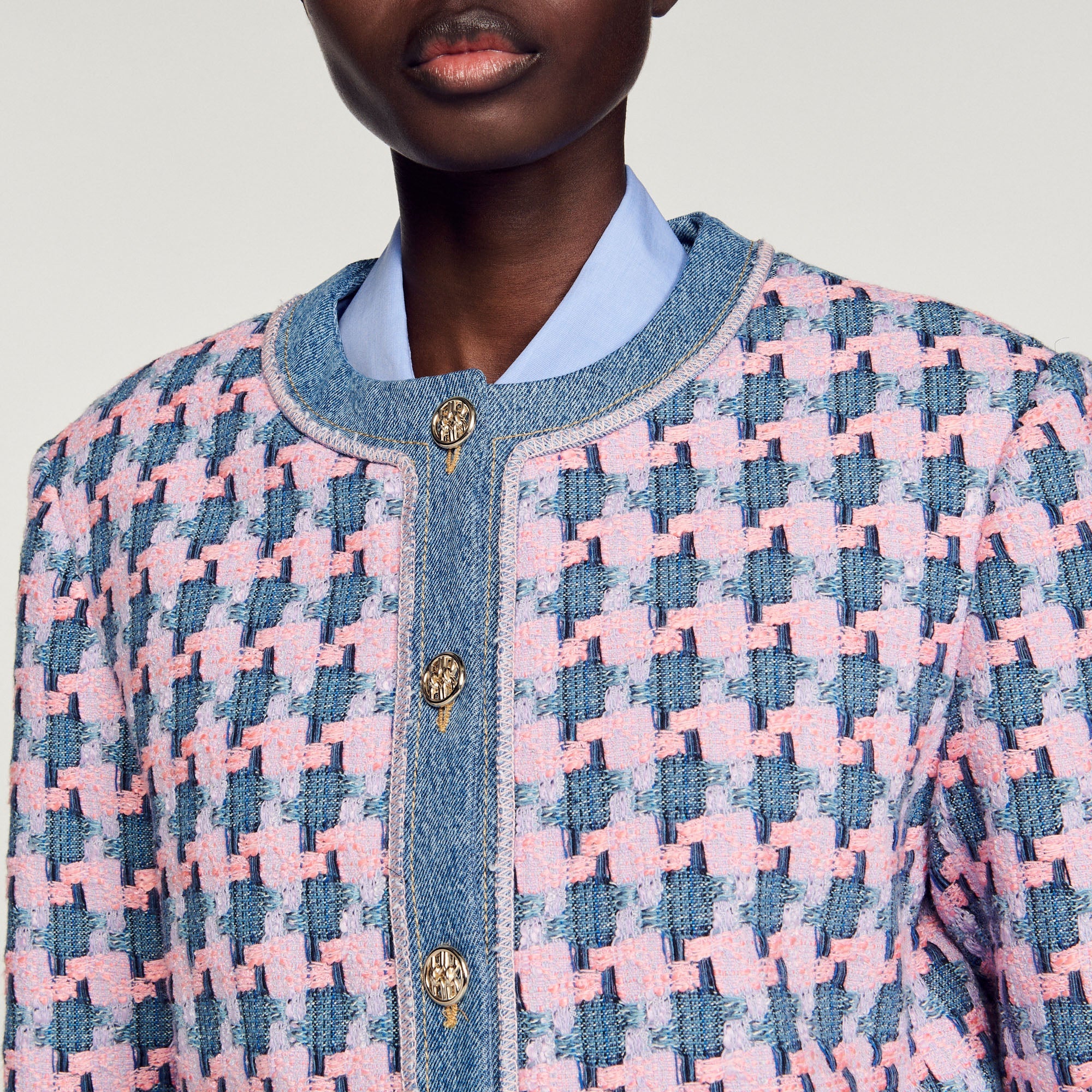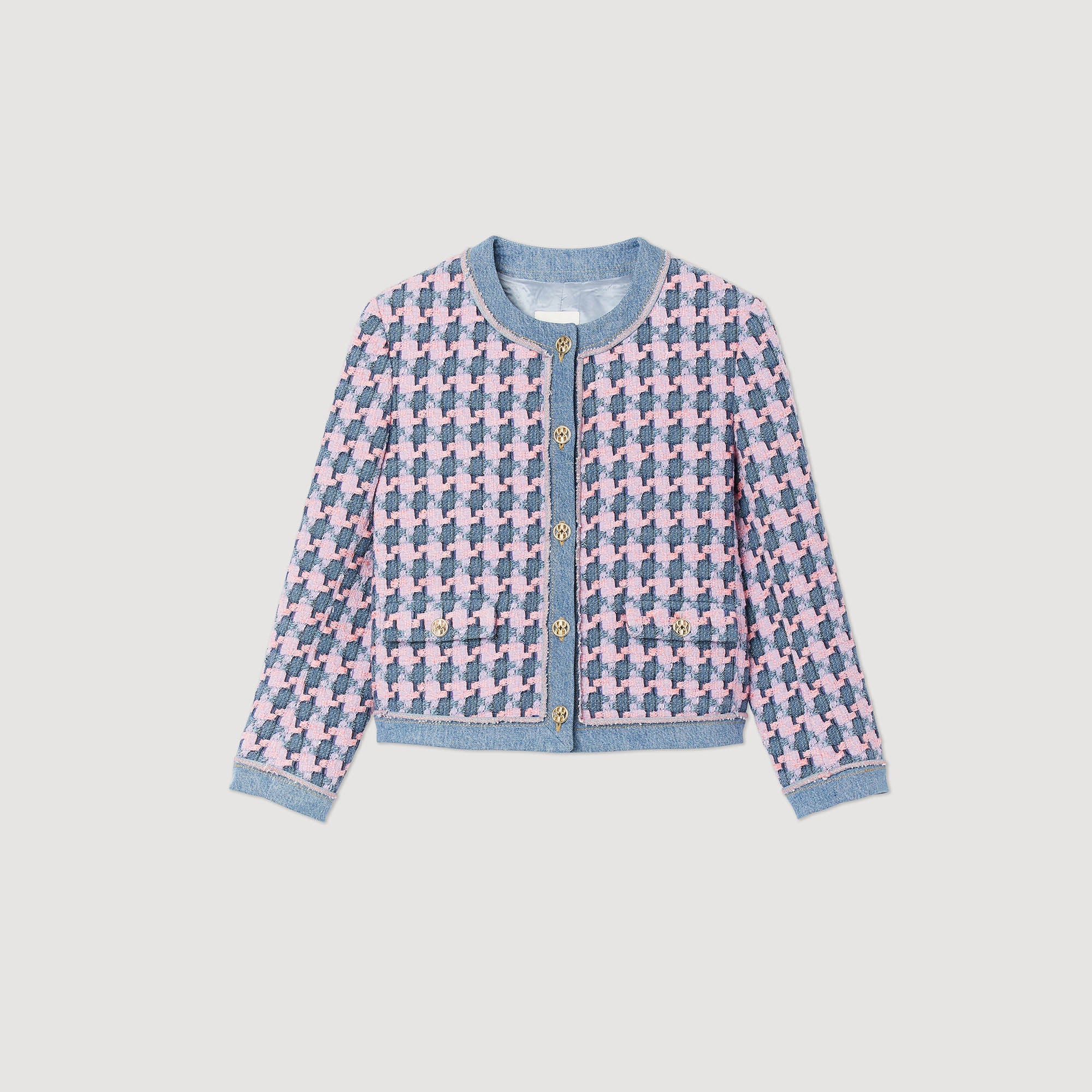 Chaqueta de manga larga de tweed fantasía, sublimada con acabados de denim, con bolsillos con solapa y botones dorados.• Chaqueta de tweed Sandro de mujer