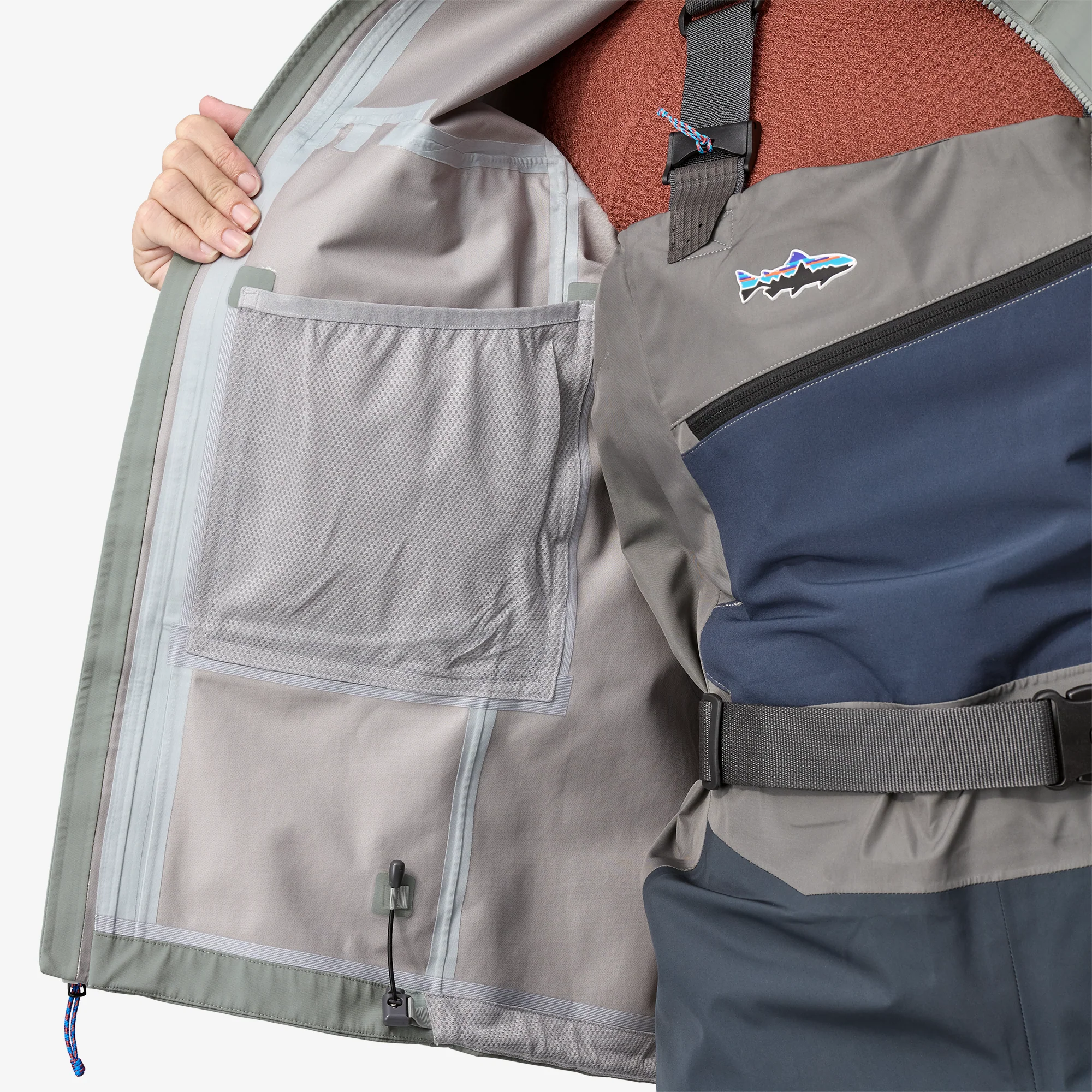 Dos bolsillos discretos delanteros con cremallera; bolsillos abrigados con cremallera para vadeo profundo y solapas comodidad en las manos