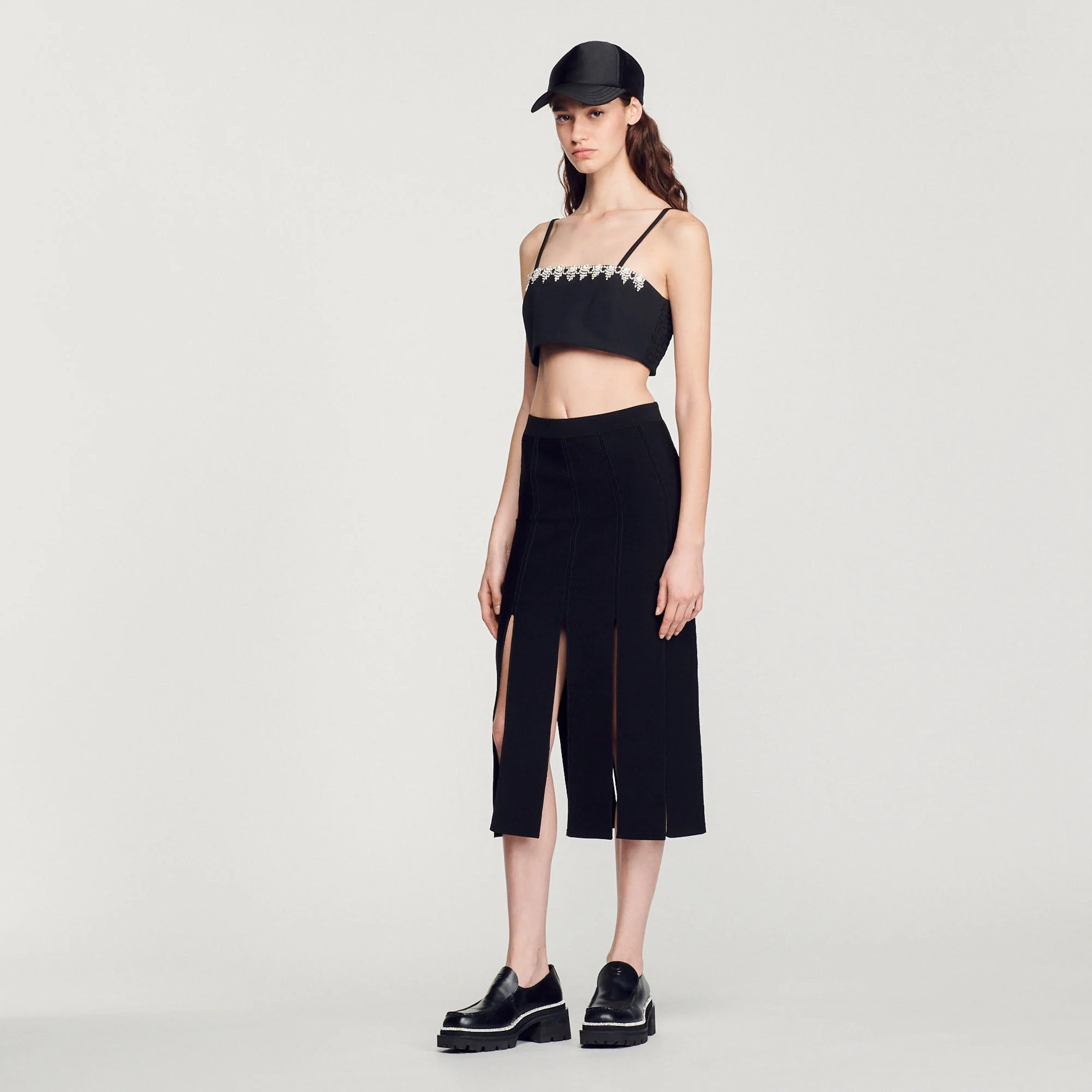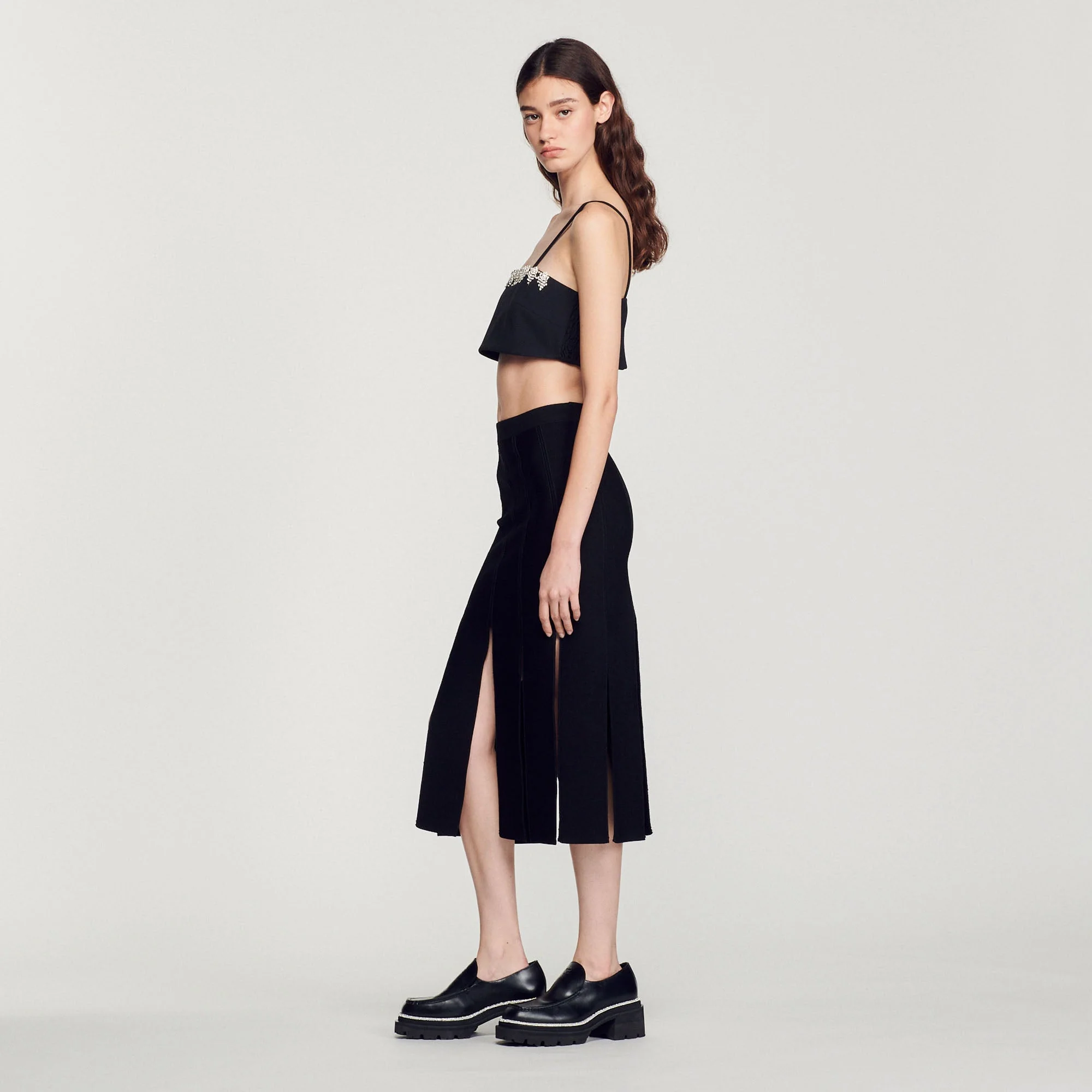 Corpiño corto de satén de tirantes finos, sublimado con un pasamanos de strass en el escote.