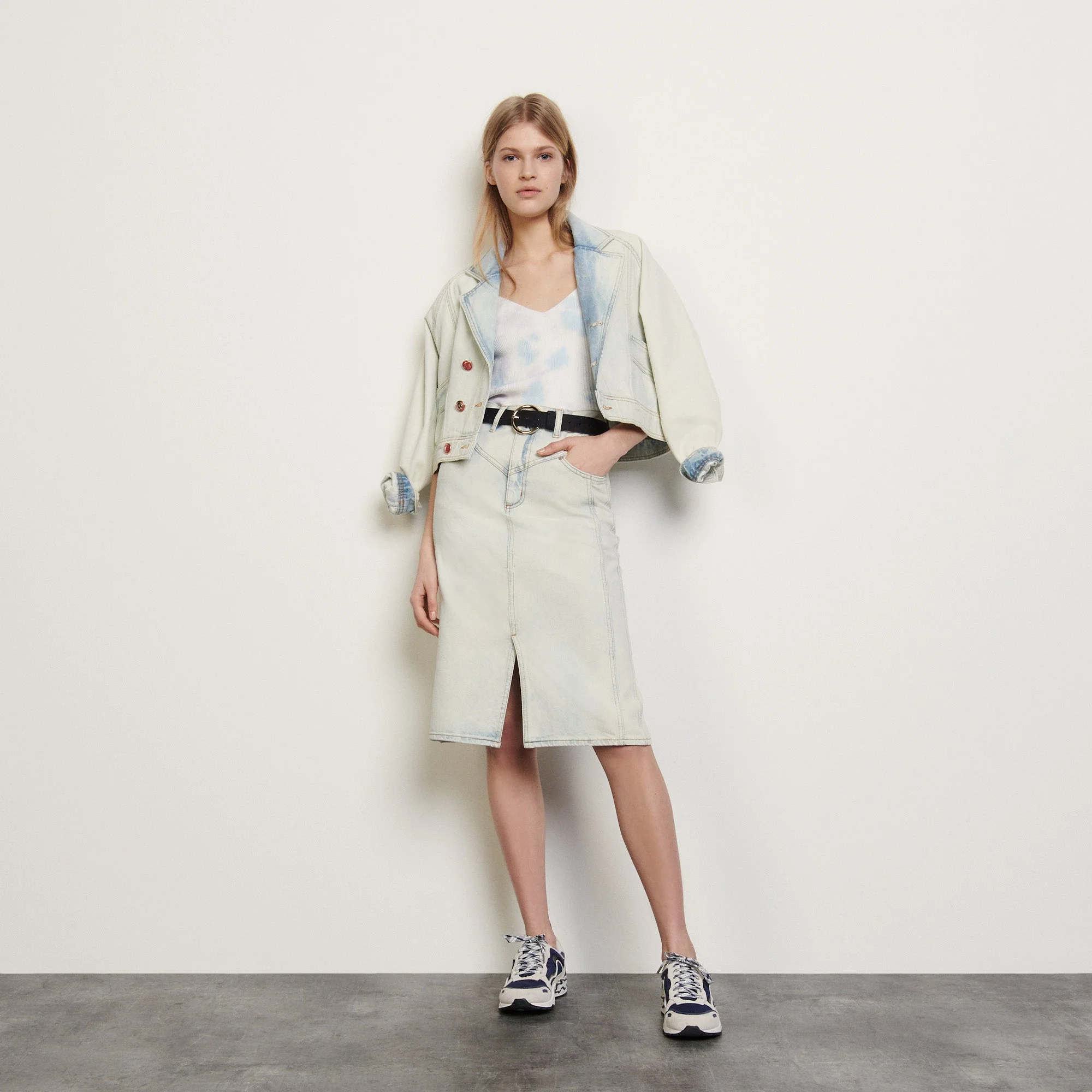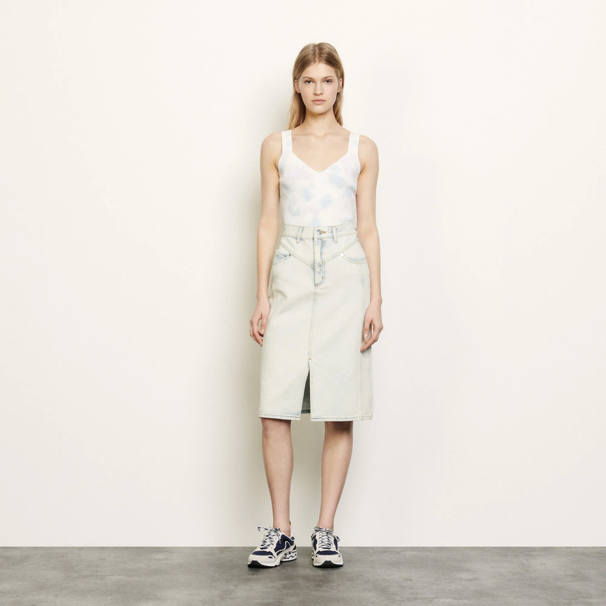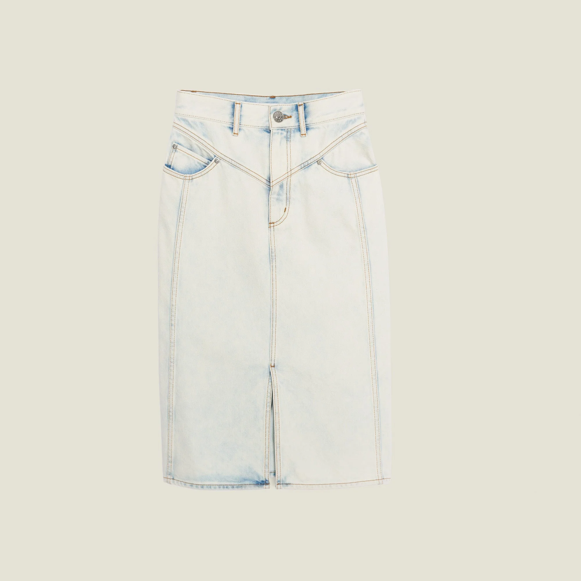 Falda de mezclilla con lavado de nieve con cinco bolsillos y recortes de pespuntes.
