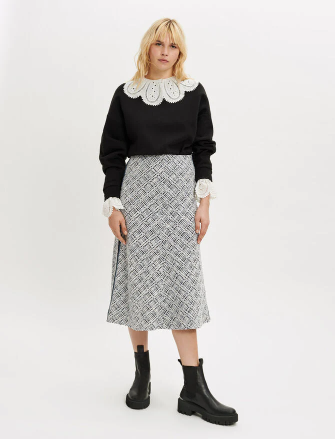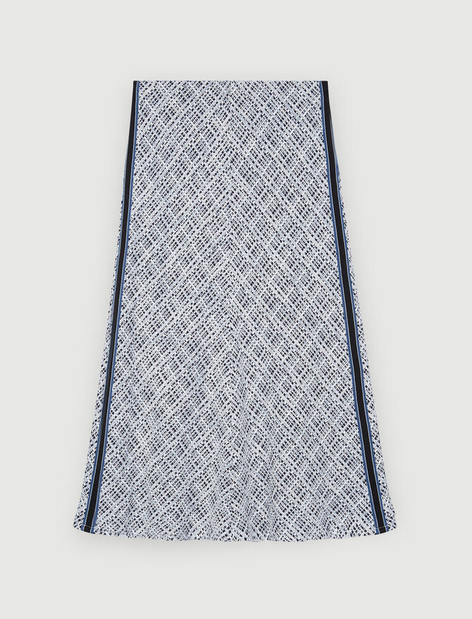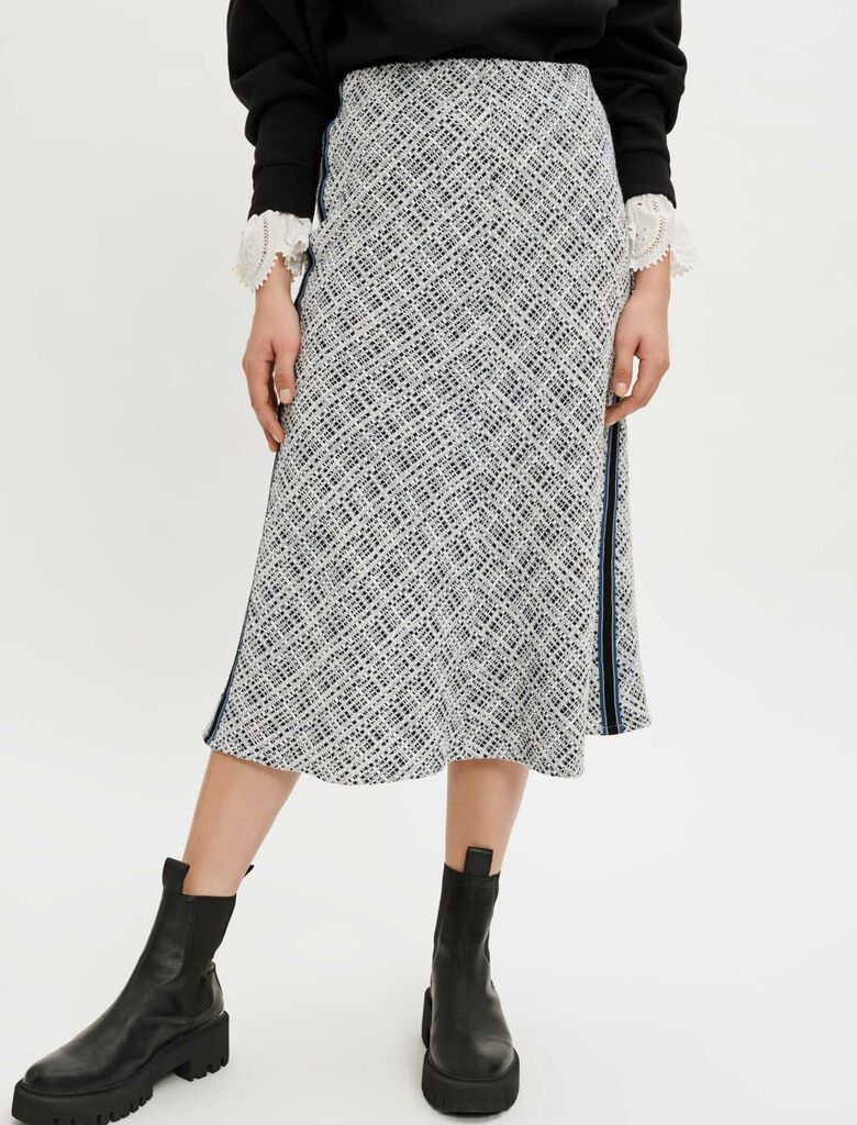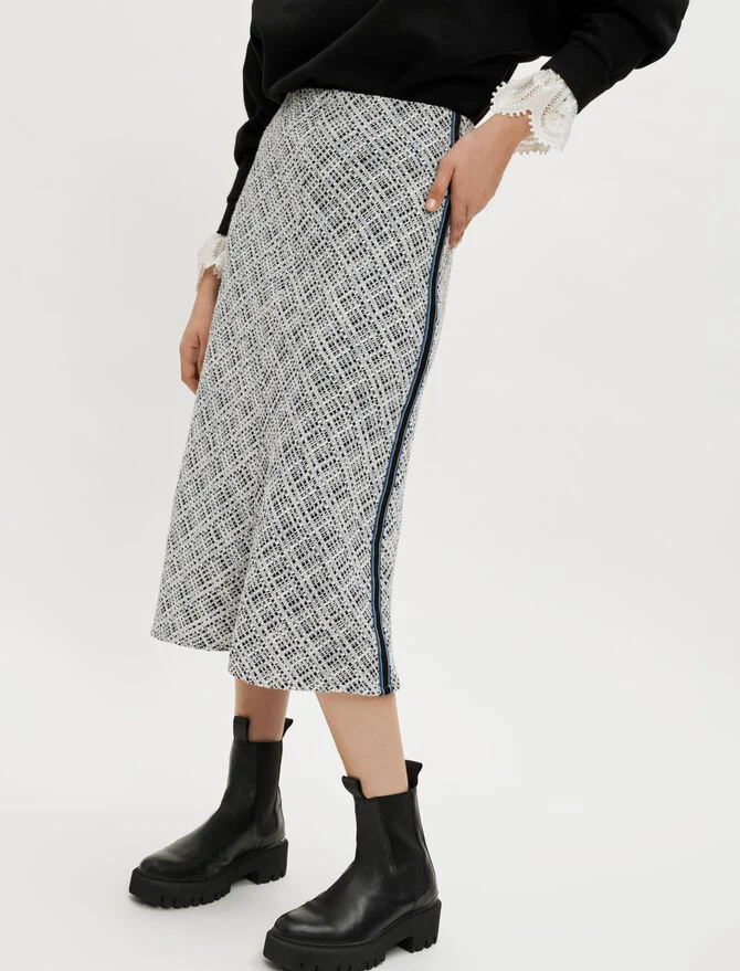Falda midi recta y fluida, ajustada en la cintura y ligeramente acampanada en la parte inferior. Tweed. Cinturilla elástica. Bandas en contraste en los laterales.