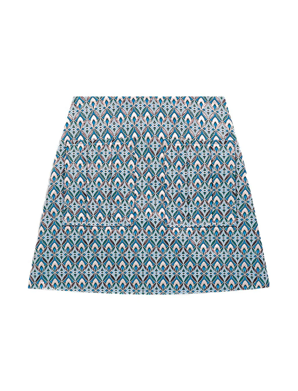 FALDA CORTA DE CORTE RECTO EN TEJIDO DE PUNTO CON DISEÑO GEOMÉTRICO Y BOLSILLO AL FRENTE., MARCA MAJE. COMPOSICIÓN: 59% POLIÉSTER, 41% ACETATO. INSTRUCCIONES DE LAVADO: LAVADO EN SECO.