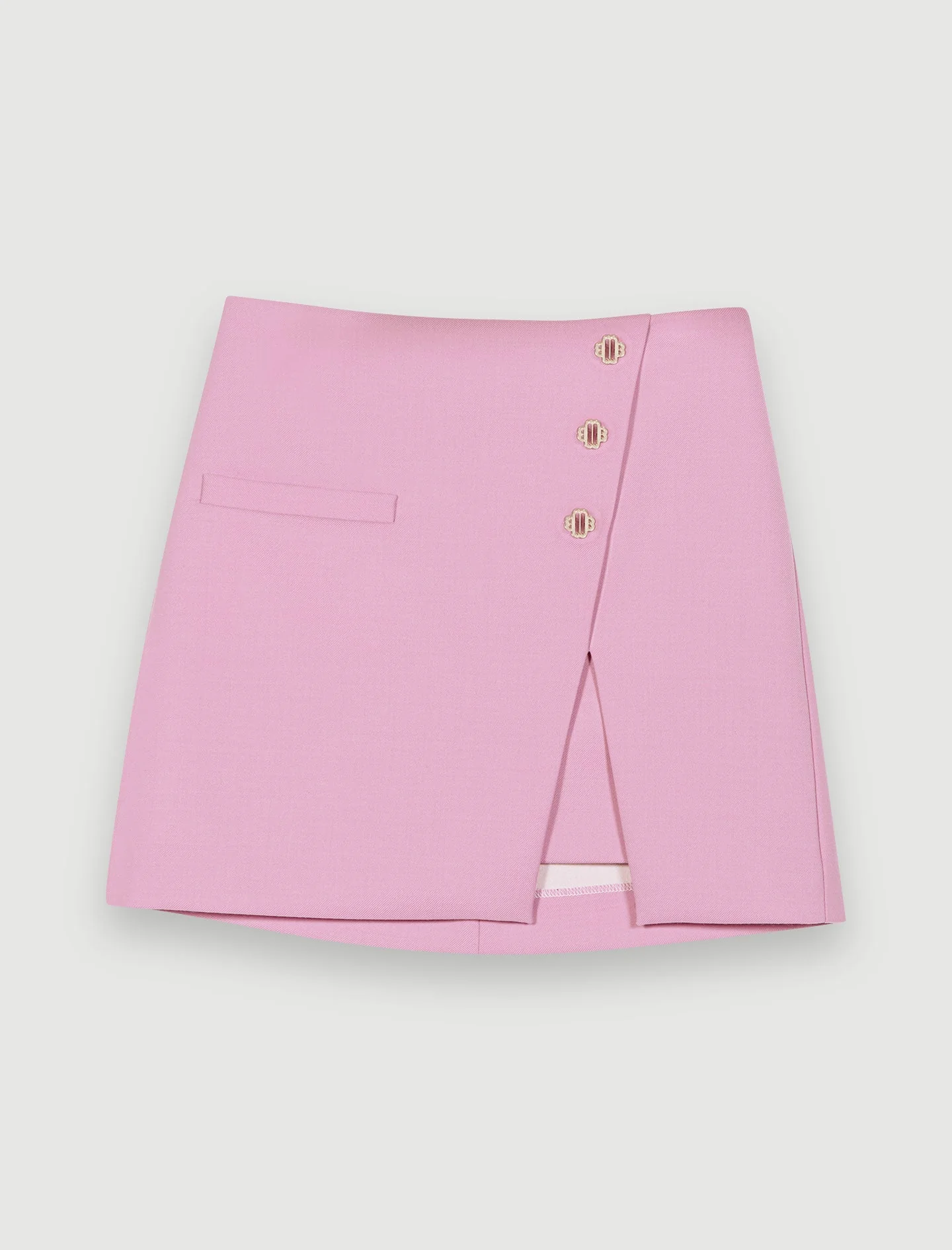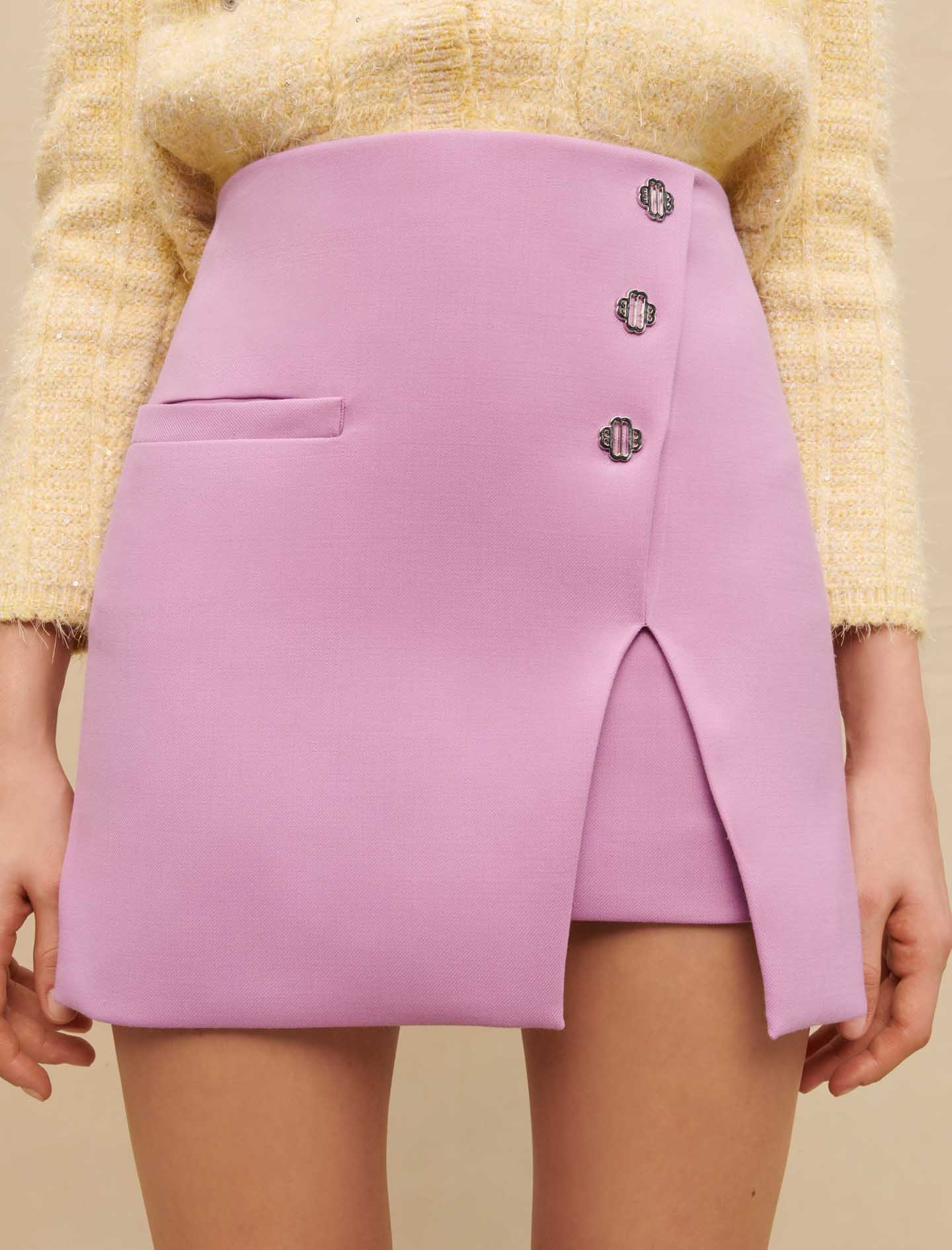 Falda corta, estructurada y asimétrica color parma de efecto cruzado para jugar con los largos con botones decorados de metal plateado y un bolsillo ribeteado.Ref.: MFPJU00956