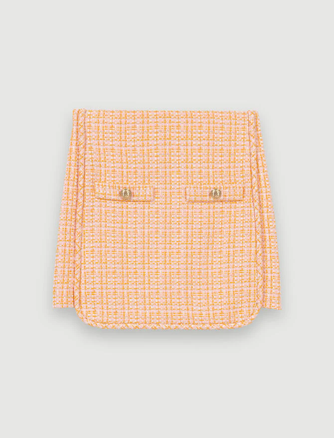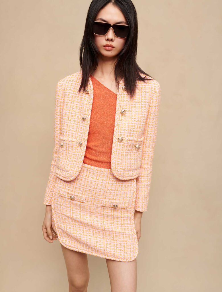 El verano de Maje será pastel. Los colores suaves transforman la clásica falda de tweed e inyectan ligereza a los looks de oficina. Esta falda corta de corte recto y tiro medio se ha diseñado en un tejido de efecto tweed con dos bolsillos falsos con botones dorados trabajados y tablas en los laterales que juegan con los largos. Para crear un look elegante, apuesta por un total look combinándola con la chaqueta a juego. Si buscas un look más informal, añade simplemente una camiseta blanca.Ref.: MFPJU00993