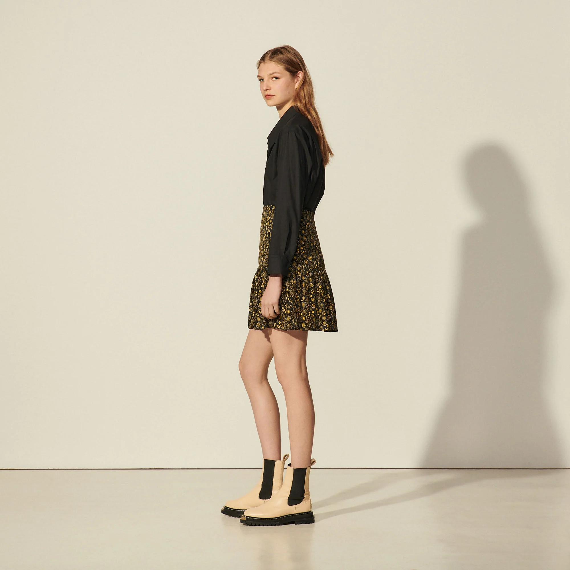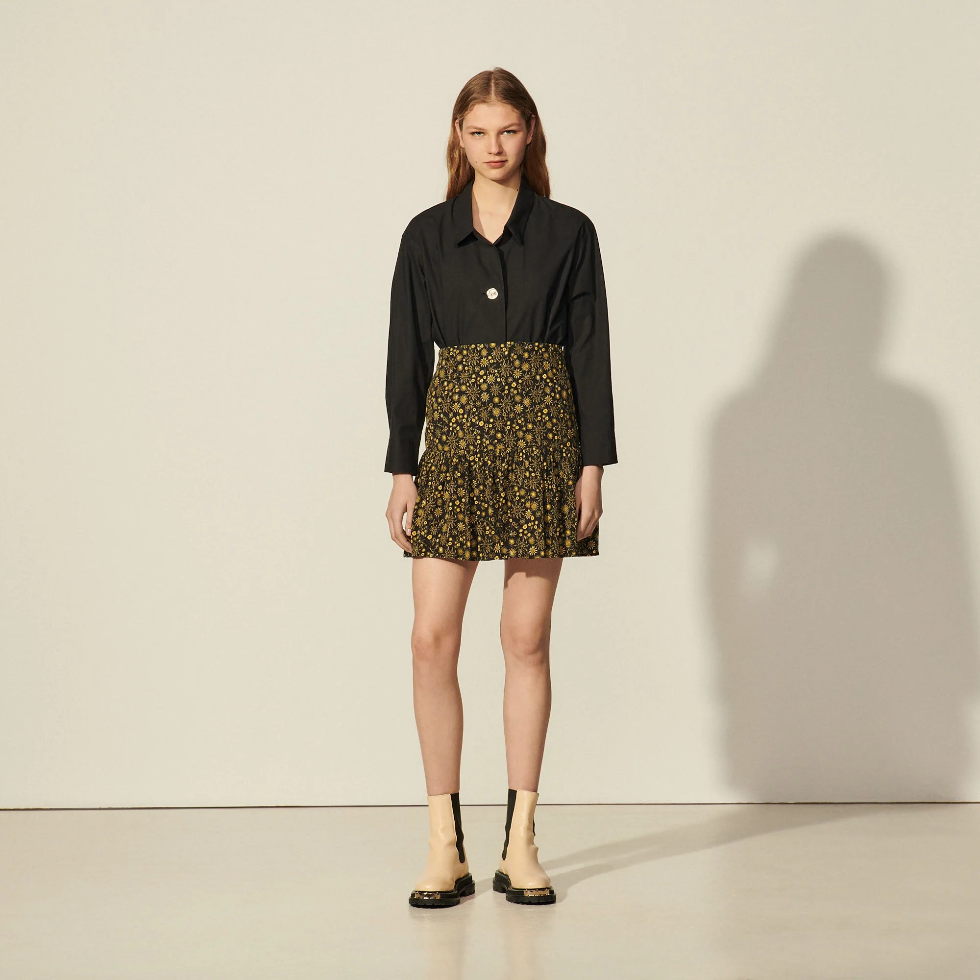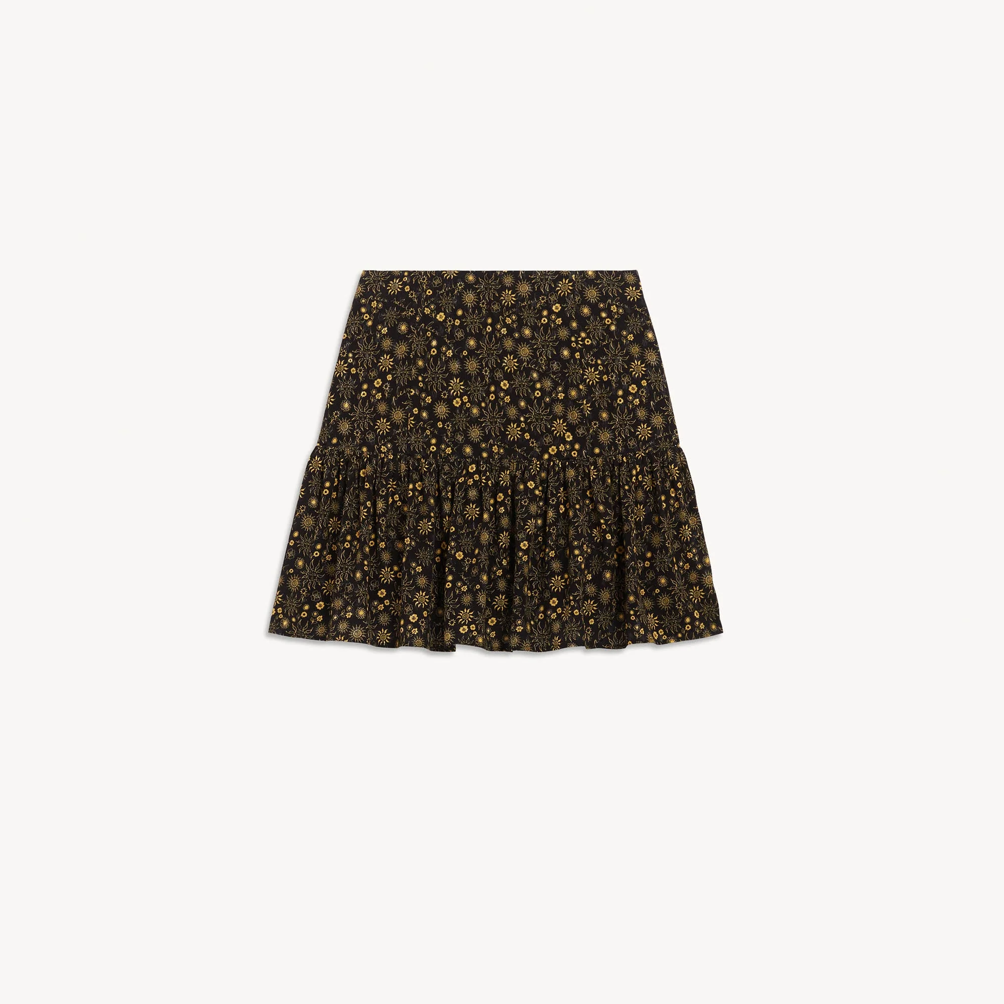 Falda de mujer Sandro Falda corta estampada Corte en la cadera con un gran volante fruncido Largo hasta la mitad del muslo Cierre de cremallera invisible La modelo lleva la talla 1 Este modelo está confeccionado en viscosa respetuosa con el medioambiente. Nuestros diseñadores han seleccionado esta fibra procedente de la pulpa de madera, ya que garantiza una gestión sostenible de los bosques. REFERENCIA : SFPJU00491 COMPOSICIÓNTejido principal: 100% viscosa Forro: 100% algodón