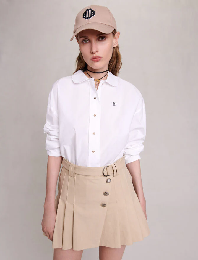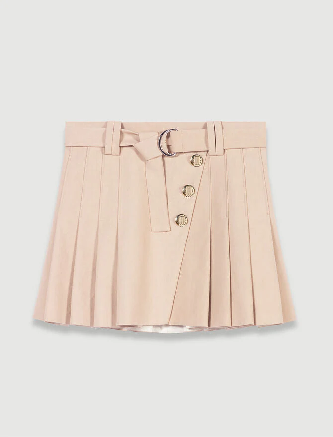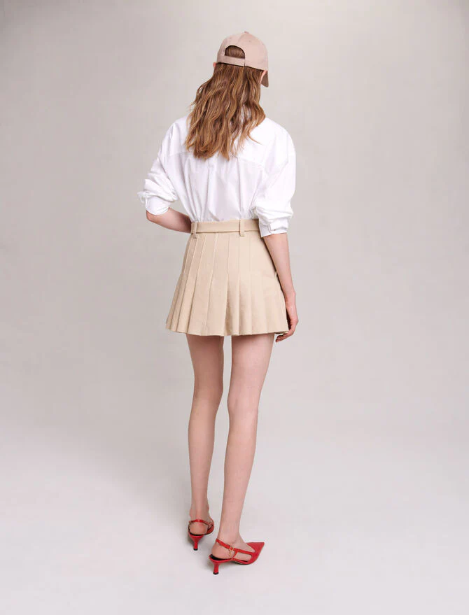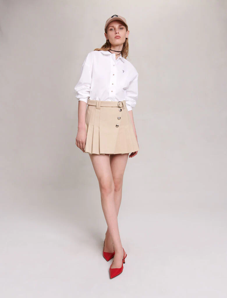 Esta temporada, Maje da una vuelta de tuerca a las piezas estrellas del guardarropa con un atrevido toque roquero.Inspirada en el «look» de colegiala, esta minifalda plisada y ligeramente acampanada tiene botones plateados de imitación en los laterales y un cinturón desmontable con hebilla ajustable en la cintura.Equipada con trabillas para el cinturón, también puede llevarse con un cinturón de cuero para mayor variedad, y tiene un cierre de cremallera en la parte trasera, así como dos bolsillos en los laterales.Juegue con el volumen combinándola con una camisa de algodón holgada y añada algunos accesorios bien pensados, como unos coloridos zapatos de tacón y una gorra de la firma.Ref.: MFPJU01055