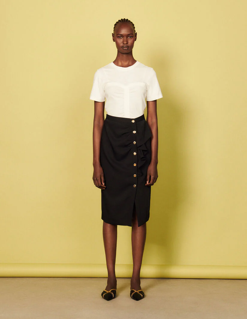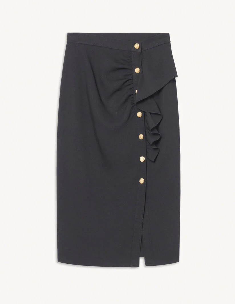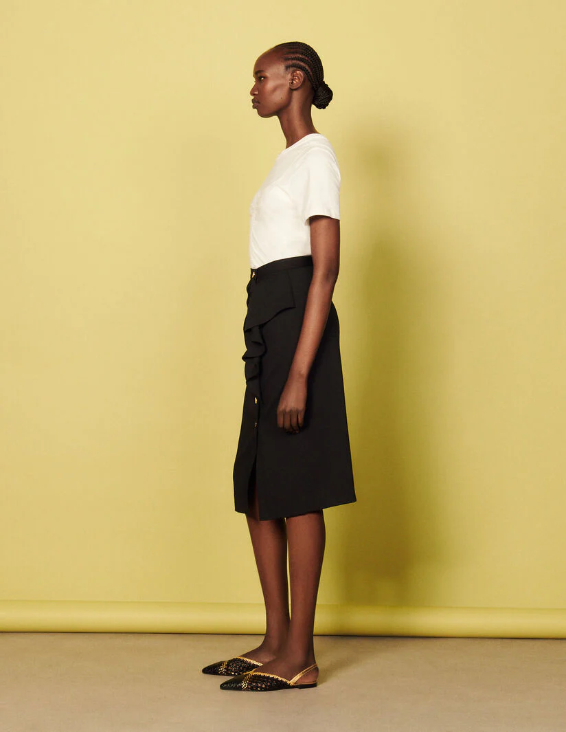 Falda midi recta con abertura, sublimada con un volante en el lateral y botones a presión de metal dorado.