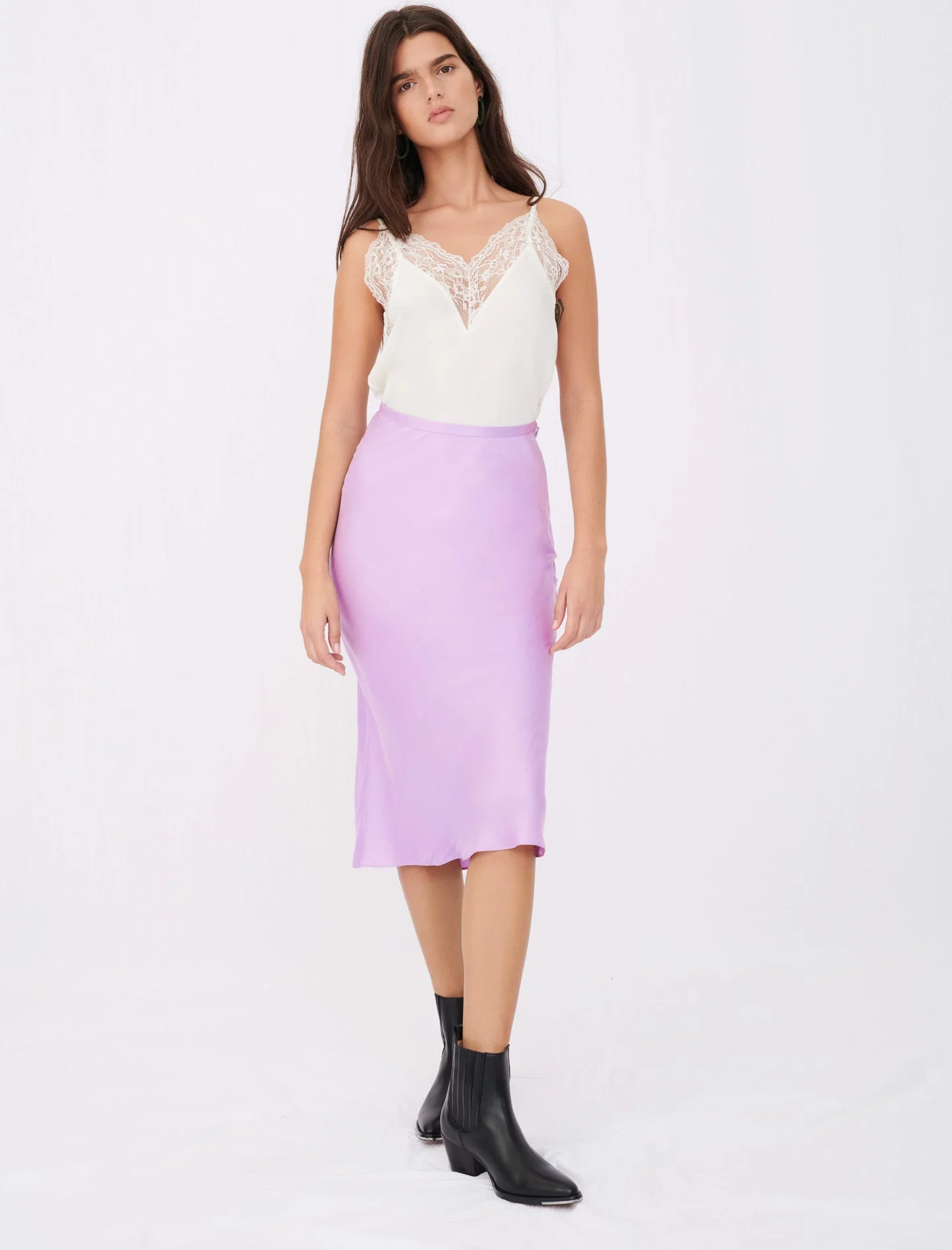 Falda Lavanda. Falda Midi Violeta, Ligeramente Ceñida, En Raso De Seda. Cremallera Invisible En El Lateral. Se Puede Llevar En Total Look Con El Top De Encaje. . Composición: Tela Principal: 100% Seda