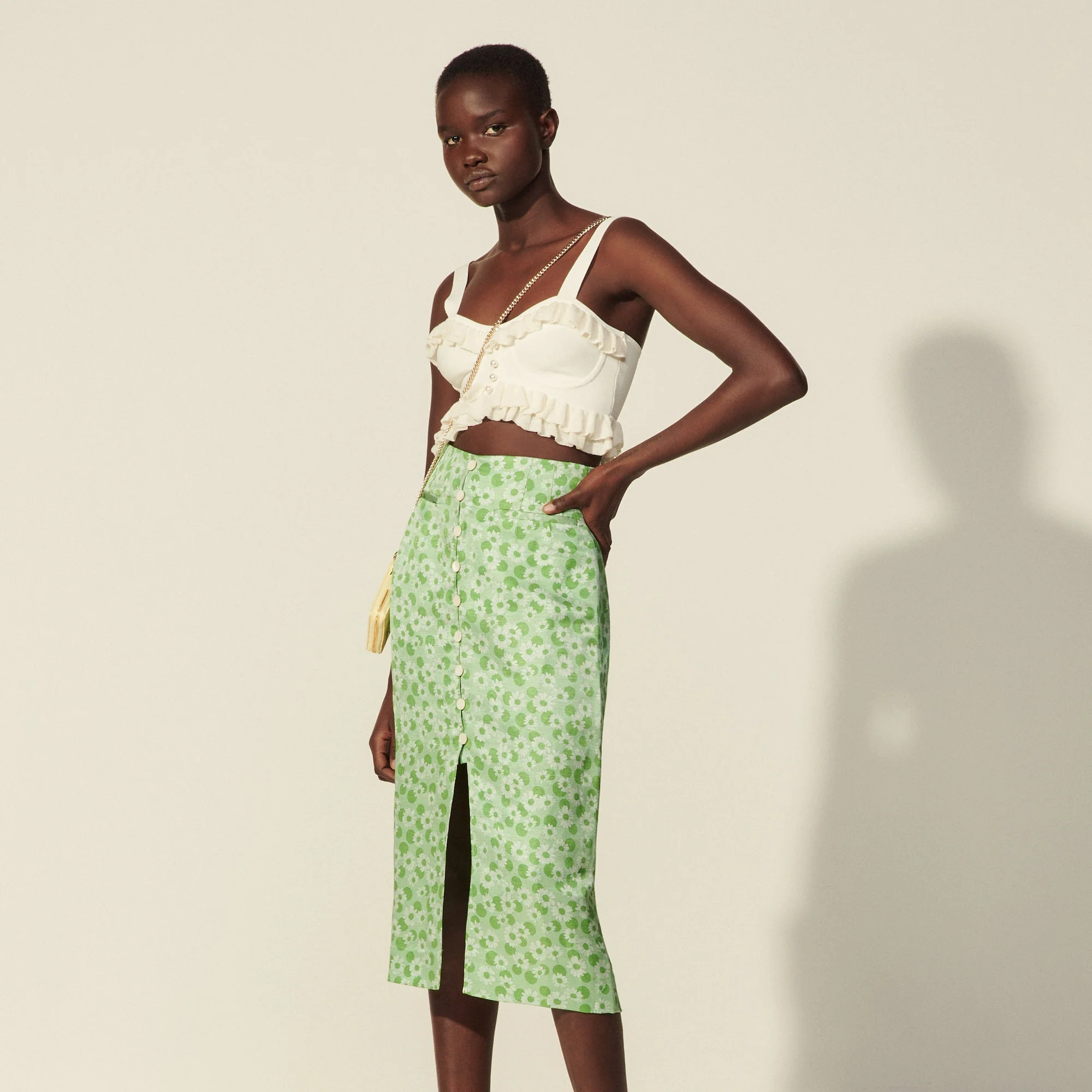 Falda Lvnde Verde. Falda de mujer Sandro • Falda recta estampada • Botonadura en la parte delantera • Bolsillos en la parte delantera • Cierre de cremallera invisible • Largo por debajo de la rodilla • La modelo lleva la talla 36 Référence : SFPJU00483COMPOSICIÓN Tejido principal: 57% lino, 43% seda Forro bolsillos: 100% algodón