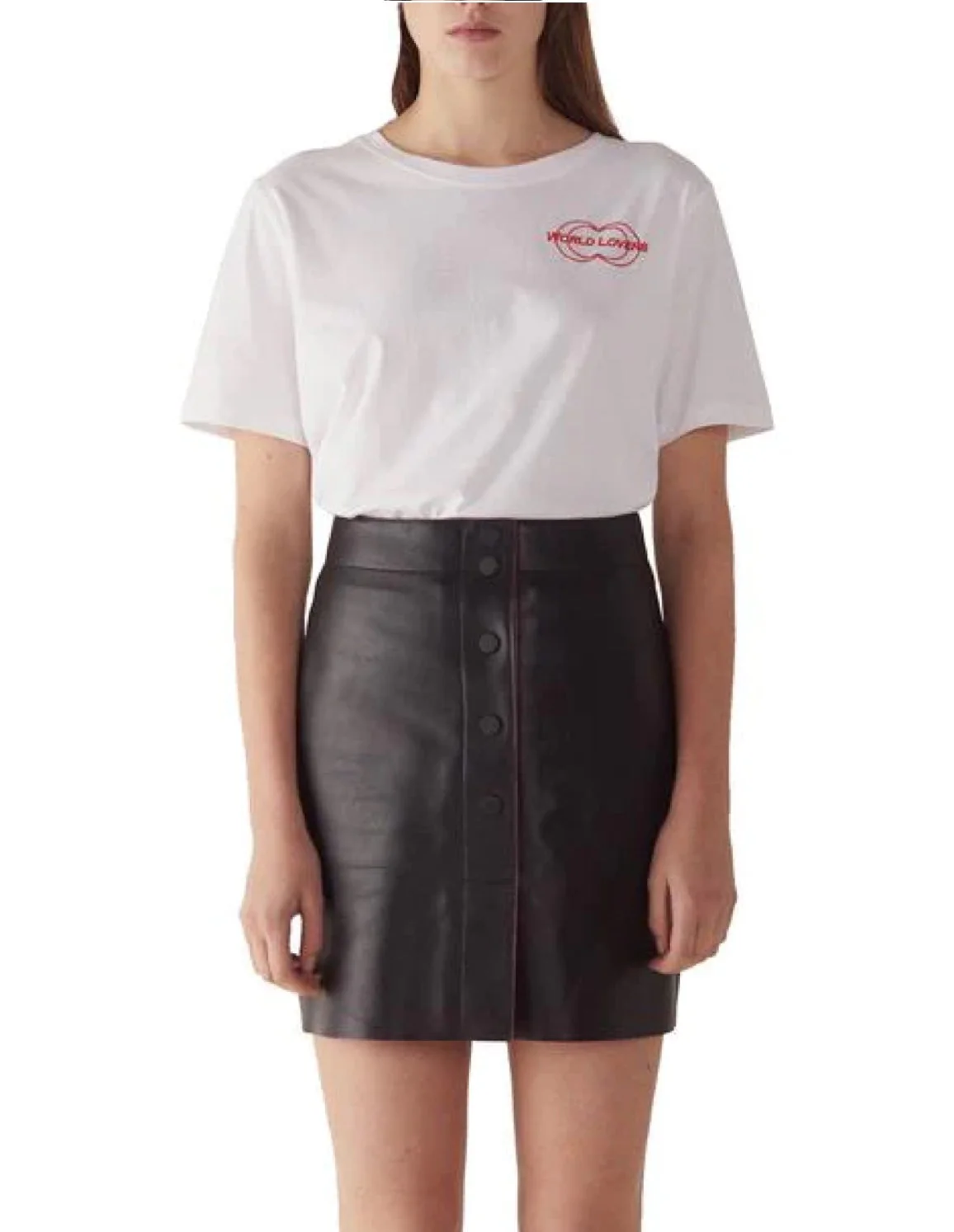 FALDA CORTA EN PIEL CON BOTONES FRONTALES. 100% PIEL BORREGO. LIMPIEZA PROFESIONAL EN TINTORERÍA. REVISAR ETIQUETA INTERNA DE LAVADO PARA MÁS INFORMACIÓN.