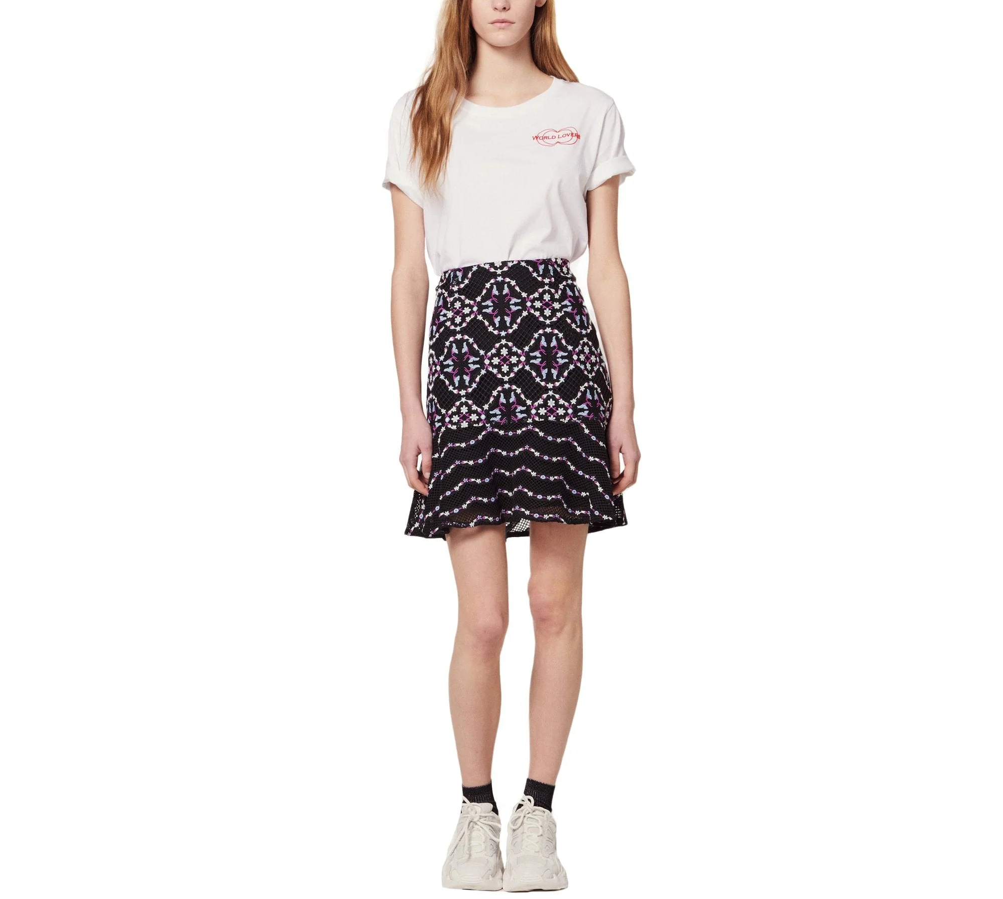 FALDA CORTA EN ENCAJE Y OLÁN, MARCA SANDRO.