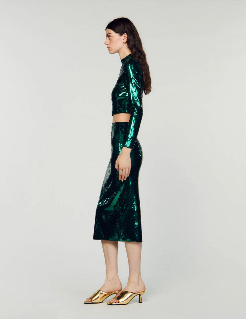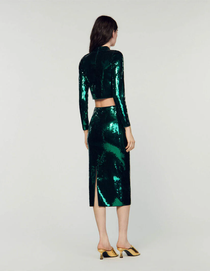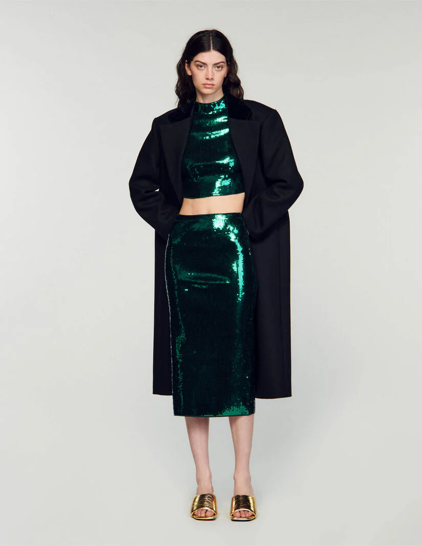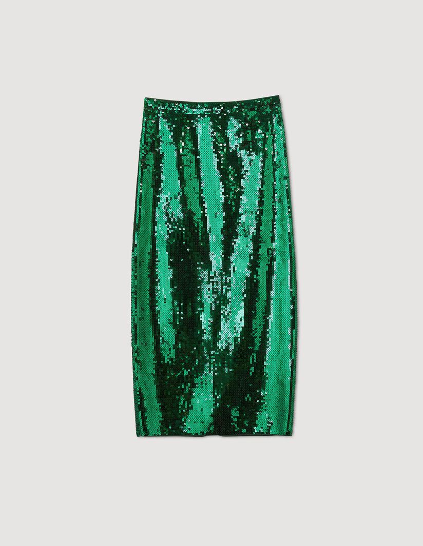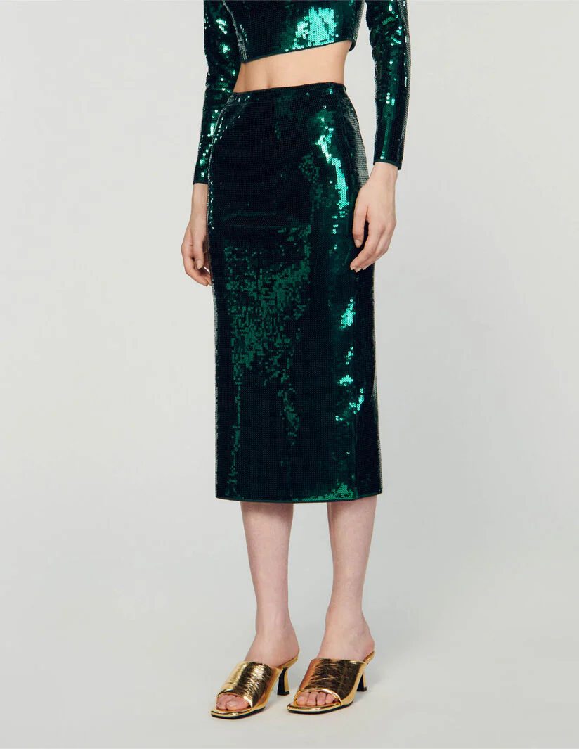 Falda semilarga de corte recto, con raja en la parte posterior, totalmente decorada con lentejuelas.• Falda semilarga Sandro Femme