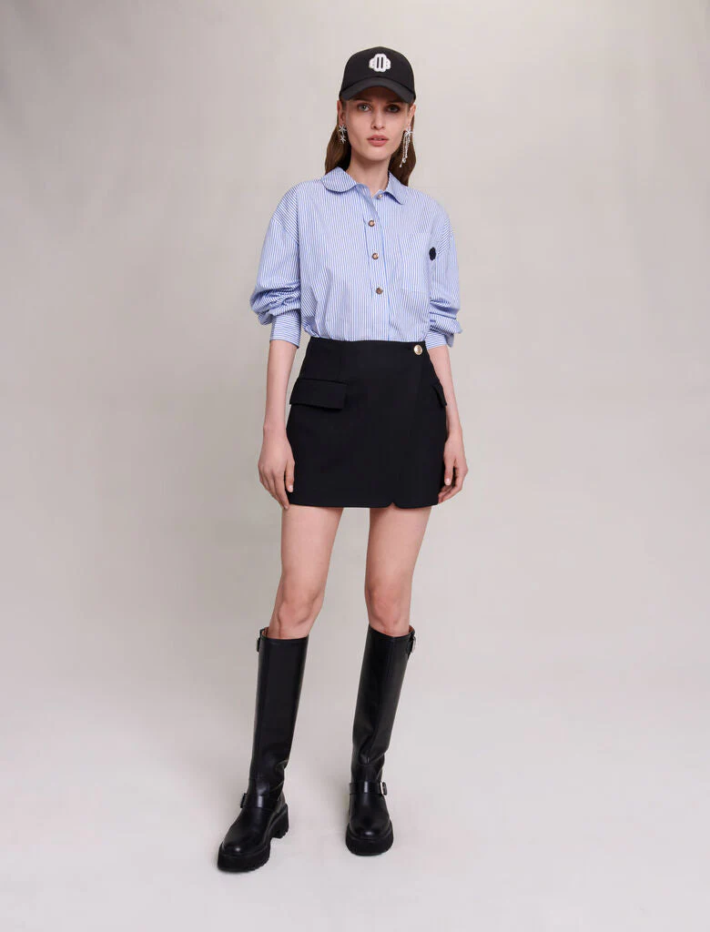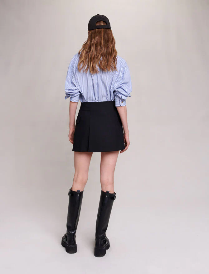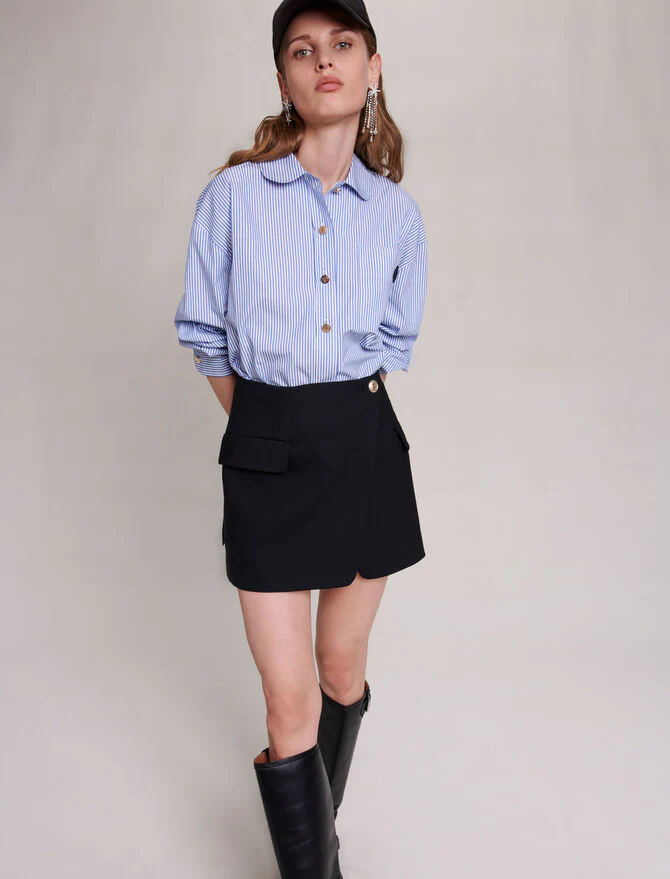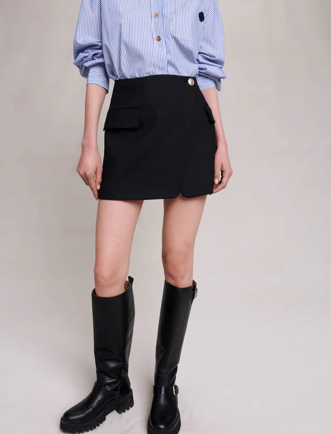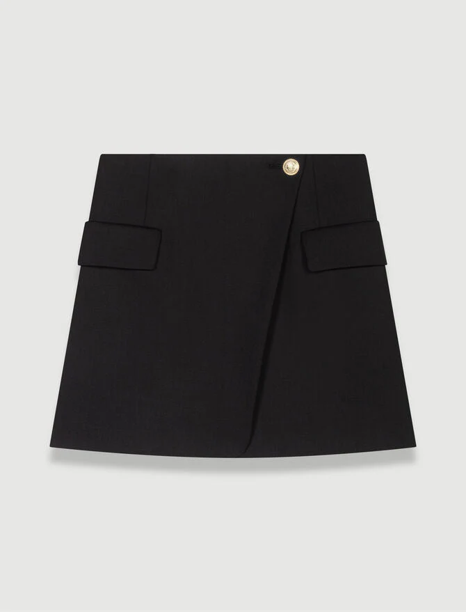 Sumérjase en el cautivador mundo urbano de la nueva colección de Maje y exprese su individualidad con piezas clásicas a las que esta temporada se les da un toque roquero.Ideal para cualquier ocasión, esta falda corta superpuesta de mezcla de lana juega con las líneas y revela un faldón asimétrico.Tiene un forro corto, dos bolsillos con solapa y un efecto de raja en la parte posterior. Decorada con un botón M de metal dorado con las siglas, dibuja una figura entallada y estructurada con elegancia.Decididamente elegante, le acompañará tanto durante el día para un atuendo informal como por la noche para un «look» de fiesta.Ref.: MFPJU01030