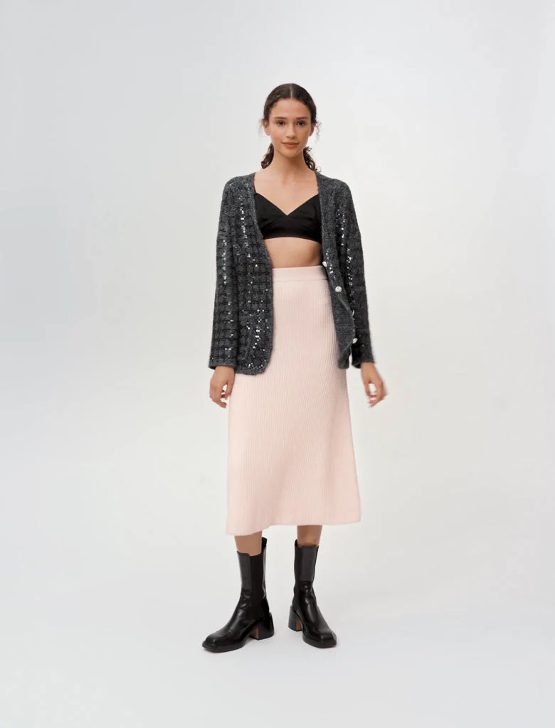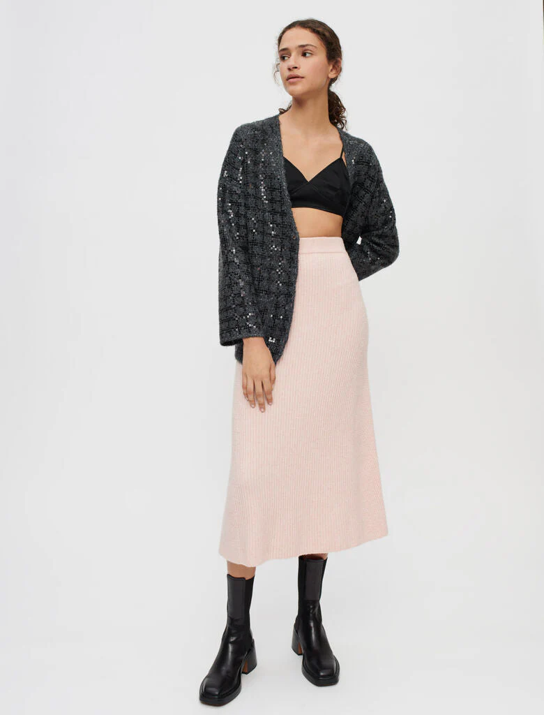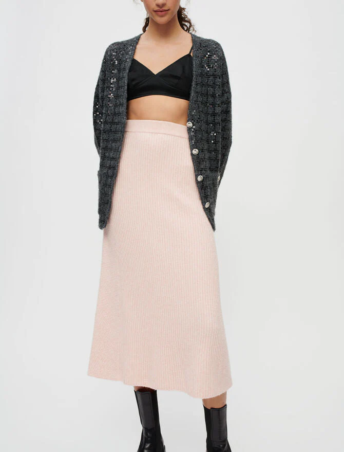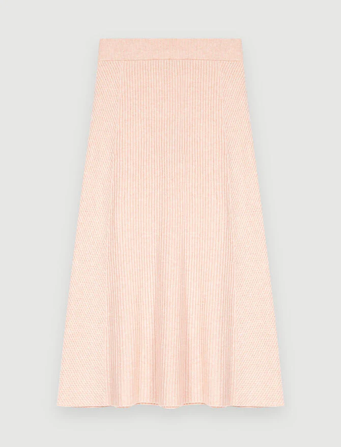 Falda midi acampanada de punto stretch grueso. Detalles de canalé. Cinturilla elástica. Puede combinarse con el jersey MANDANA. Largo: 78 cm en la talla 36.