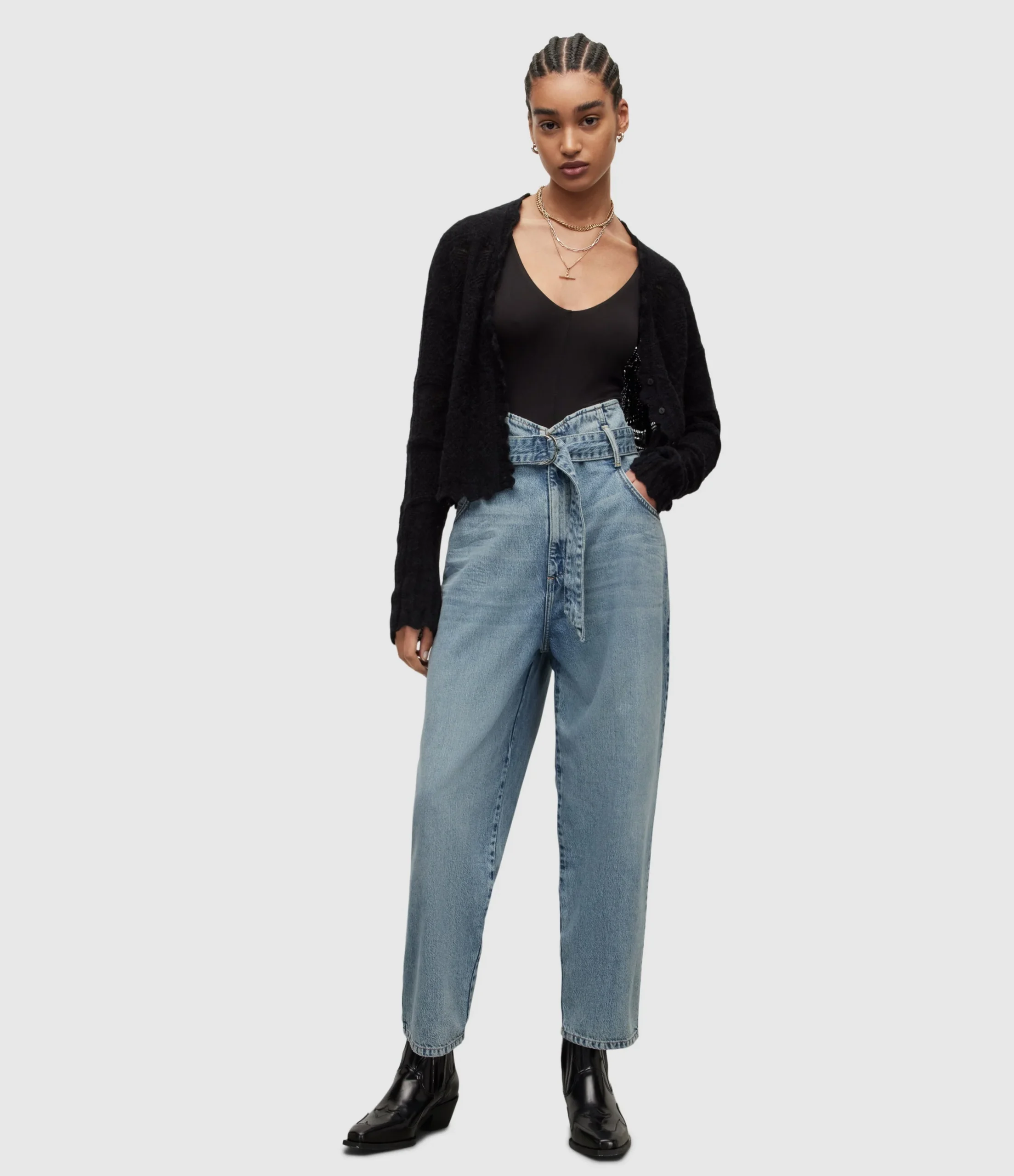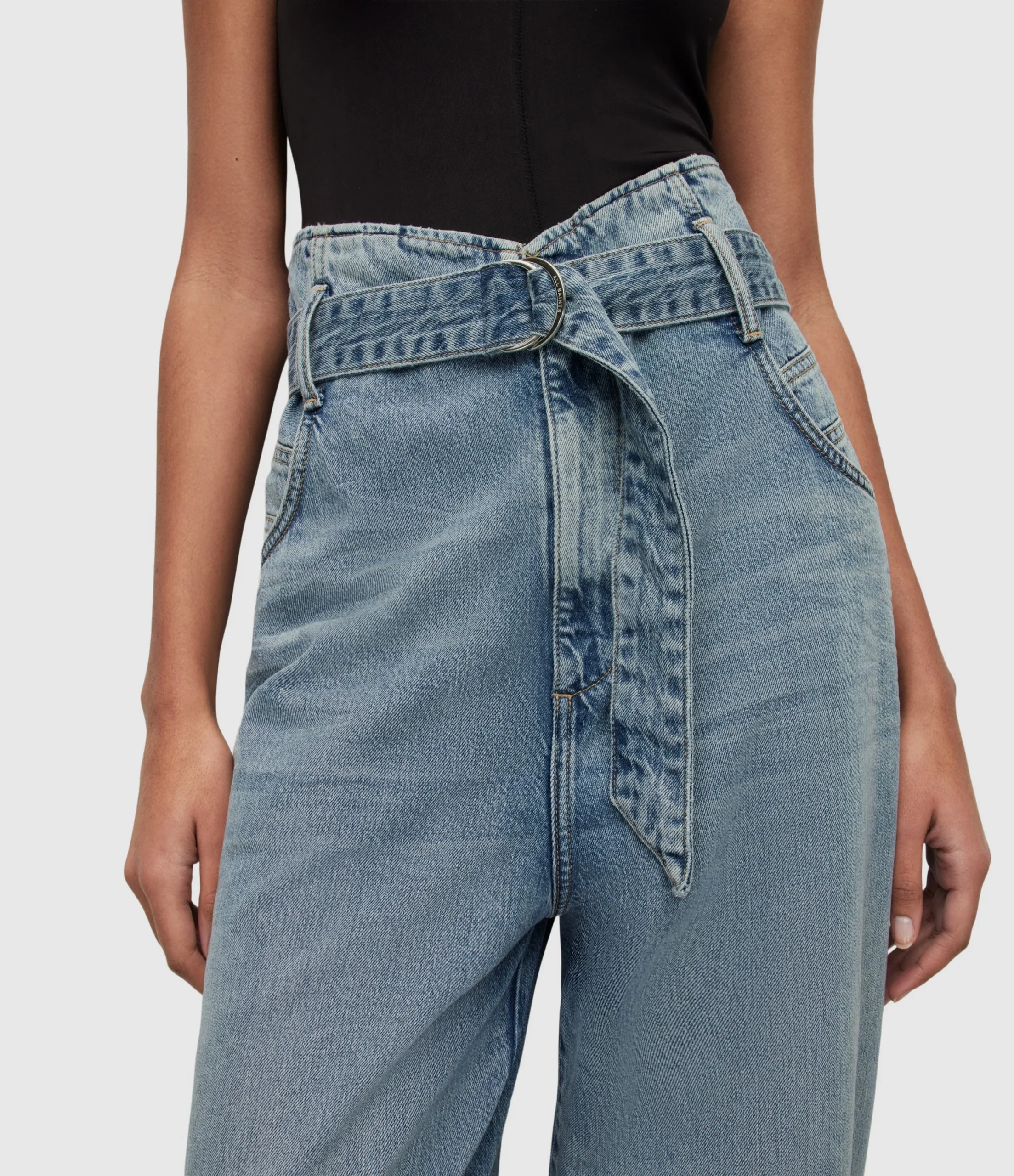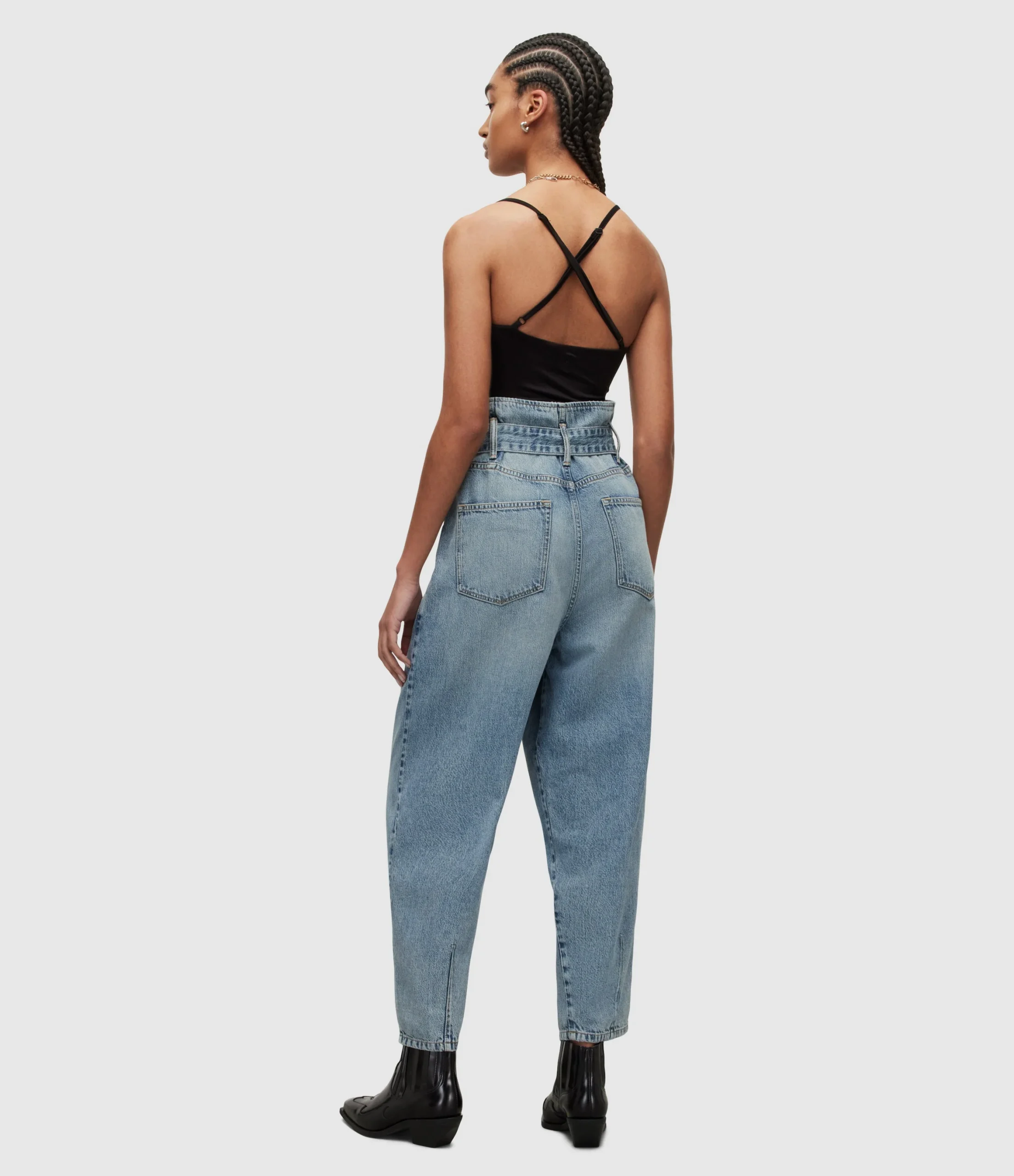 Jeans Sammy Paperbag Azul Medio para mujer, marca AllSaints. COMPOSICIÓN Y LAVADO: Consultar etiqueta interna.