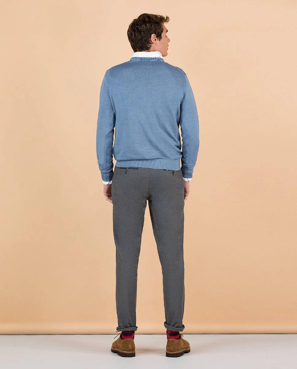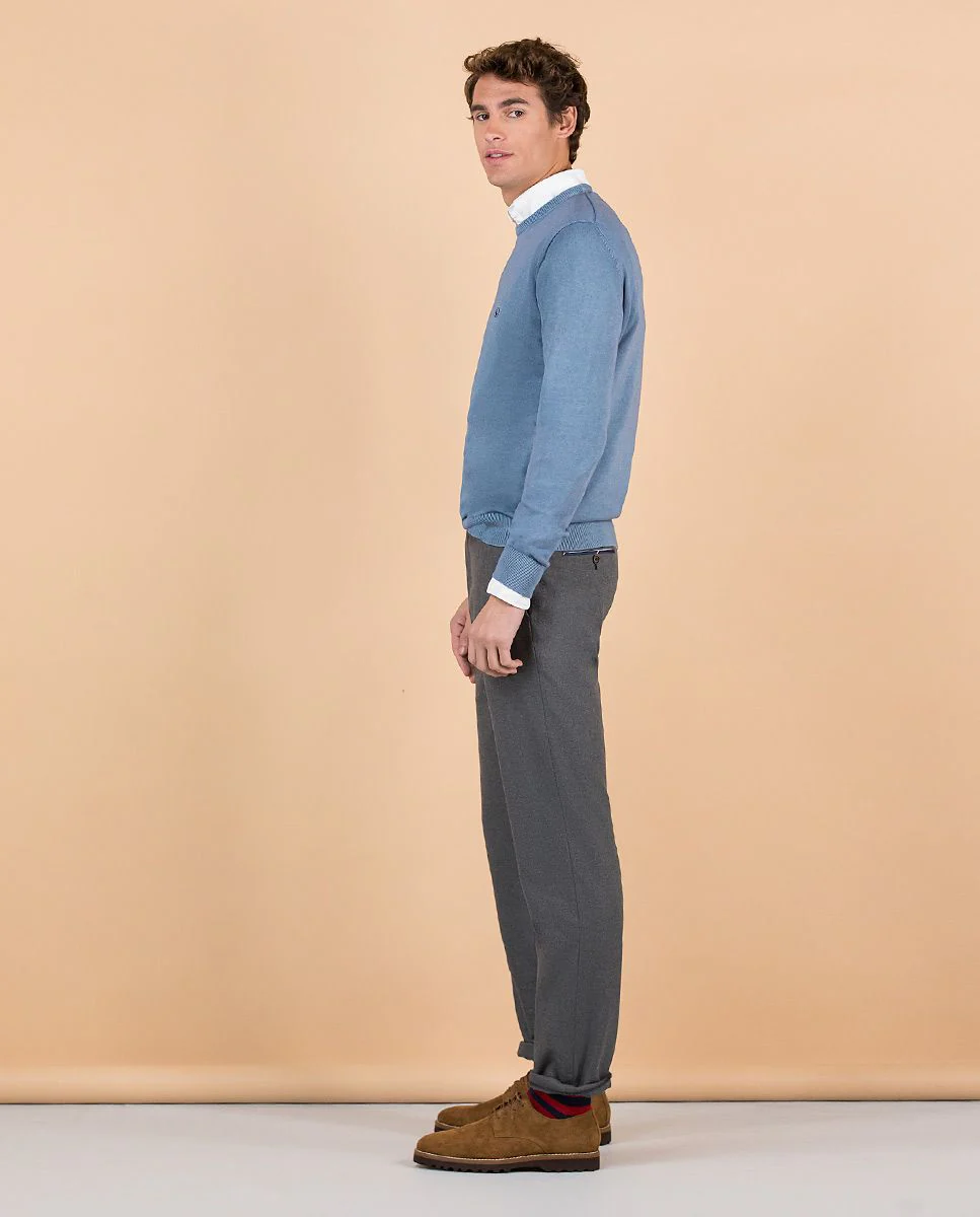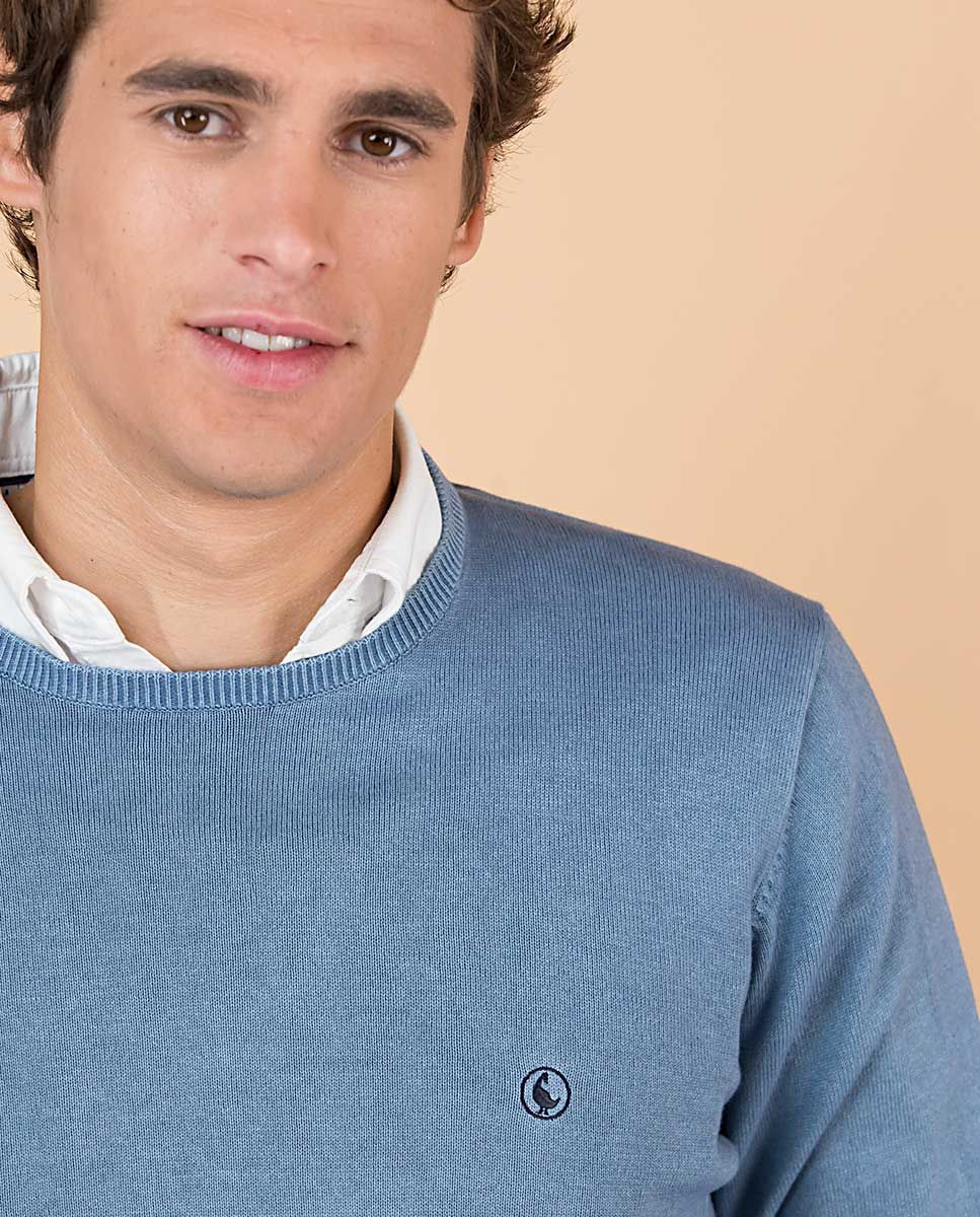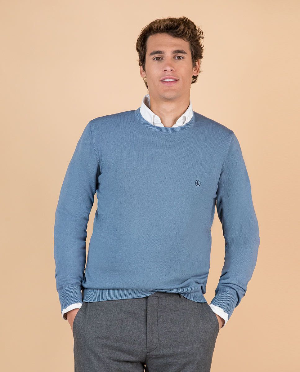 Jersey de hombre liso confeccionado en tejido 100% algodón. Ha sido tintado en prenda con pigmentos para dsarle un acabado fade out. Corte Regular Fit, cuello redondo y manga larga acabada en rib. Logo bordado en el pecho y piping interior como detalle.