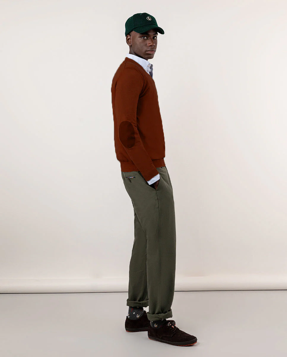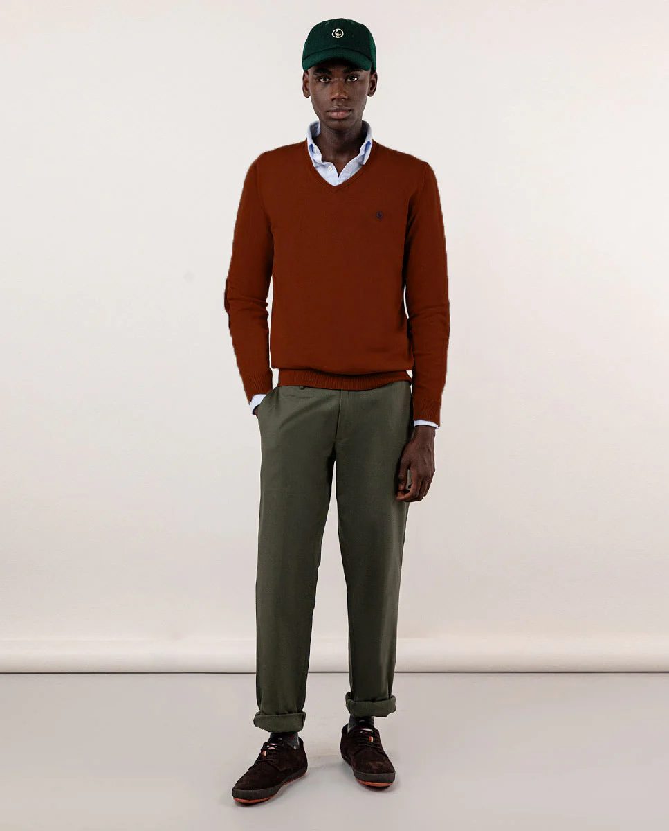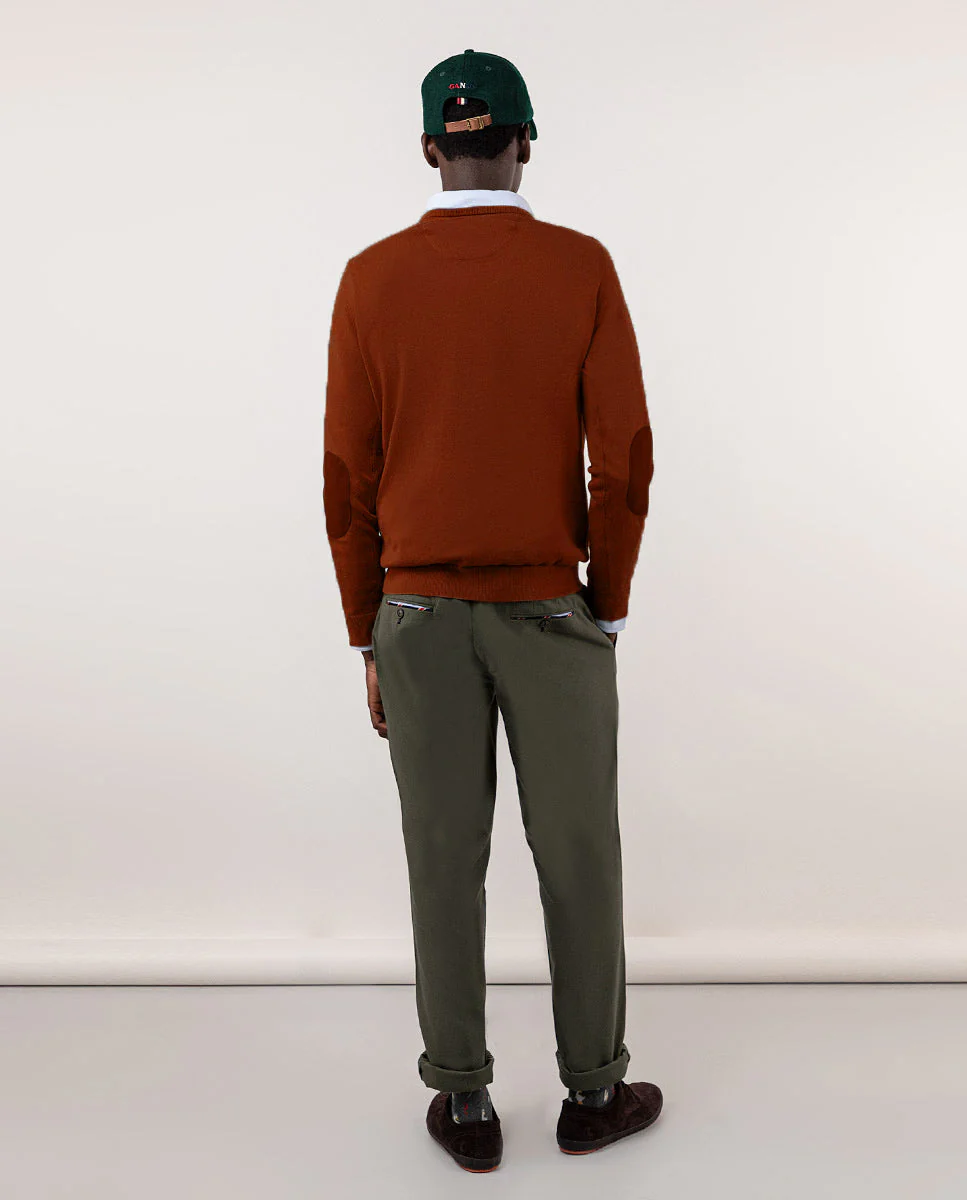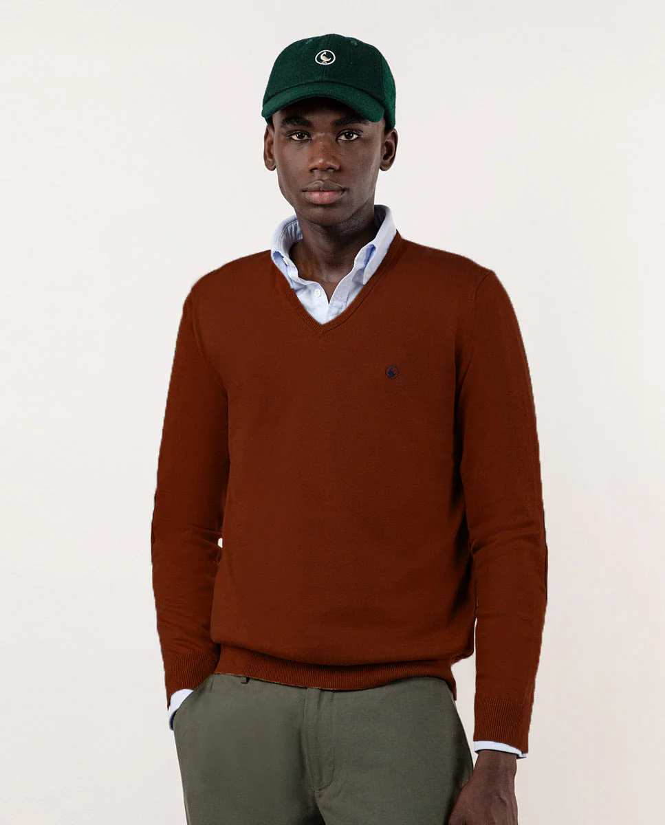 Jersey liso de hombre, fabricado en mezcla de algodón y cashmere para conseguir una calidad con mayor suavidad. Corte Regular Fit, cuello de pico y manga larga. Logo bordado en el pecho y coderas de antelina a tono Cuenta con una media luna interior de tejido oxford que aporta calidez y una cinta icónica como tapacosturas.