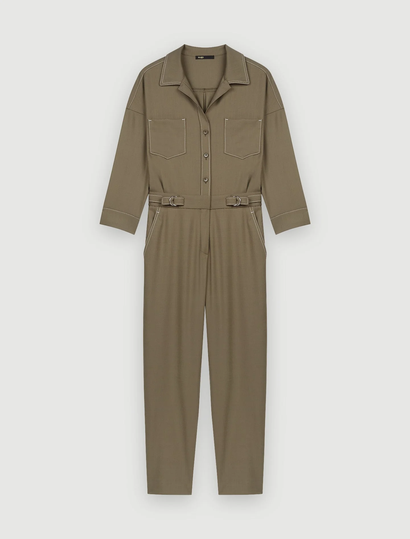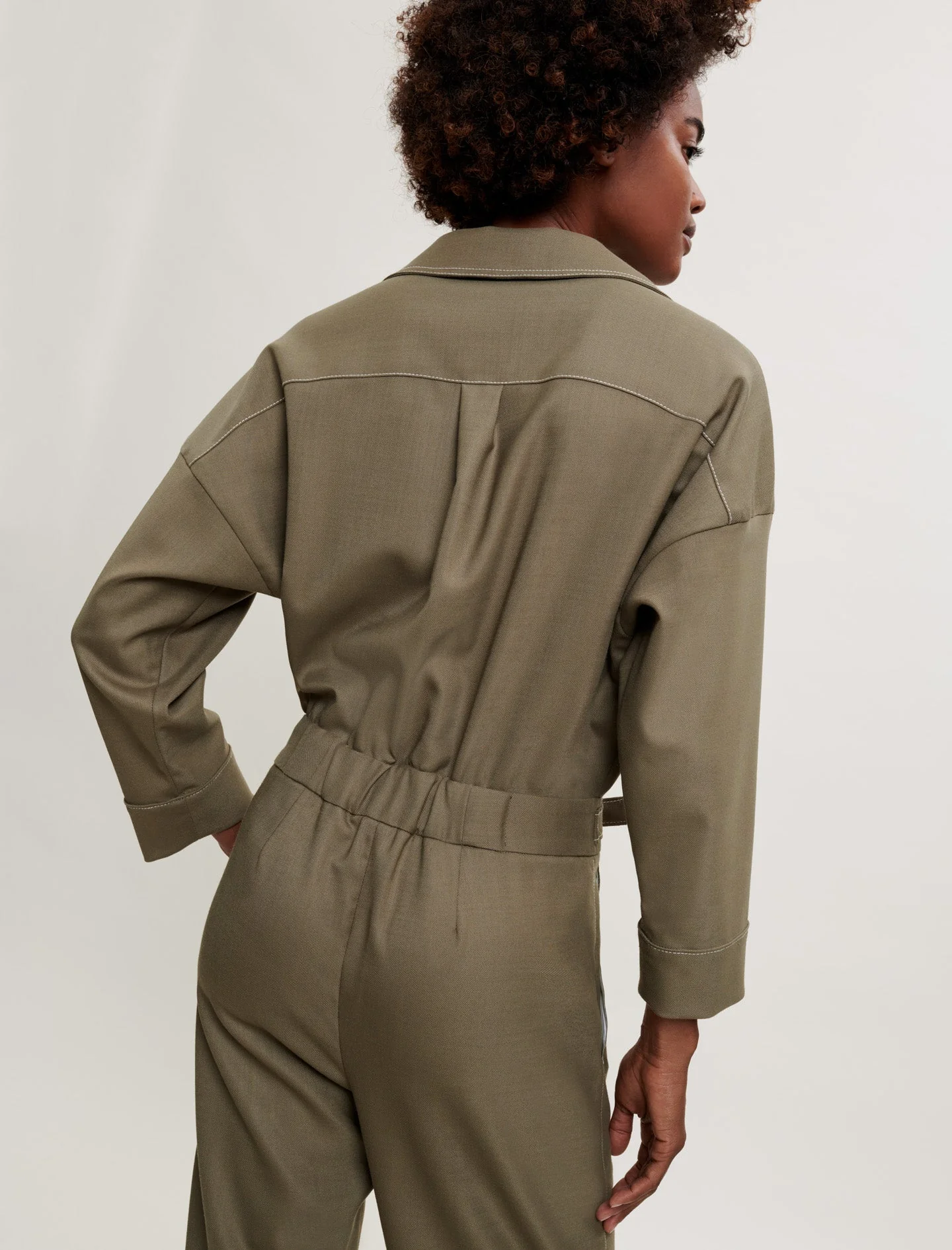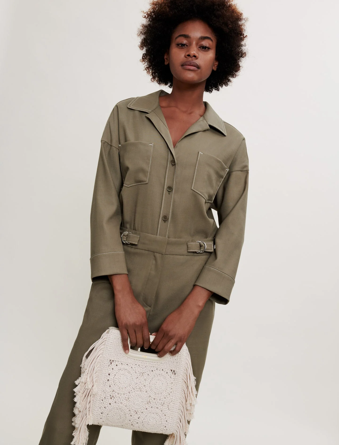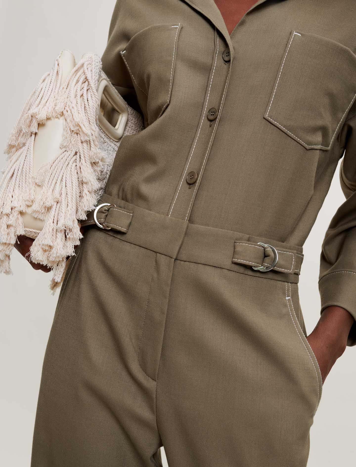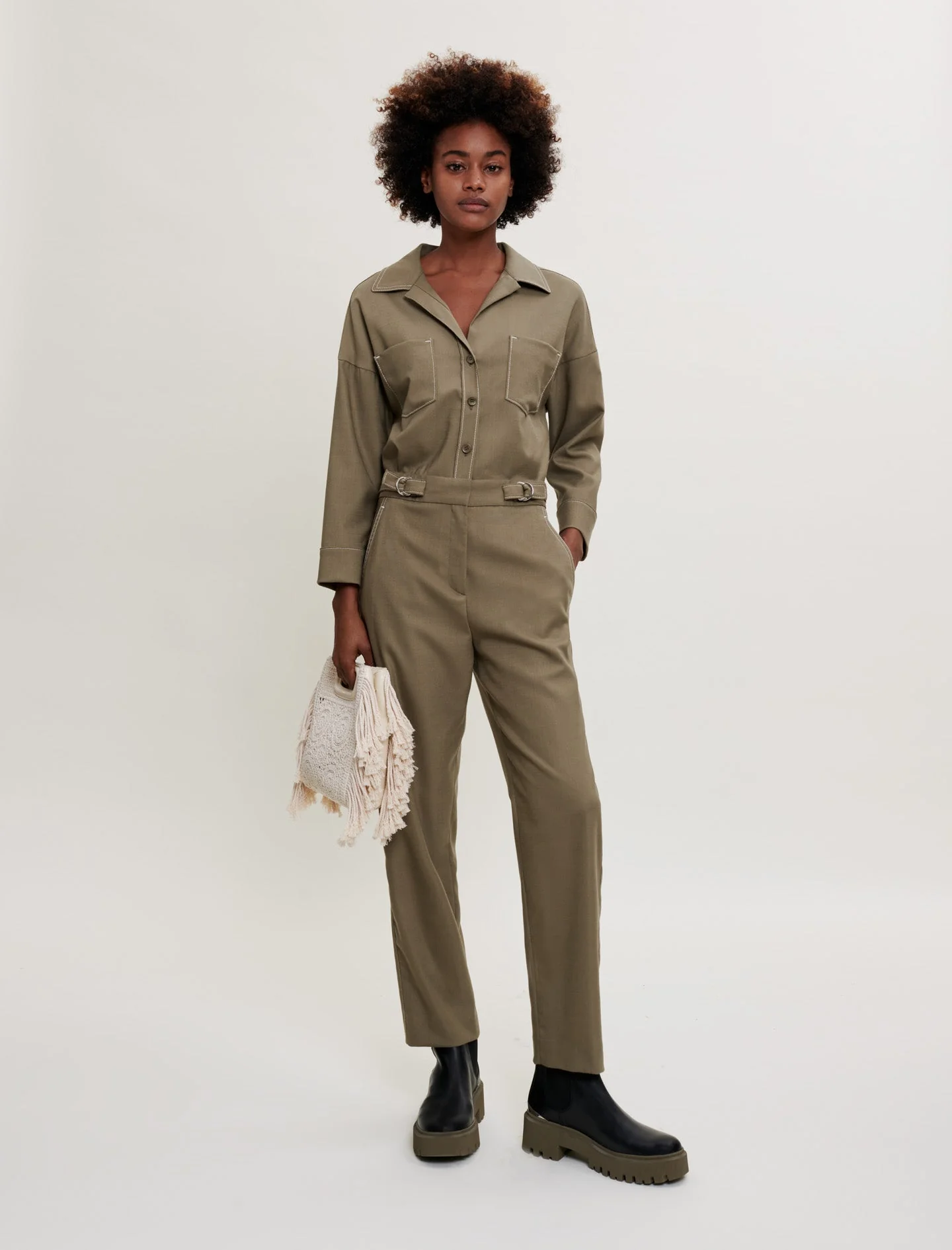 Mono largo color caqui de pierna recta. Media manga recta. Botones y cremallera ocultos en la parte delantera. Cordones en la cintura con hebillas metálicas. Cuello y abertura en el escote ajustable. Dos bolsillos pegados en el pecho.