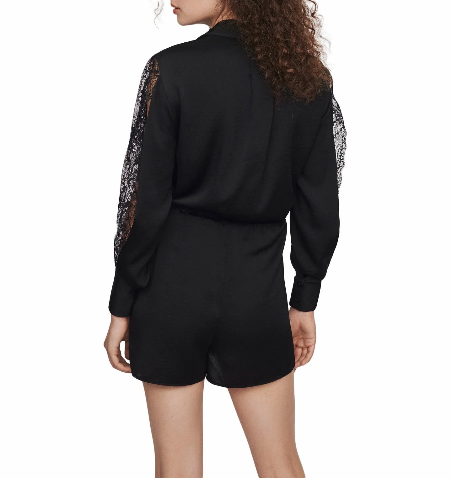 JUMPSUIT CIERRE CON BOTONES EXPUESTOS EN LA PARTE DELANTERA, CUELLO EN V, MANGAS LARGAS ABIERTAS, PUÑOS ABOTONADOS, INSERCIONES DE ENCAJE FLORAL TRANSPARENTE, CINTURILLA ELÁSTICA, BOLSILLOS LATERALES, MARCA MAJE. 100% POLIÉSTER. LAVADO A MANO.