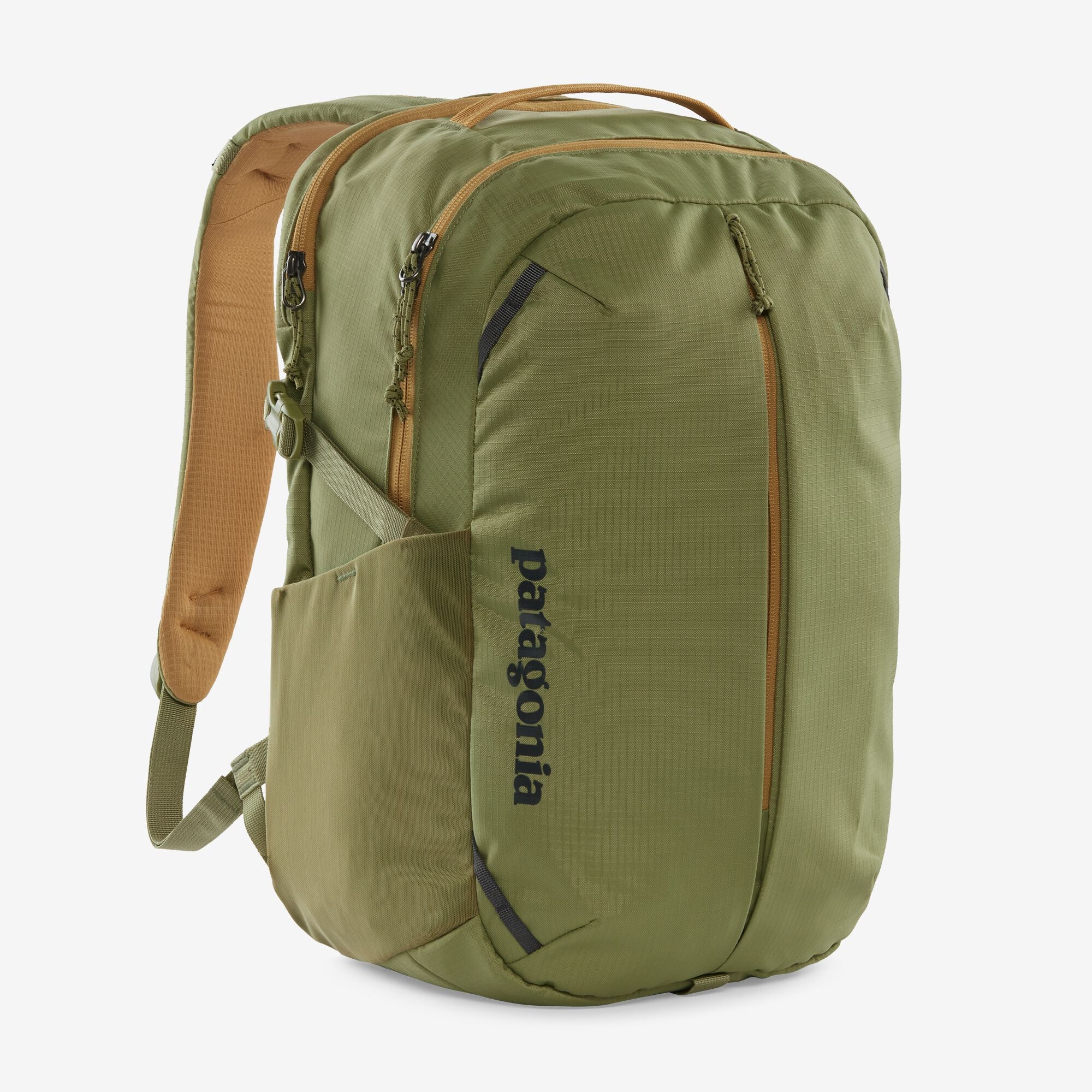 Para resistir una humedad suave, esta mochila de 26-litros tiene un acabado DWR sin PFC (capa duradera repelente al agua sin químicos perfluorados); todas las telas son de poliéster 100% reciclado excepto la malla elasticada en los bolsillos laterales, la que es de una mezcla de 84% nylon reciclado/16% spandex