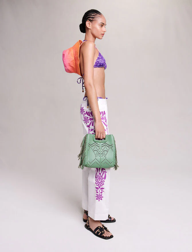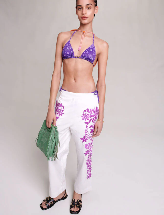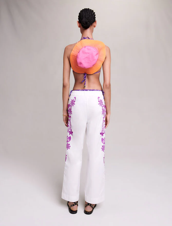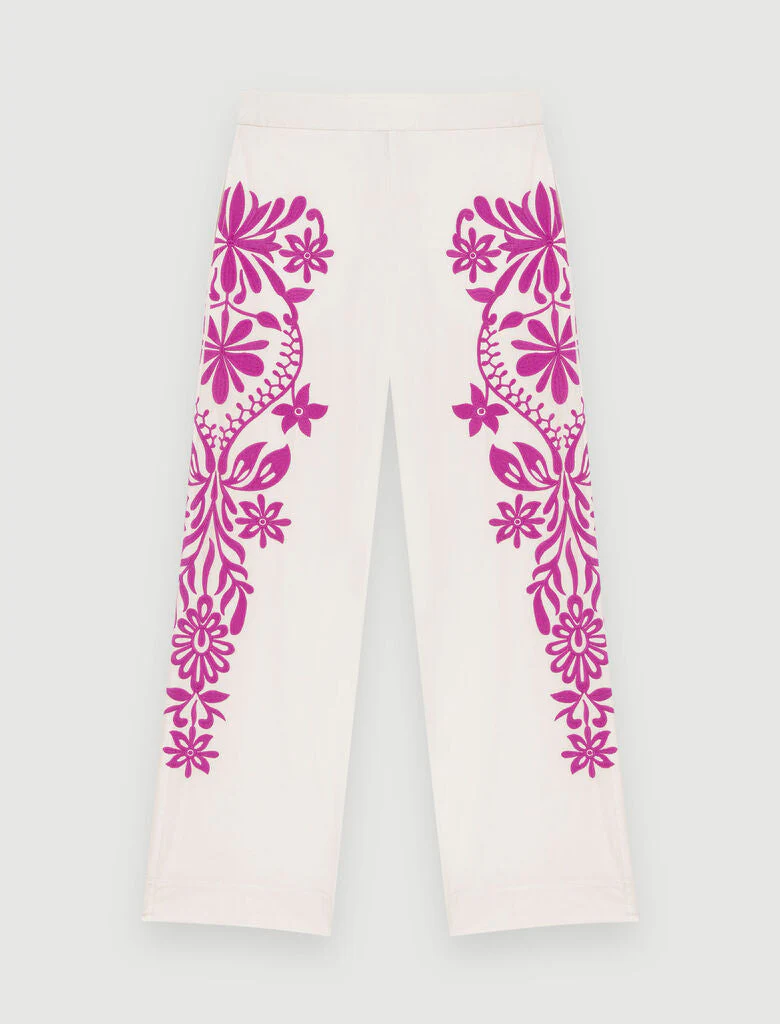 Con el verano a la vuelta de la esquina, Maje presenta su exclusiva colección cápsula «Tropical Purple», una línea exótica y llena de color.Rumbo a Miami: esta colección de inspiración tropical en tonalidades violetas apuesta por los bordados florales y el estampado paisley. Viene repleta de prendas con carácter de cortes amplios, tejidos ligeros y combinaciones atrevidas para disfrutar al máximo de la mejor época del año.Este pantalón de algodón suave de corte amplio y vaporoso presenta flores bordadas en contraste. Es una prenda estrella de la temporada que puede llevarse como total look con la camisa a juego o con un bañador estampado para crear un look playero a la última. Gracias a su cinturilla elástica, es muy fácil de poner.Añade un toque de color con accesorios con carácter como un bolso exclusivo o las joyas de la colaboración Maje x éliou.Ref.: MFPPA00521