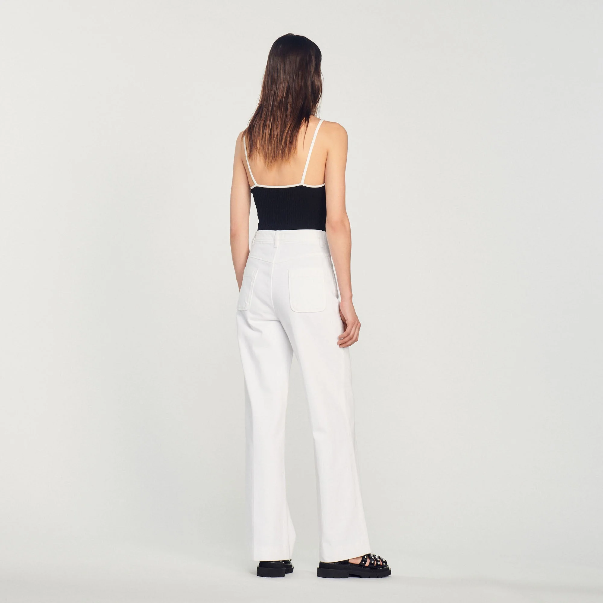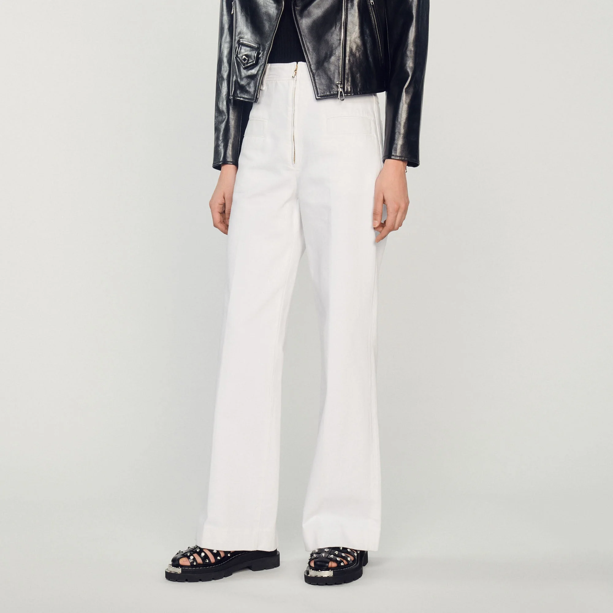 Pantalón de talle alto y pernera ancha de tela, con anchos bolsillos de ojal en la parte delantera y bolsillos de parche en la parte trasera.