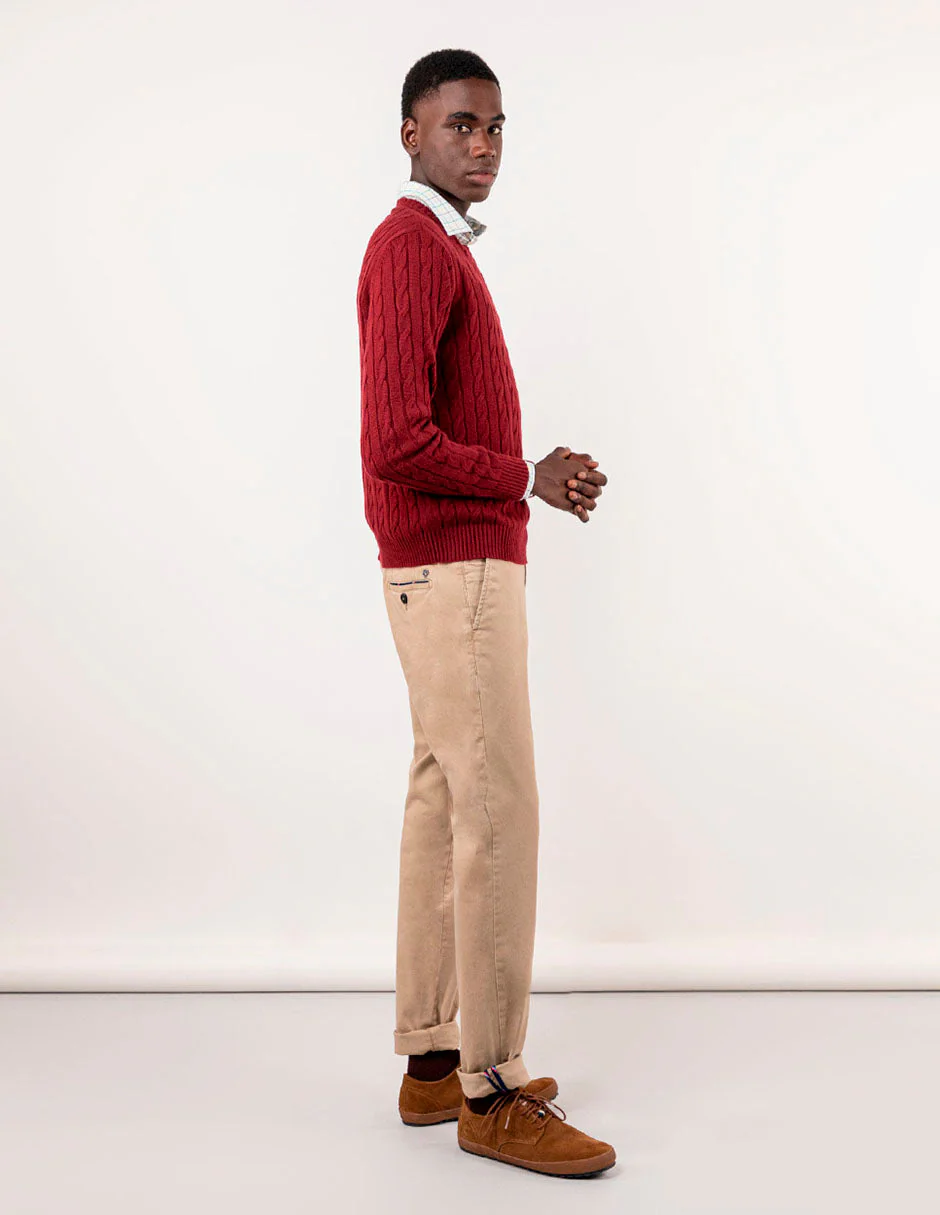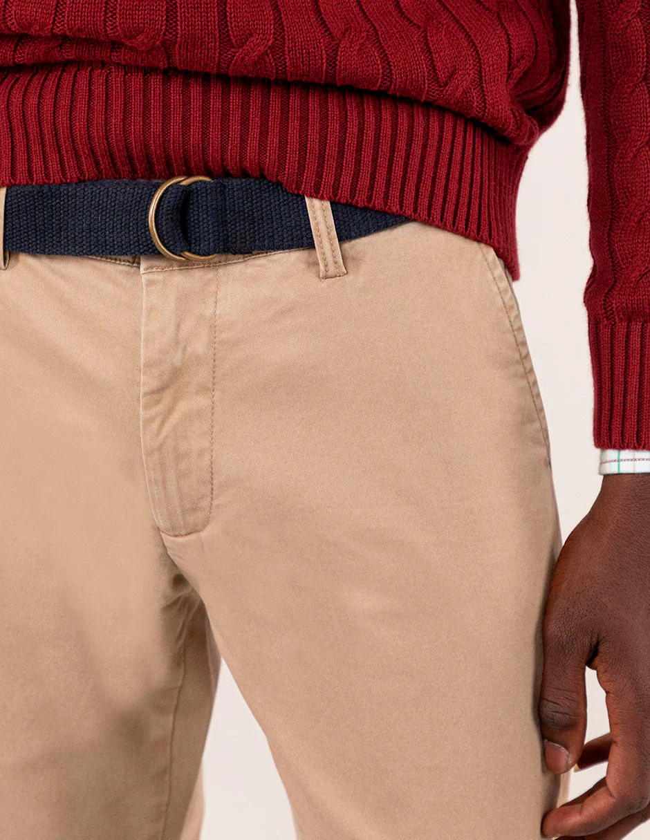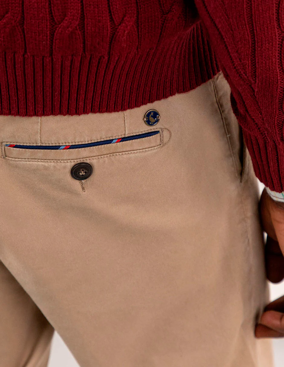 Pantalón chino de hombre confeccionado en tejido gabardina con 78% algodón, 20% de algodón reciclado y 2% elastano. Lleva un proceso de tintado que le da un aspecto desgastado. Corte Slim Fit, cierre mediante cremallera oculta por tapeta y botón. Tiene bolsillos delanteros y en los traseros lleva vivo en tejido principal con un piping de tejido corbatero. Lleva también como detalle en el bolsillo cerillero un piping del mismo tejido corbatero. Tiene el chapón del logo cosido encima del bolsillo trasero. Incluye cinturón de canvas.