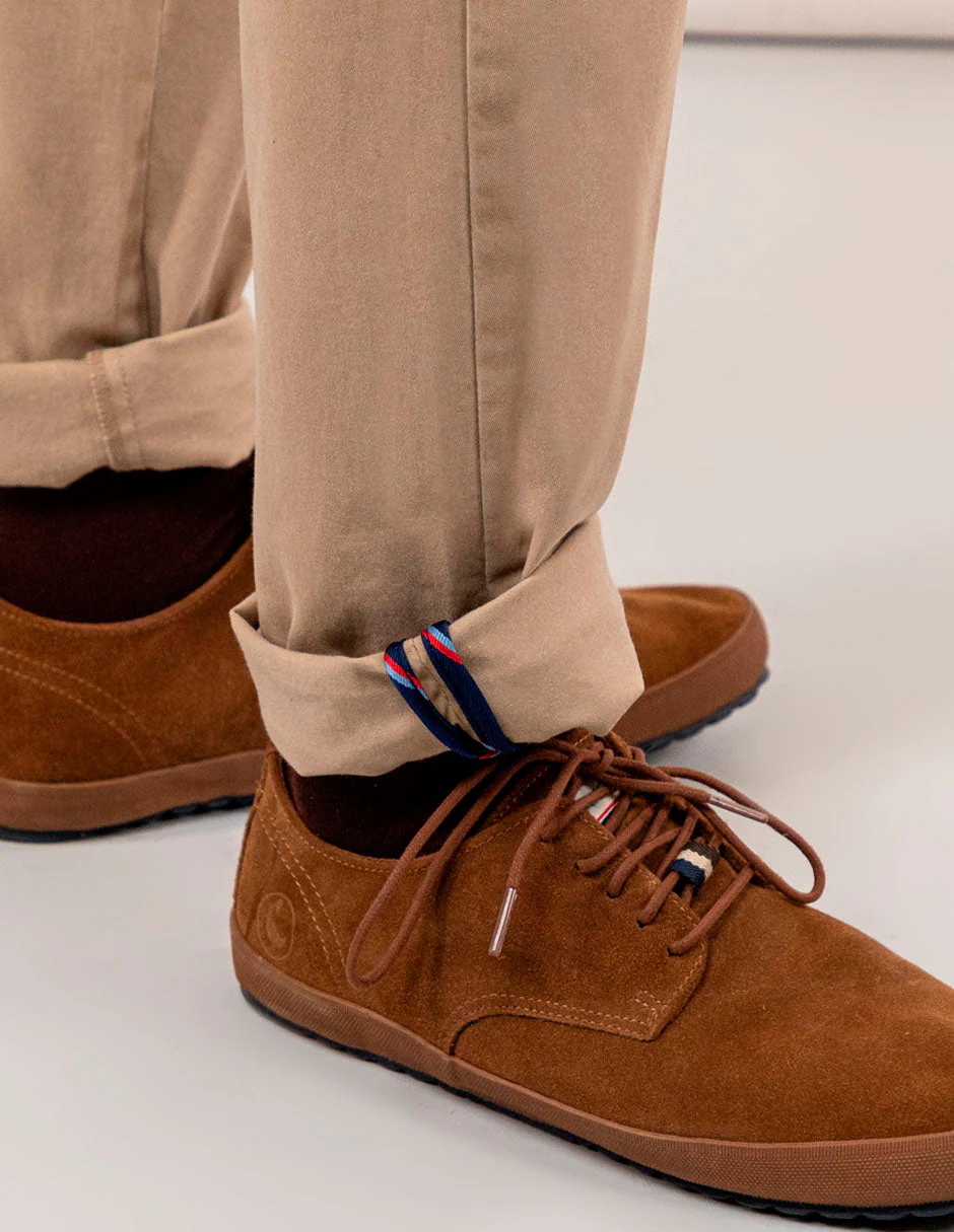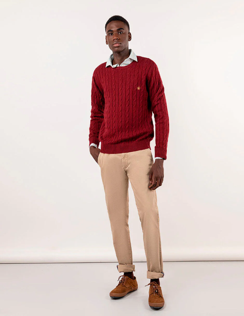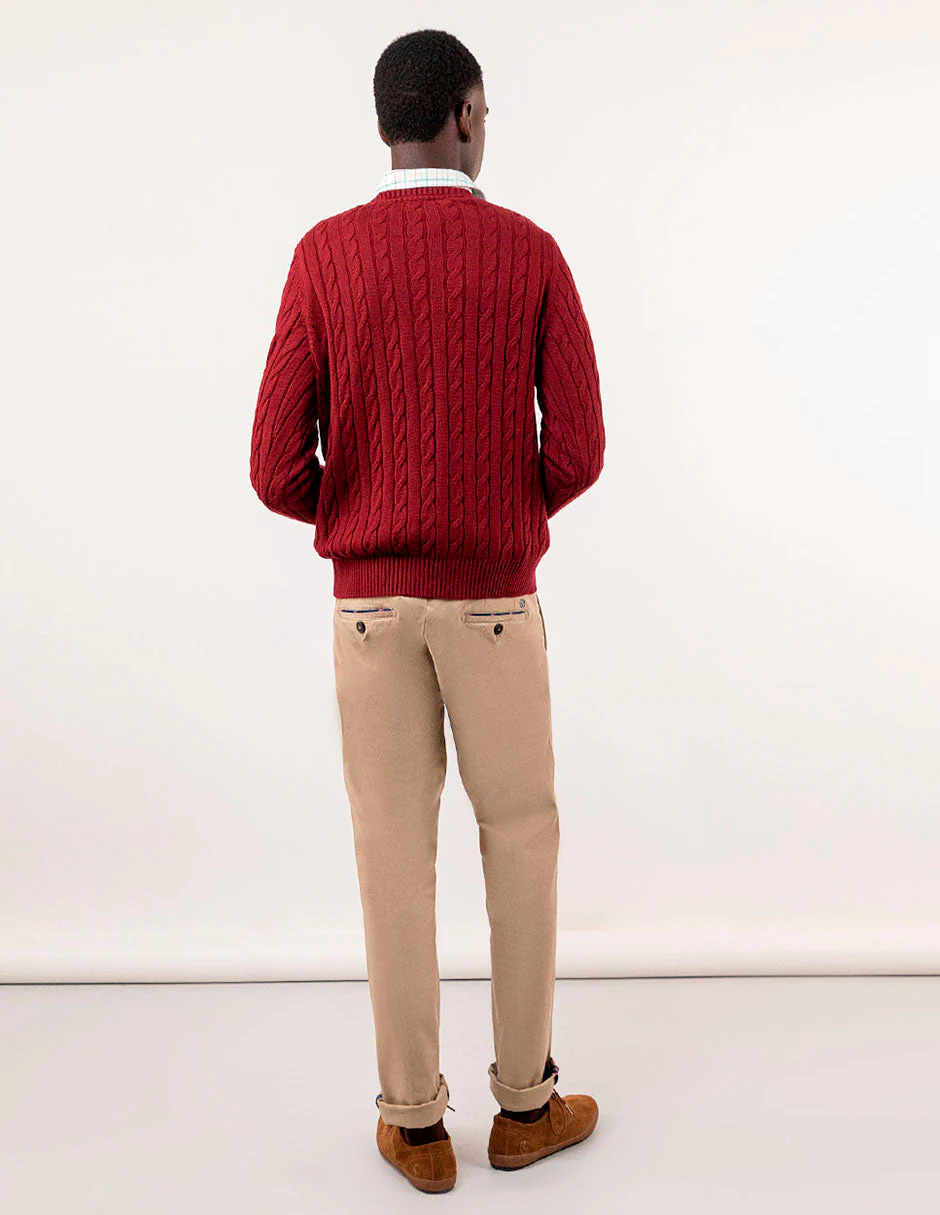 Pantalón chino de hombre confeccionado en tejido gabardina con 78% algodón, 20% de algodón reciclado y 2% elastano. Lleva un proceso de tintado que le da un aspecto desgastado. Corte Slim Fit, cierre mediante cremallera oculta por tapeta y botón. Tiene bolsillos delanteros y en los traseros lleva vivo en tejido principal con un piping de tejido corbatero. Lleva también como detalle en el bolsillo cerillero un piping del mismo tejido corbatero. Tiene el chapón del logo cosido encima del bolsillo trasero. Incluye cinturón de canvas.