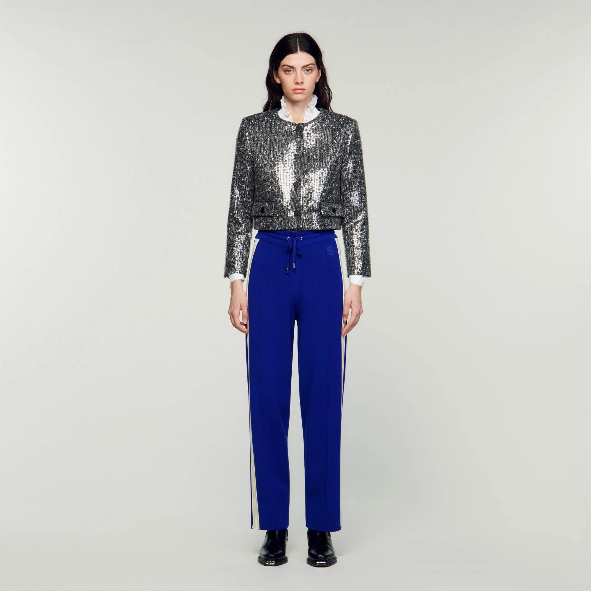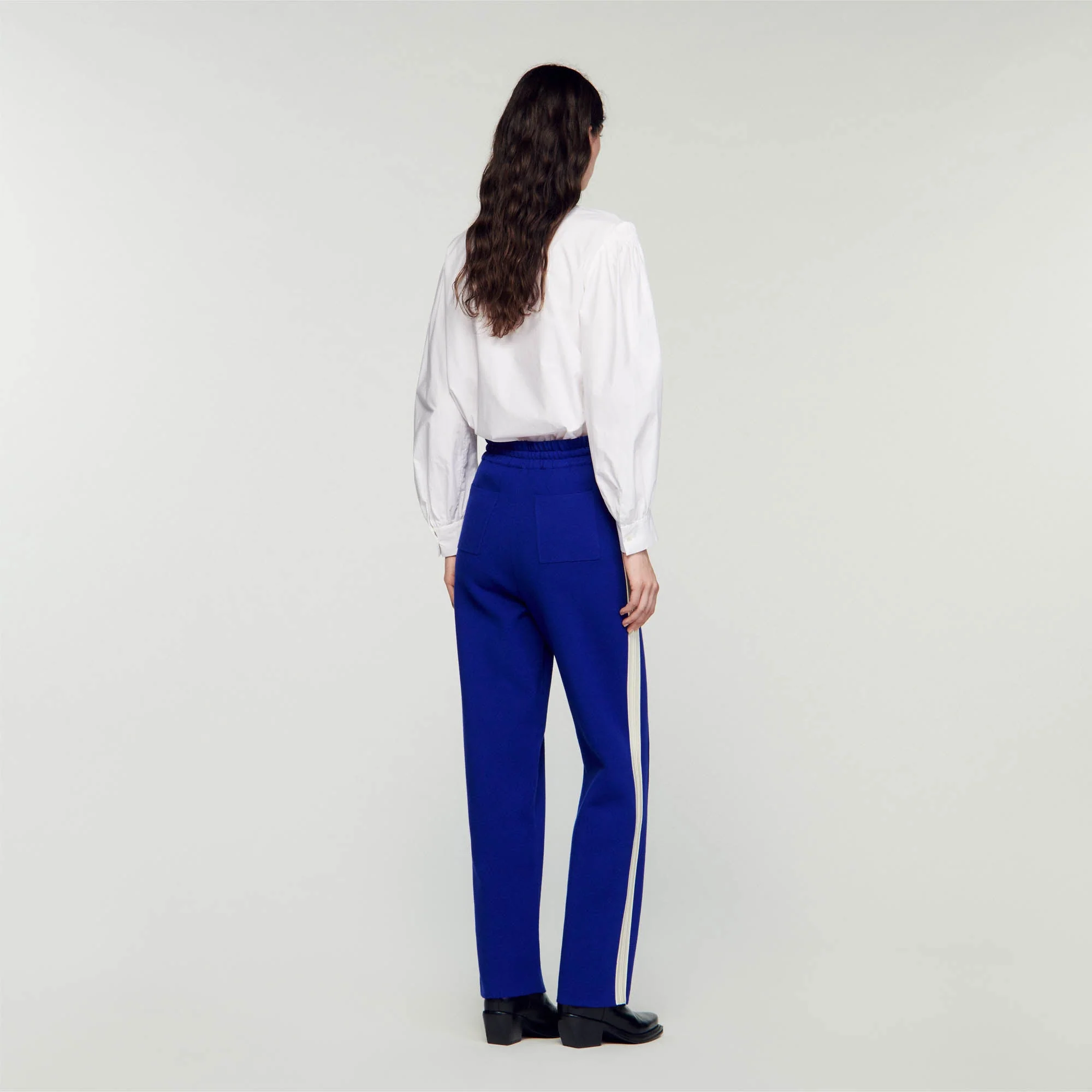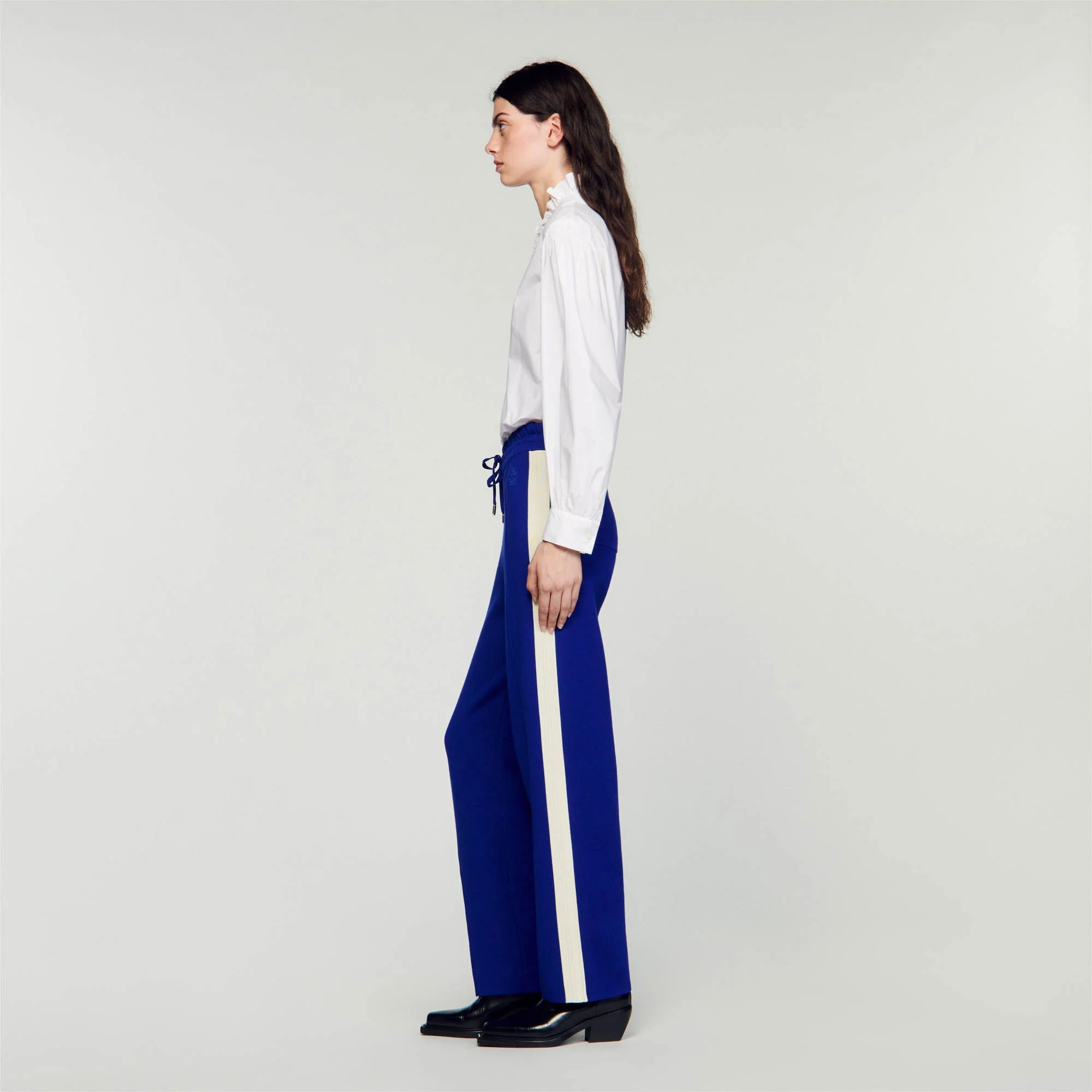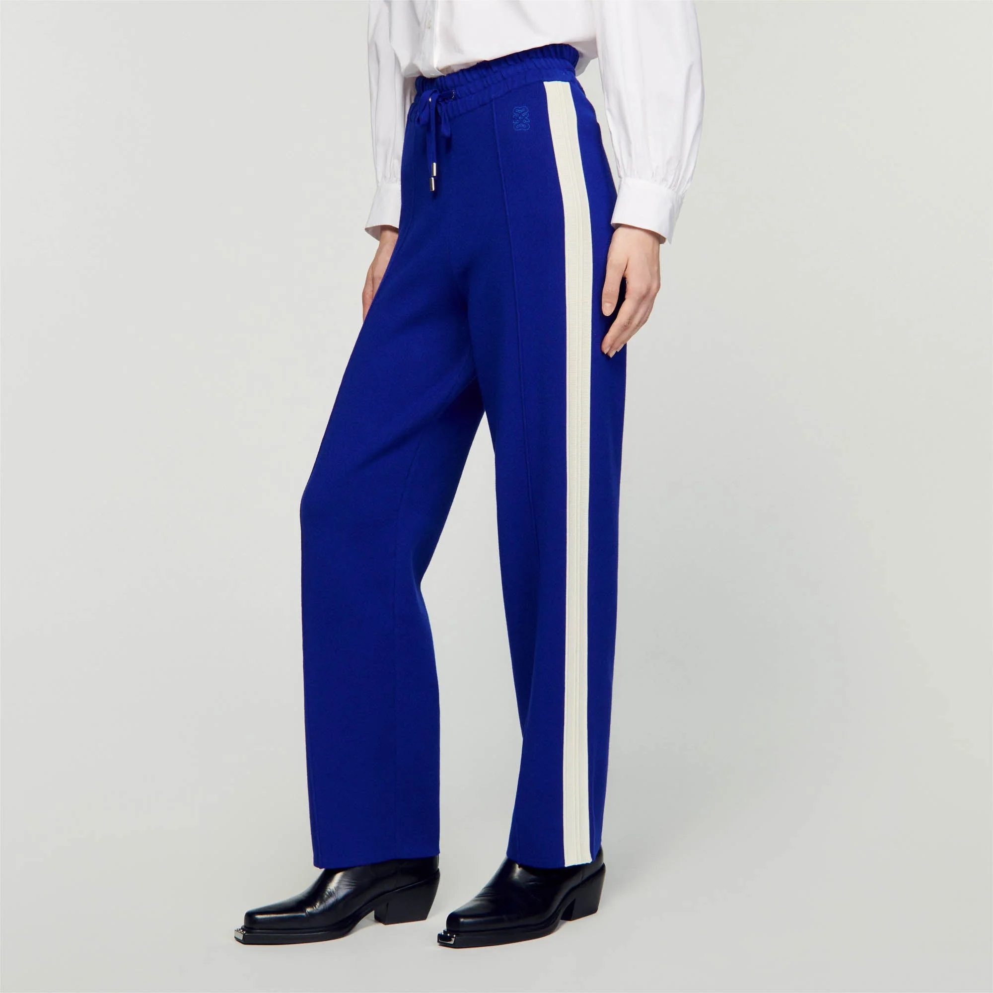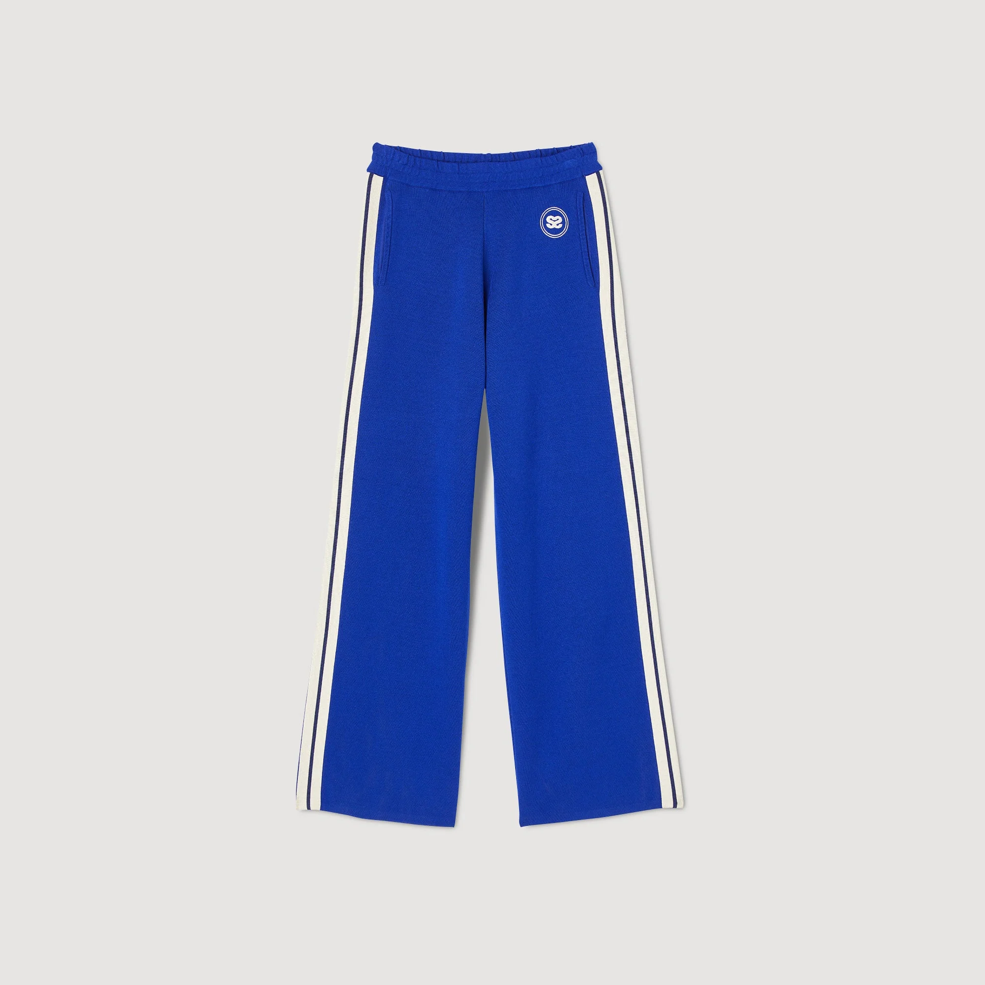 Pantalón de chándal de punto de corte recto con cintura elástica y cordones de ajuste, decorado con rayas en contraste a los laterales y bordado Multi S en el lateral.• Pantalón de chándal Sandro Femme