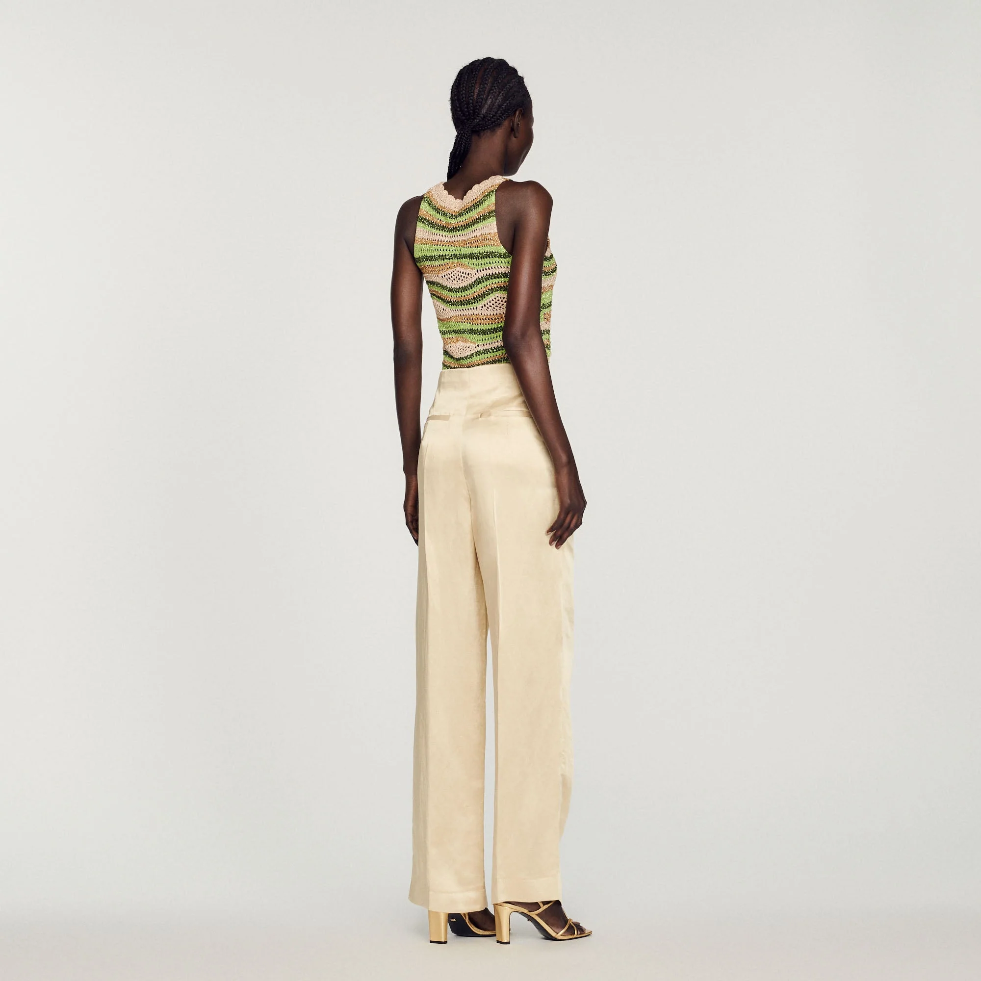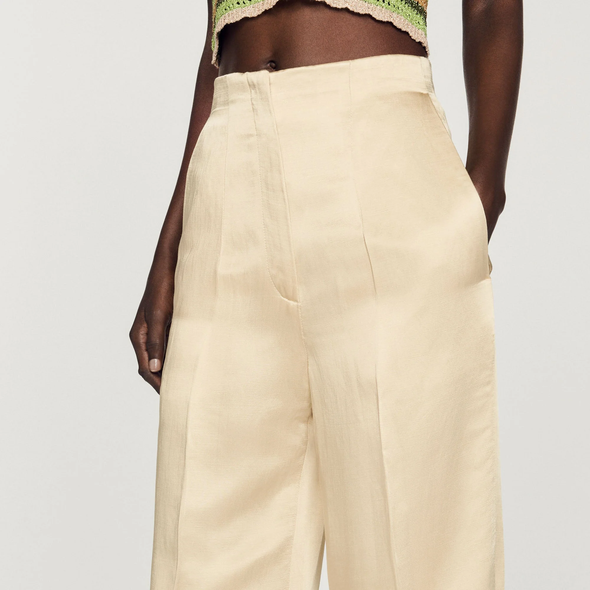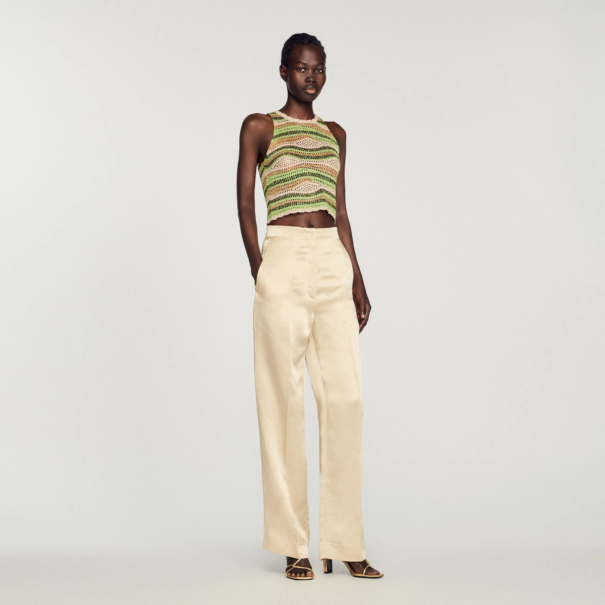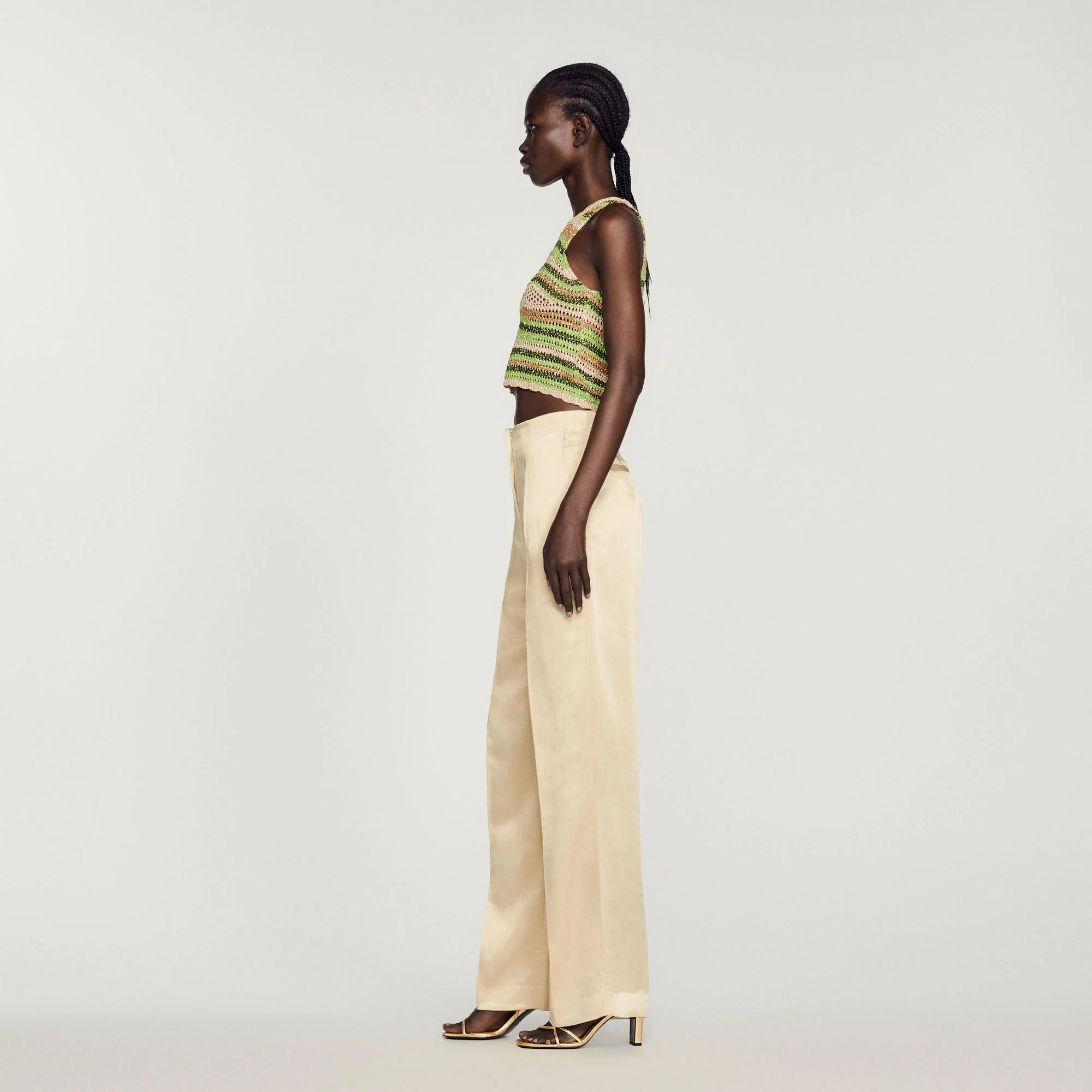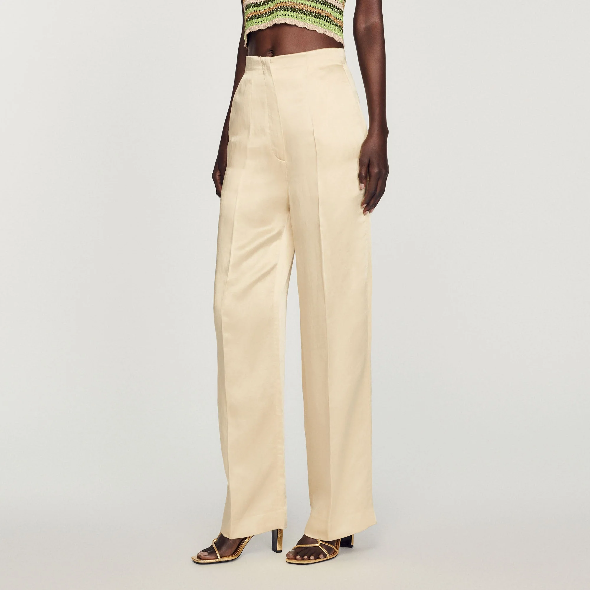 Pantalón de talle alto con pliegues estirados, con bolsillos italianos en la parte delantera y bolsillos de ojal en la parte trasera.• Pantalón efecto satinado Sandro de mujer
