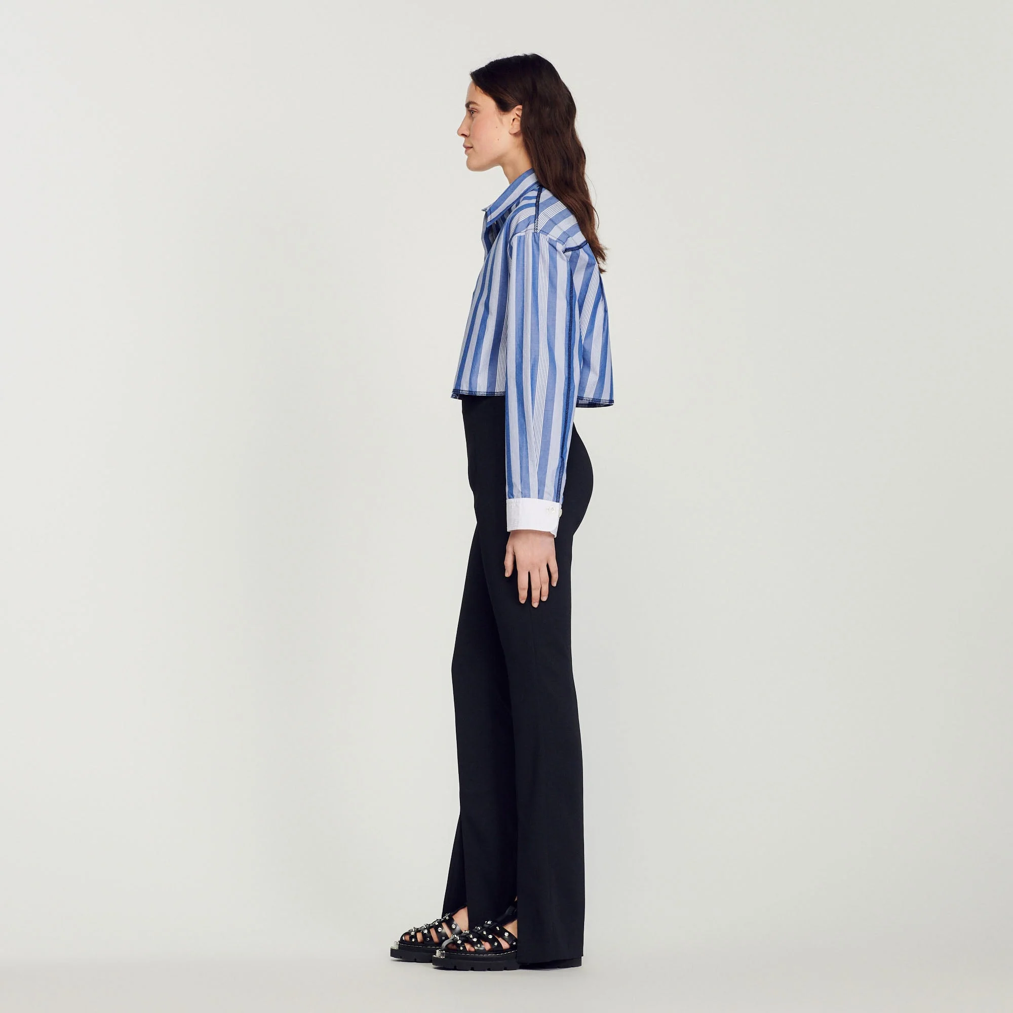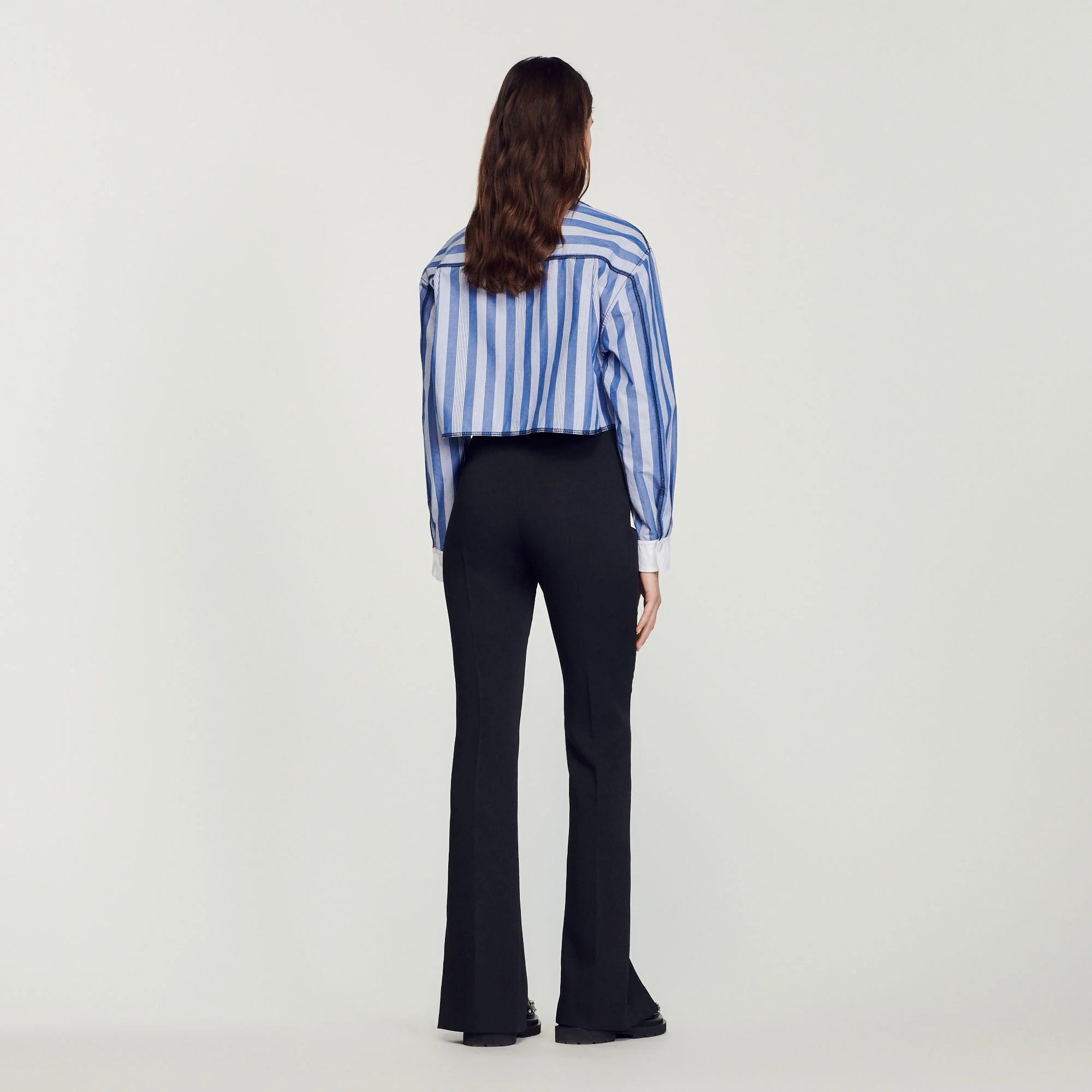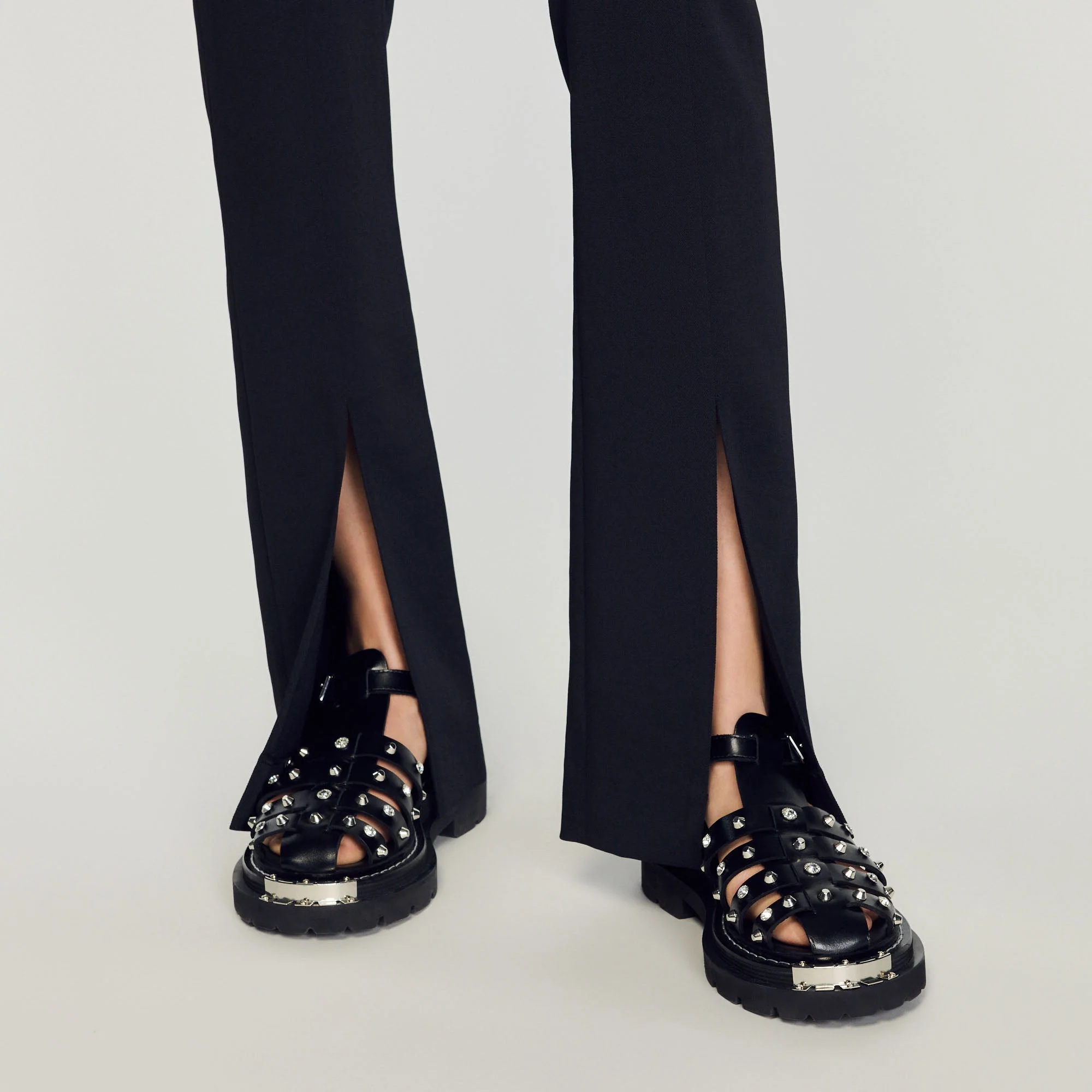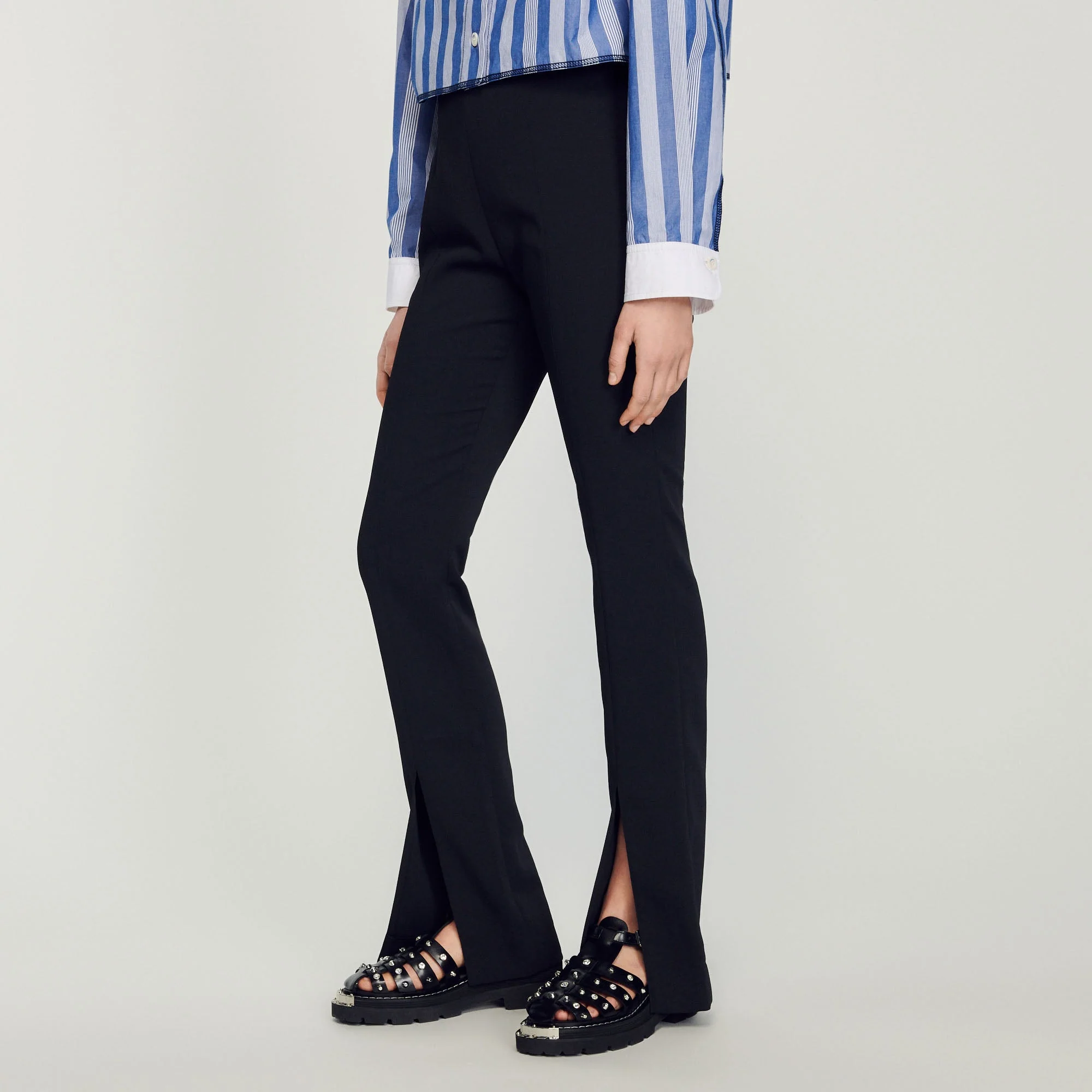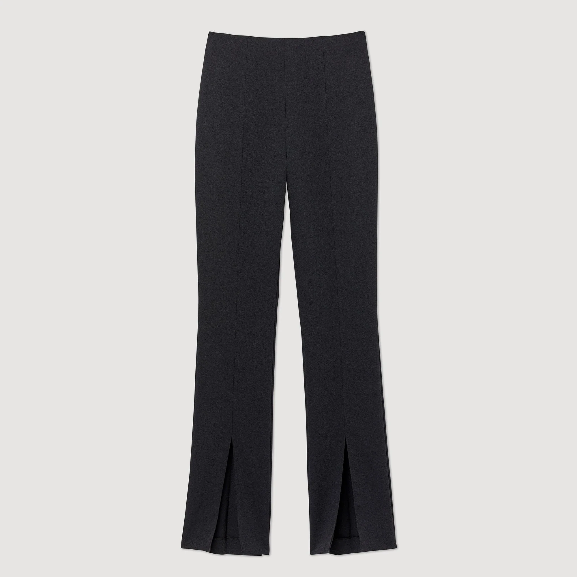 Pantalón de talle alto de pernera evasé, con cortes verticales en la pernera y una abertura en el bajo.