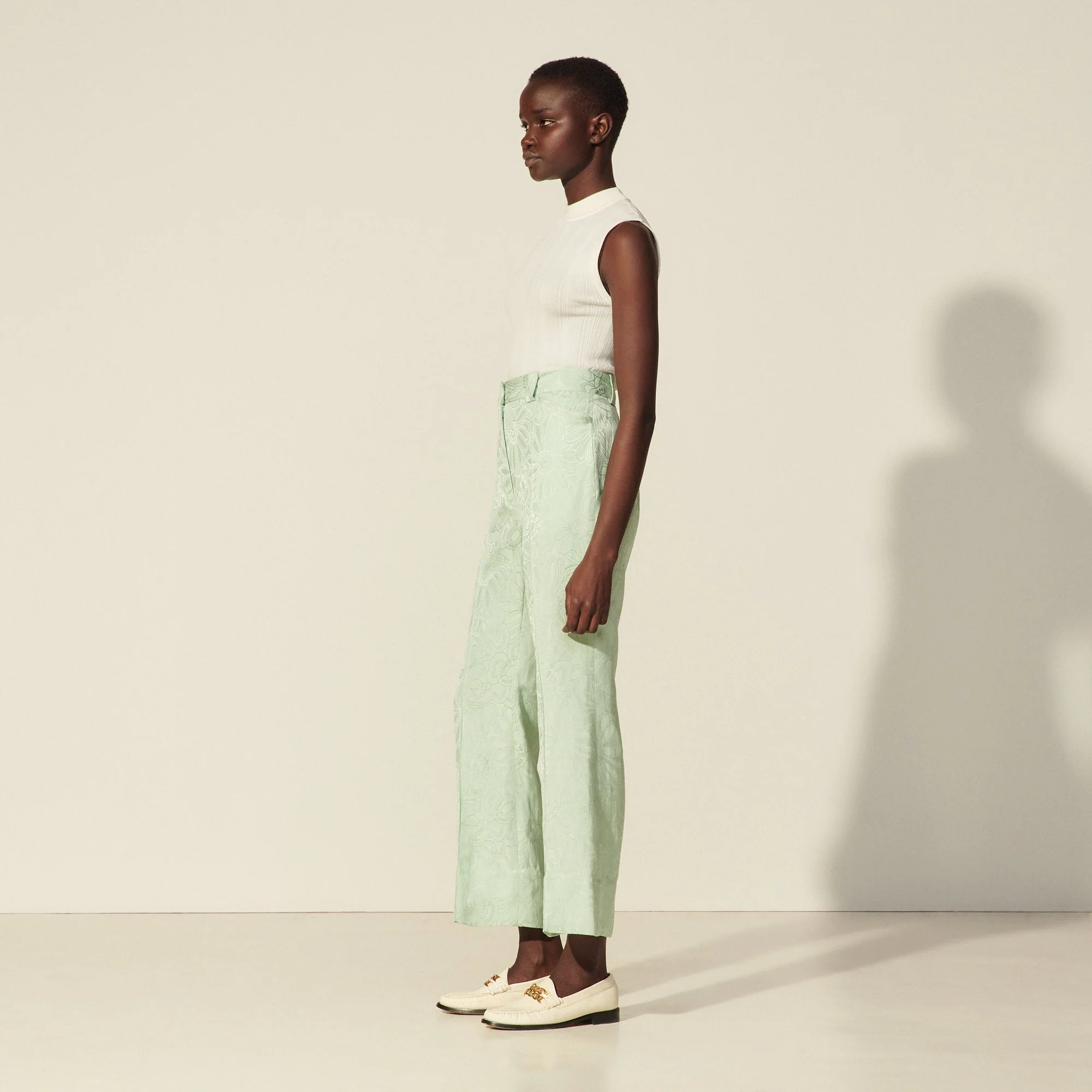 Pantalón Gabin Verde Claro. Pantalón de mujer Sandro • Pantalón de jacquard tono sobre tono • Talle alto • Trabillas de cinturón en la cintura • Bolsillos en la parte delantera • Bajo con un gran dobladillo • La modelo lleva la talla 36 Référence : SFPPA00735COMPOSICIÓN Tejido principal: 85% viscosa, 15% lino / Forro del cinturón: 100% algodón / Forro del bolsillo: 100% algodón
