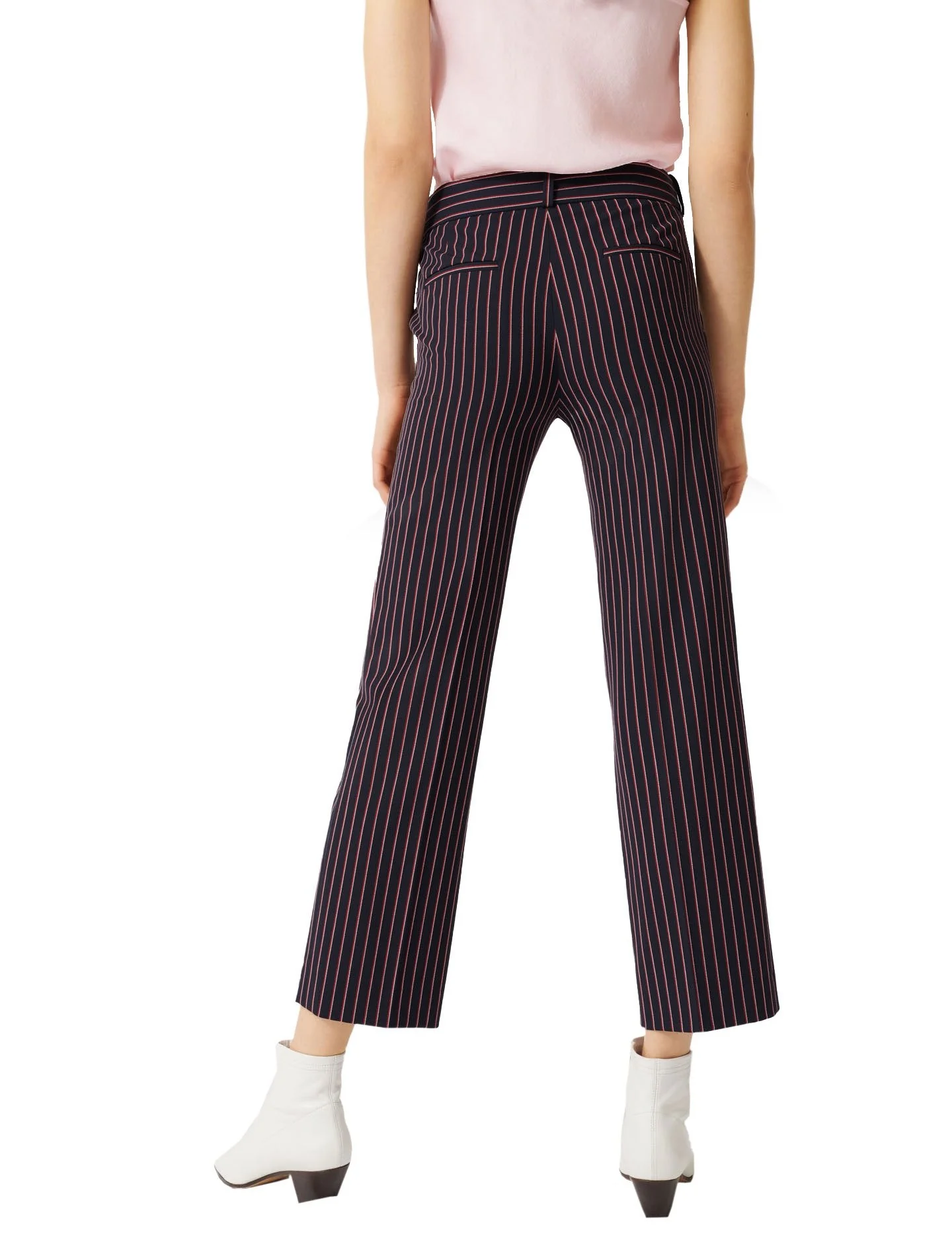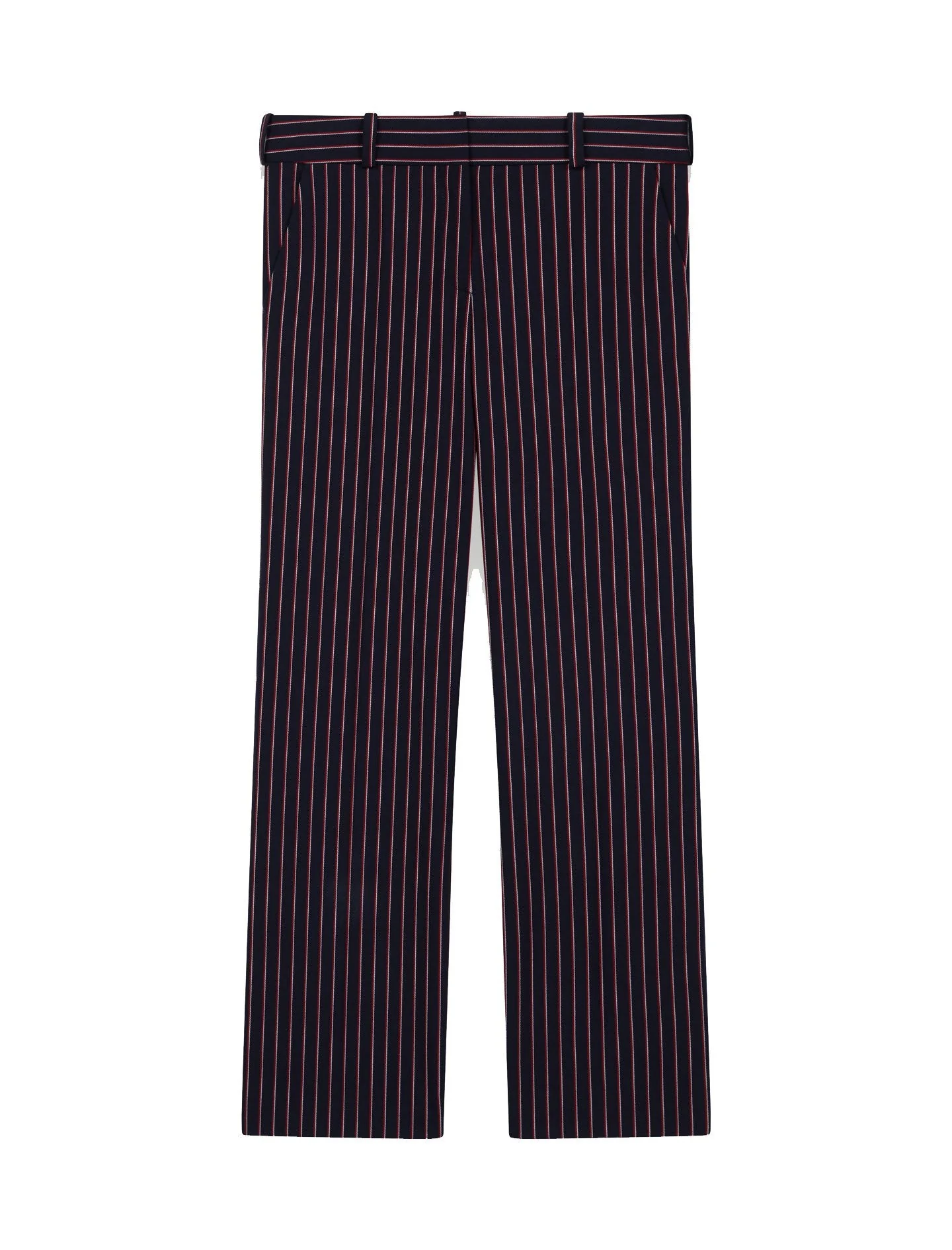 Pantalón de sastre negro con finas rayas rojas y blancas. Cinturilla aplicada con pasadores. La prenda de trabajo que se lleva con la chaqueta a juego para un total look preppy.