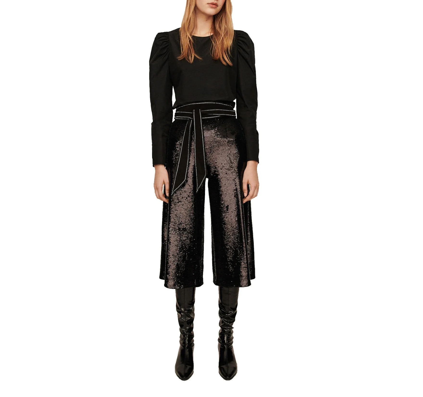 PANTALÓN NEGRO, MARCA MAJE. PANTALÓN CORTO ANCHO CON LENTEJUELAS, CREMALLERA LATERAL, NEGRO. 97% VISCOSA, 3% ELASTANO. LAVADO: LAVADO A MANO DEDLICADO. BLANQUEADOR: SIN BLANQUEADOR. SECADORA: NO USAR SECADORA.