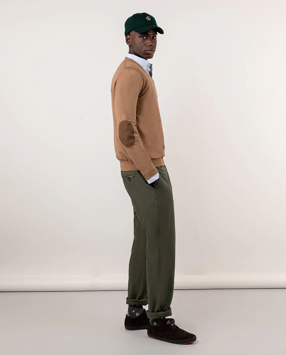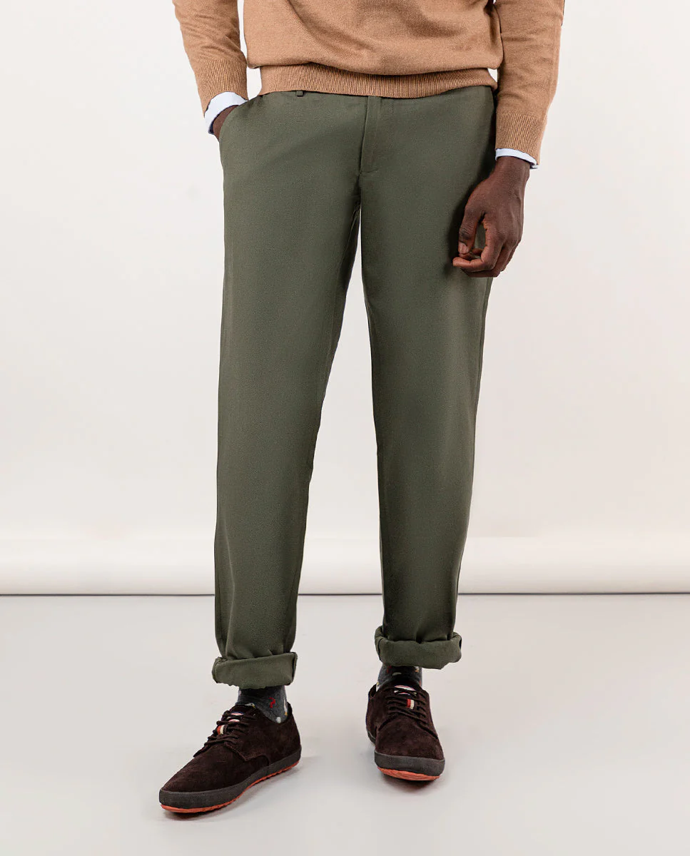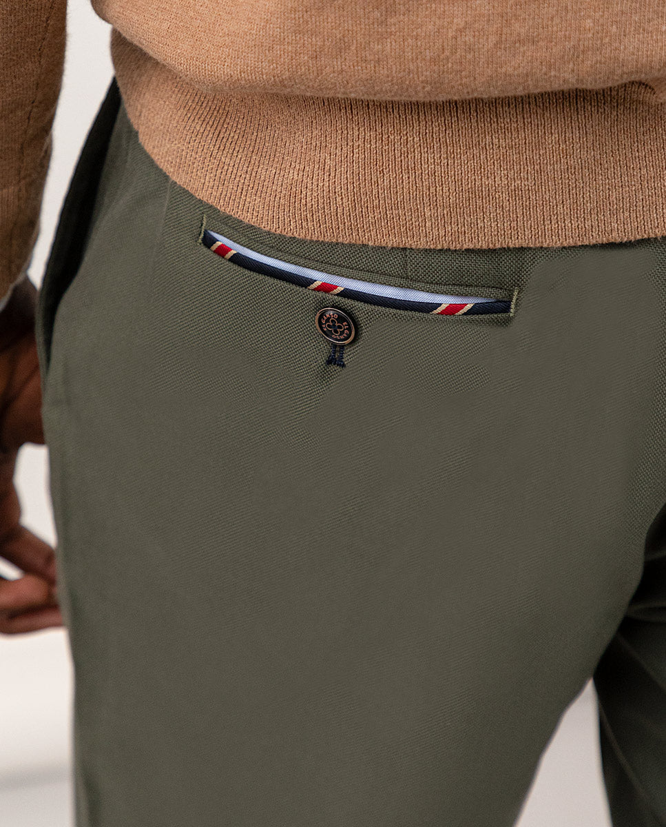 Pantalón de hombre con tejido Panamá en 100% algodón orgánico. Tiene un corte regular fit. Cierre mediante cremallera y botón. Dos bolsillos laterales, uno monedero y bolsillos traseros con vivos y abotonado. Trabillas para el cinturón. Cuenta con detalles en tejido corbatero marino con rayas rojas y blancas. Disponible americana a juego.
