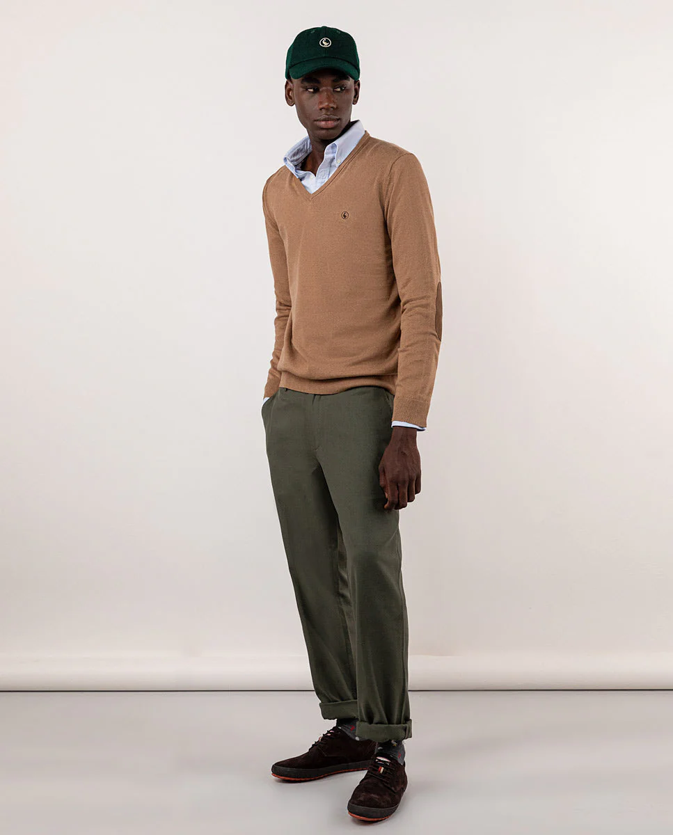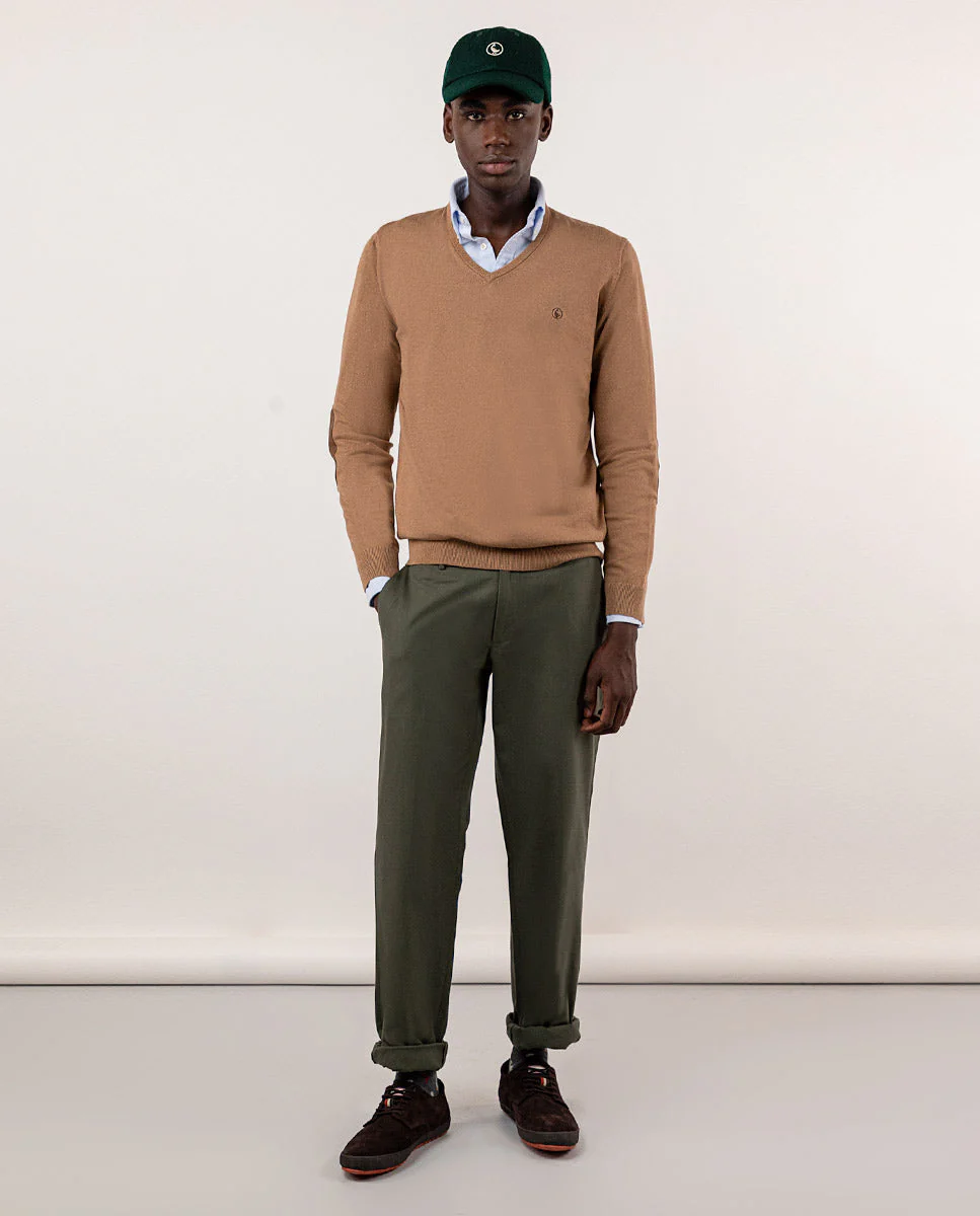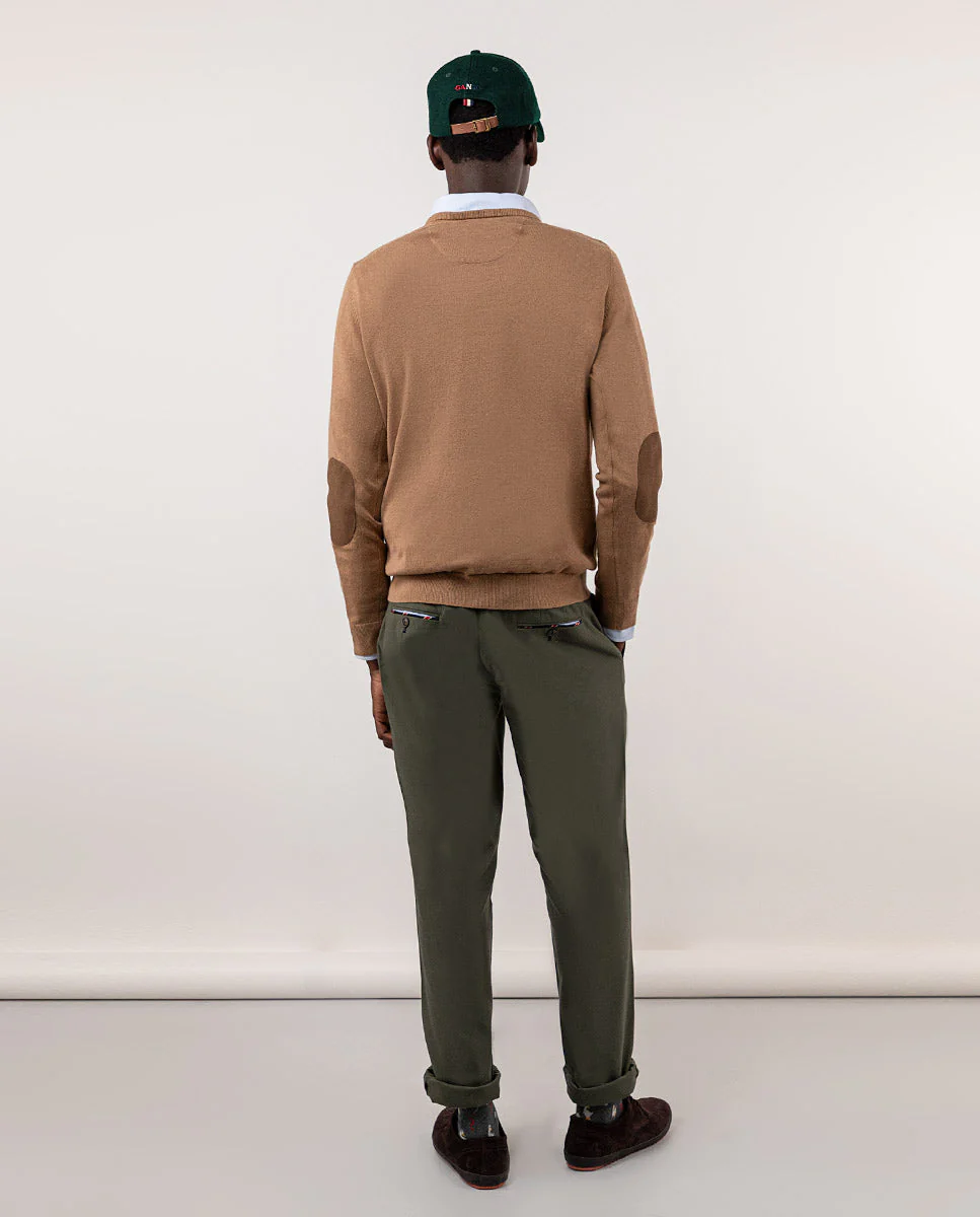 Pantalón de hombre con tejido Panamá en 100% algodón orgánico. Tiene un corte regular fit. Cierre mediante cremallera y botón. Dos bolsillos laterales, uno monedero y bolsillos traseros con vivos y abotonado. Trabillas para el cinturón. Cuenta con detalles en tejido corbatero marino con rayas rojas y blancas. Disponible americana a juego.