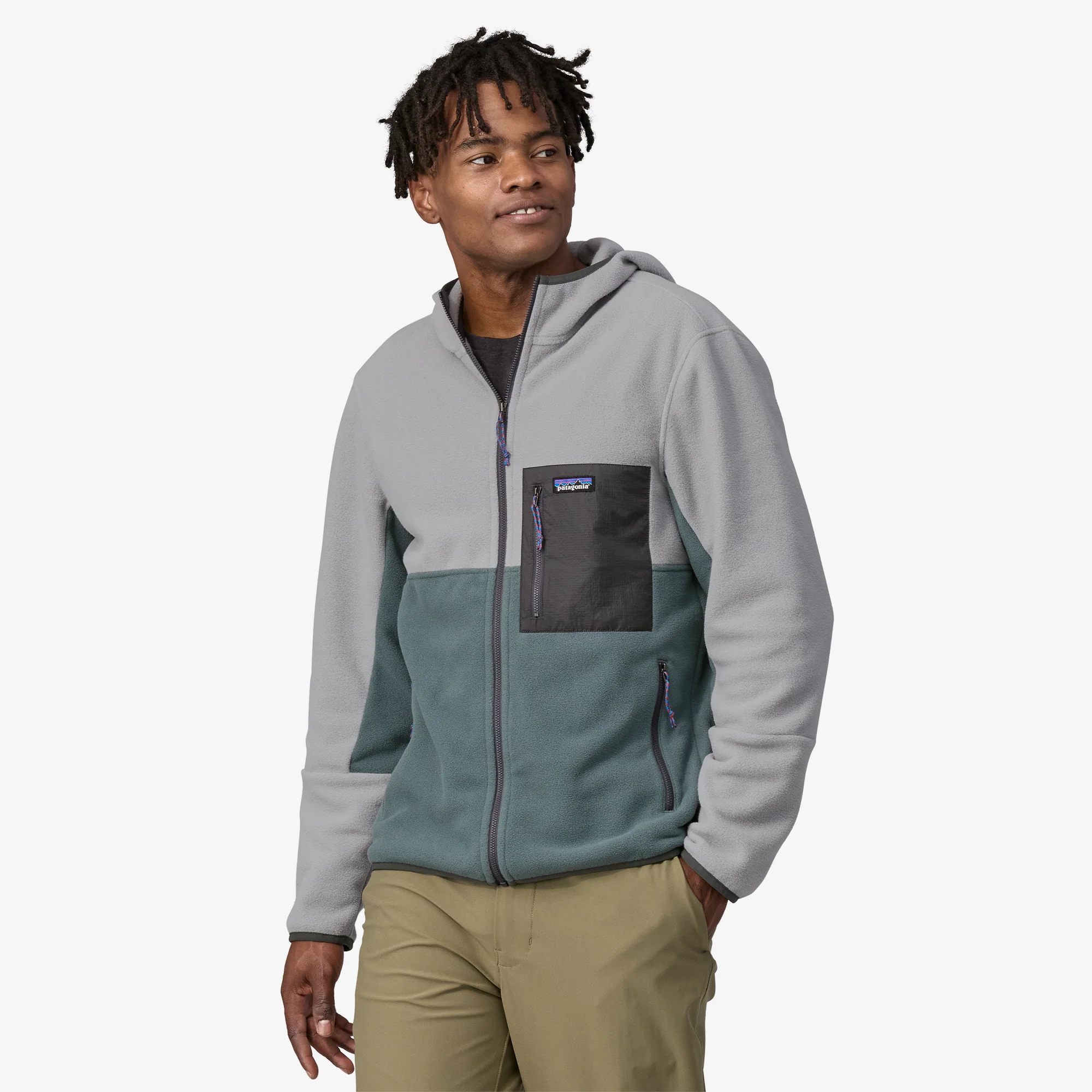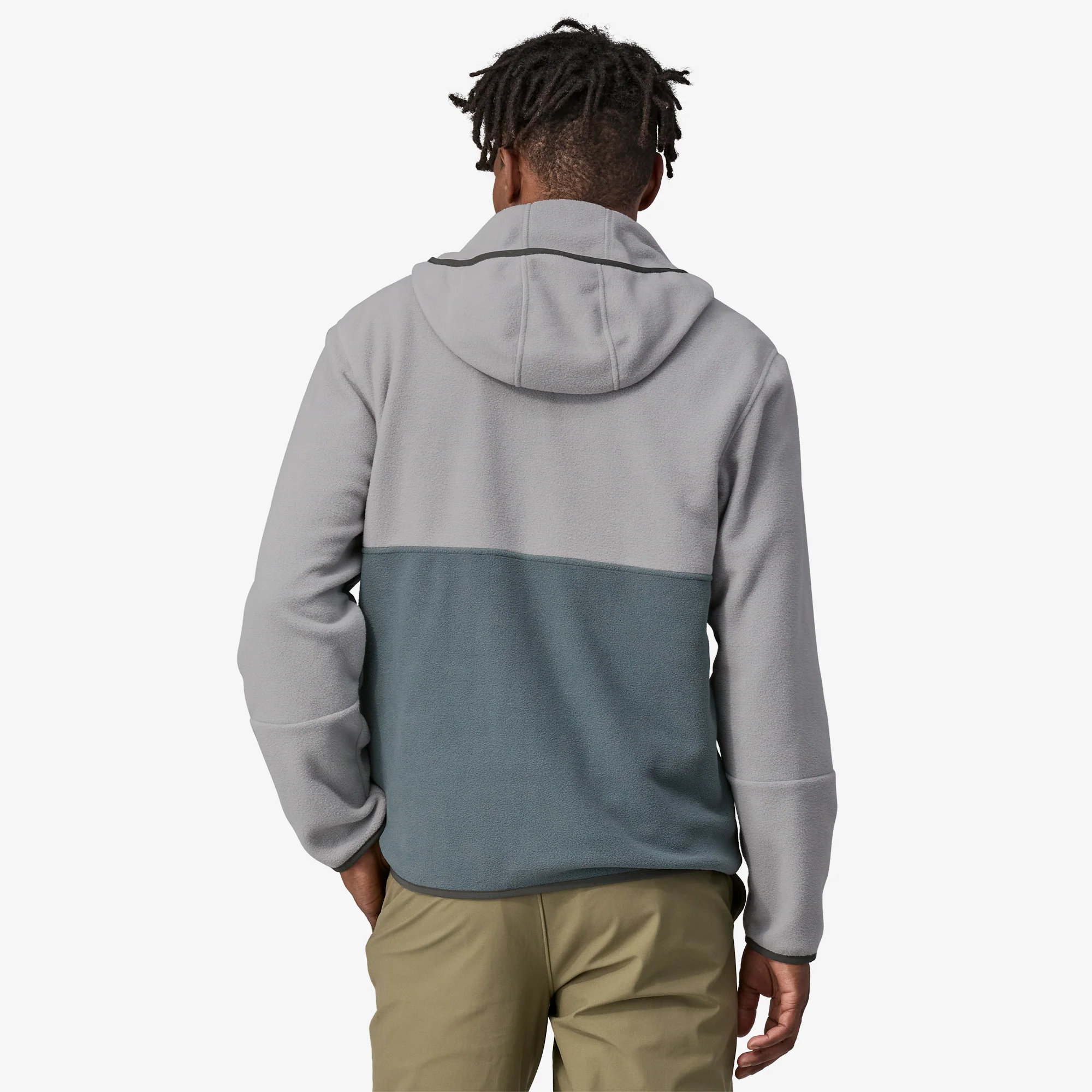 - Cuerpo: 5.7-oz (161 g) de liviano polar aterciopelado 100% poliéster reciclado. Bolsillo: 1.2-oz (34 g) de ripstop 100% nylon reciclado con un acabado DWR sin PFC (capa duradera repelente al agua sin químicos perfluorados). Con Certificación Fair Trade™