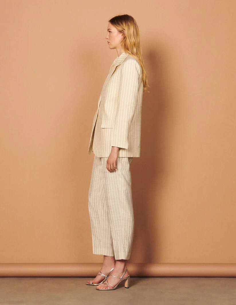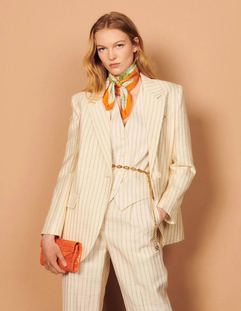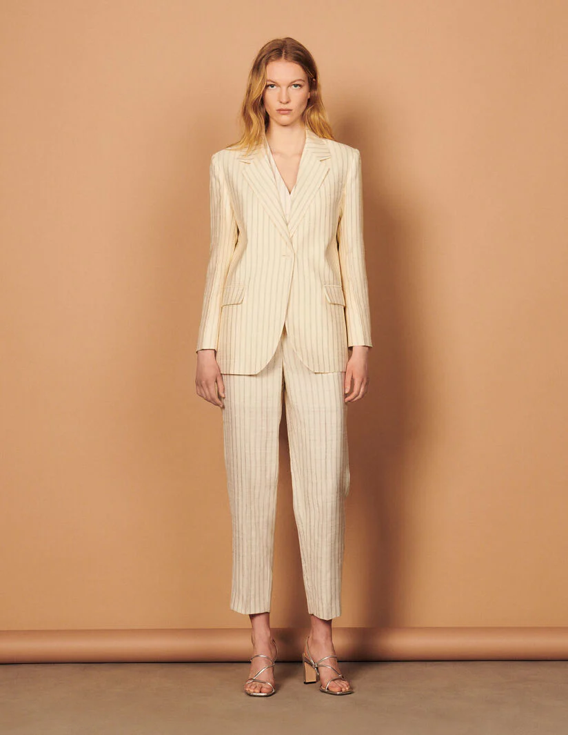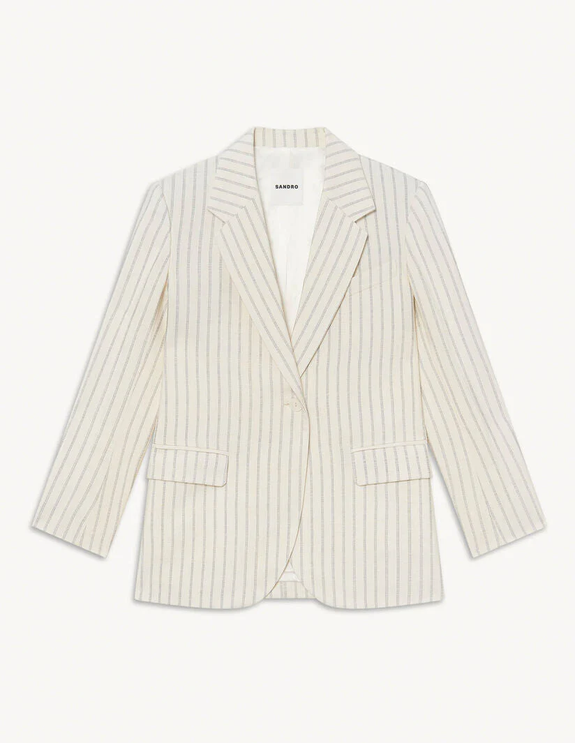 Chaqueta de sastre de manga larga sublimada con un estampado de rayas y cierre de un botón.