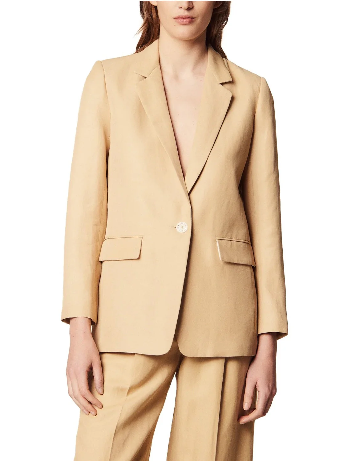 SACO CORTE REGULAR EN TEJIDO LISOS, CON UN SOLO BOTÓN, MARCA SANDRO. CONSULTAR COMPOSICIÓN E INSTRUCCIONES DE LAVADO EN ETIQUETA INTERNA.