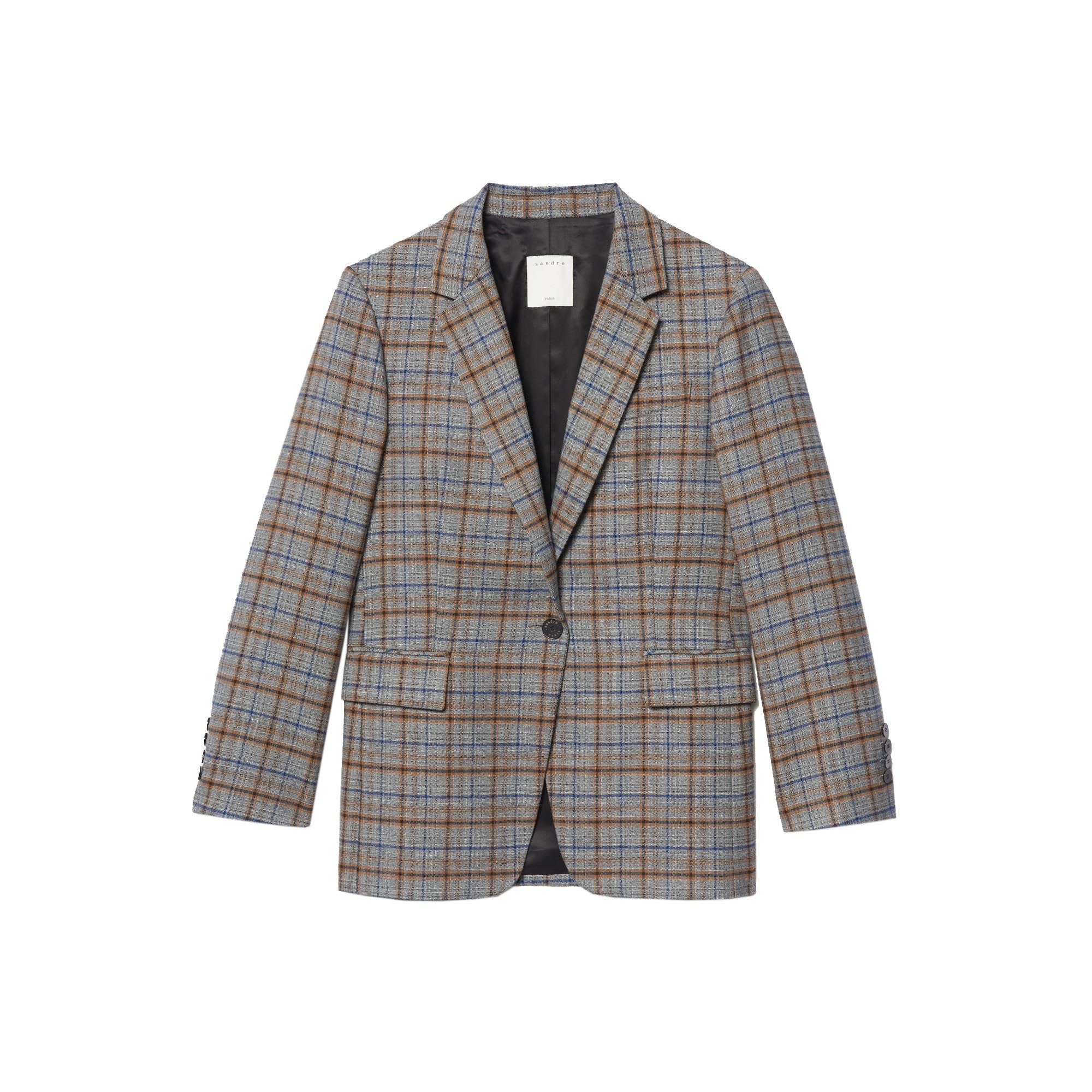 SACO CORTE REGULAR EN TEJIDO DE CUADROS, CON UN SOLO BOTÓN, MARCA SANDRO. 54% POLIÉSTER 44% LANA VIRGEN 2% ELASTANO. LIMPIEZA EN SECO PROFESIONAL. REVISAR ETIQUETA INTERNA DE LAVADO PARA MÁS INFORMACIÓN.