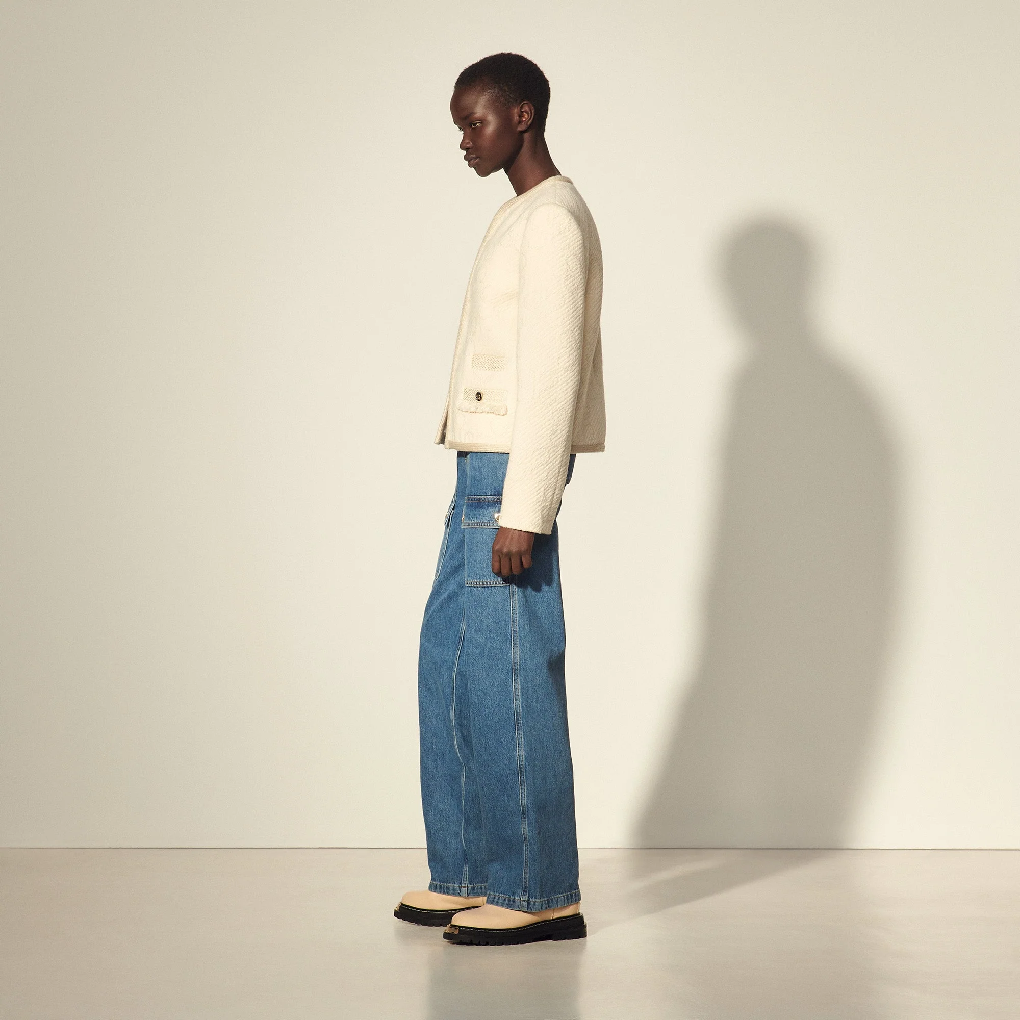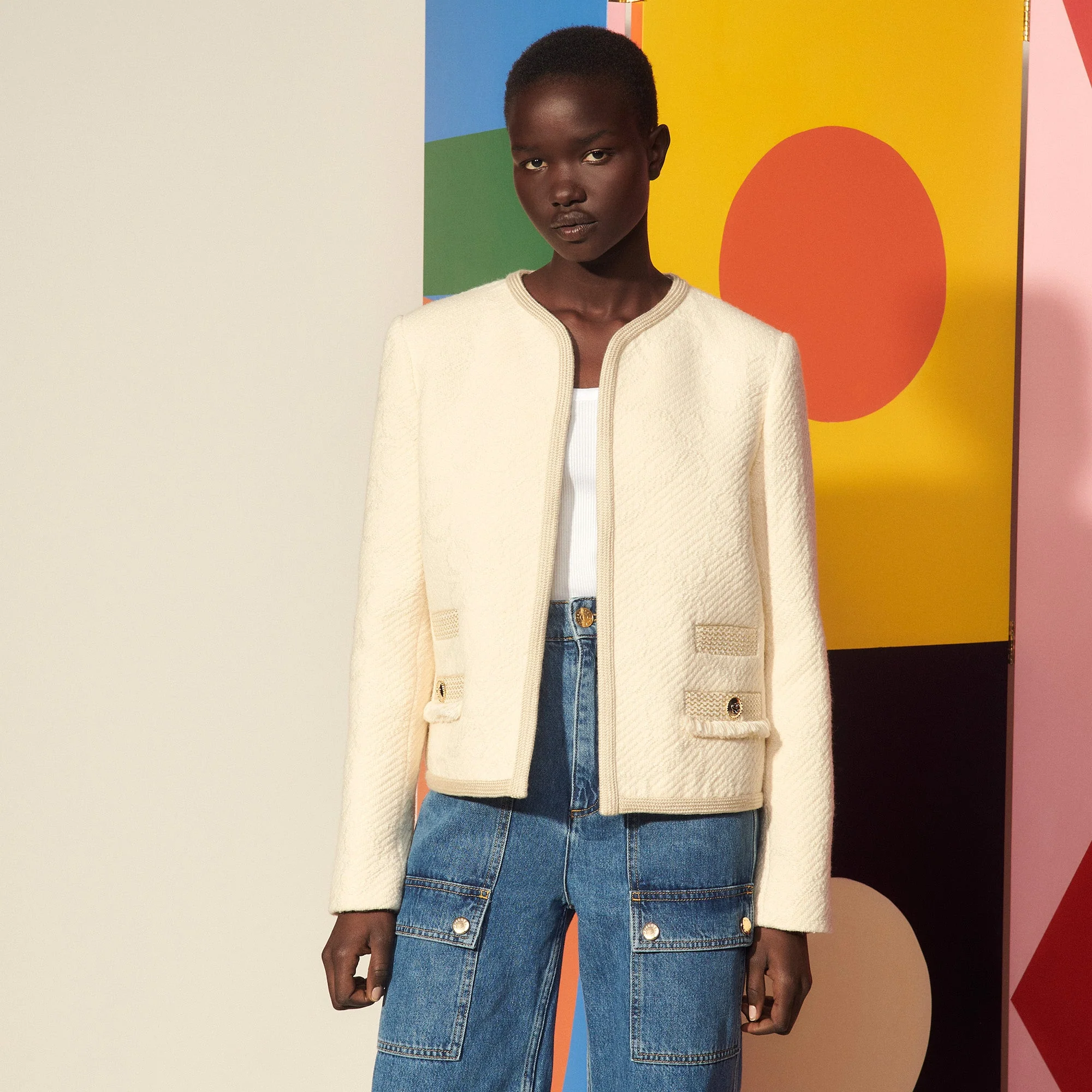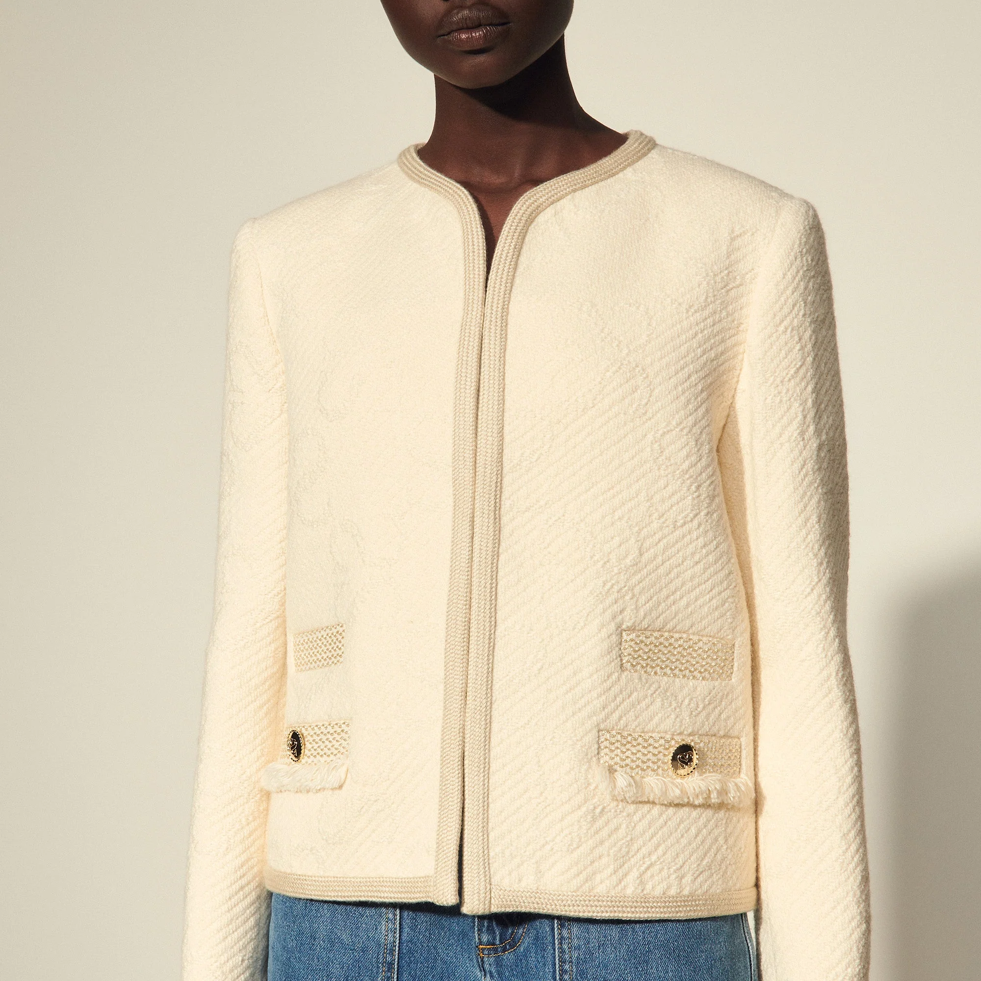 Saco Sble Ecru. Chaqueta de mujer Sandro • Chaqueta de tweed doble S • Cuello redondo • Manga larga con flecos en el extremo de la manga • Bolsillos de ojal con detalles de flecos y botón fantasía • La modelo lleva la talla 36 Référence : SFPVE00526COMPOSICIÓN Tejido principal: 56% lana, 22% acrílico, 12% poliamida, 8% algodón, 2% poliéster Forro cuerpo: 100% viscosa Forro bolsillos: 100% algodón