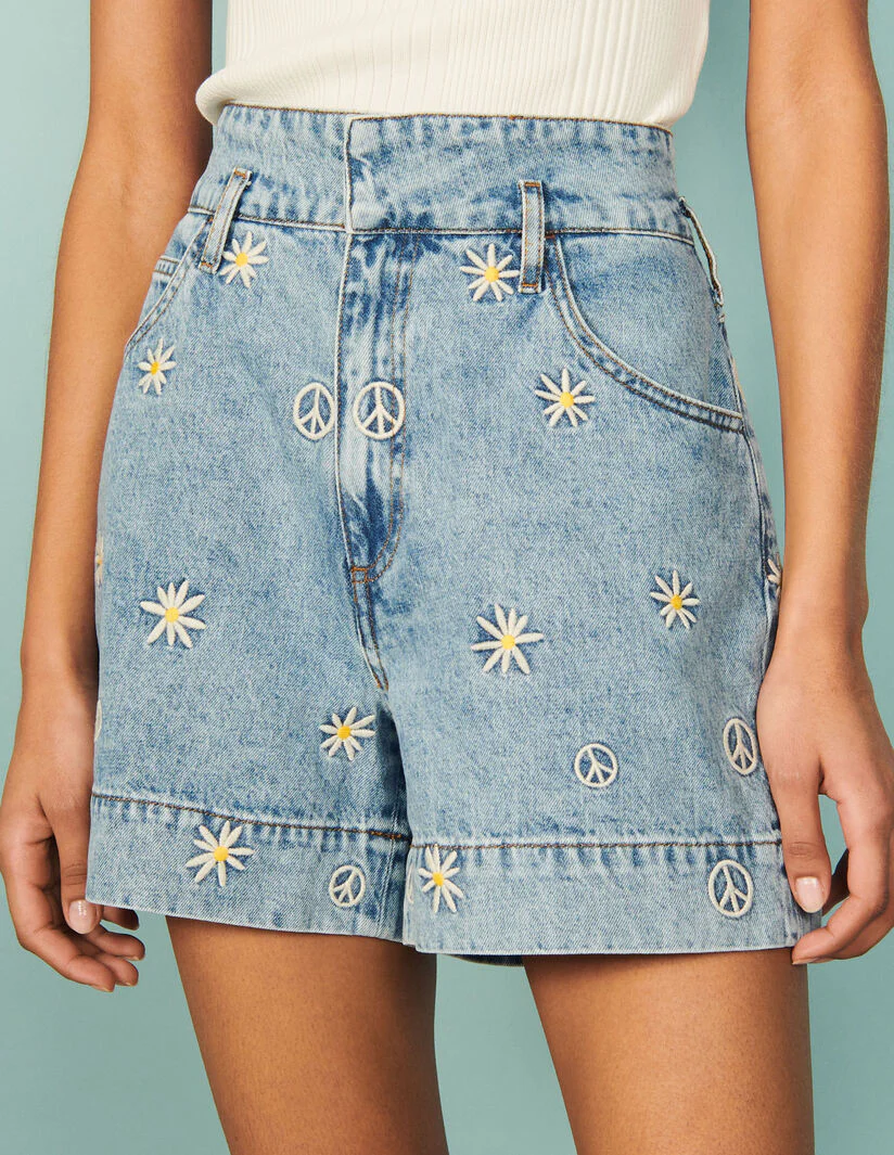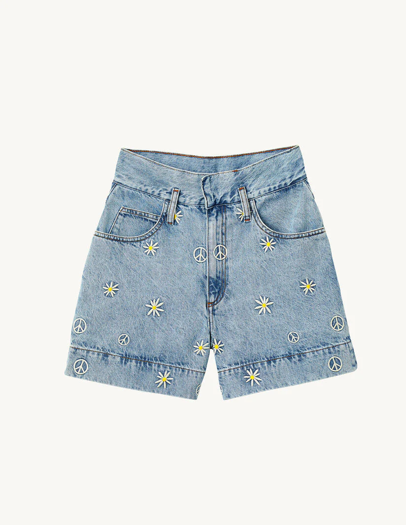 Short de denim desteñido de corte ancho y talle alto, sublimado con motivos bordados Peace y margaritas.