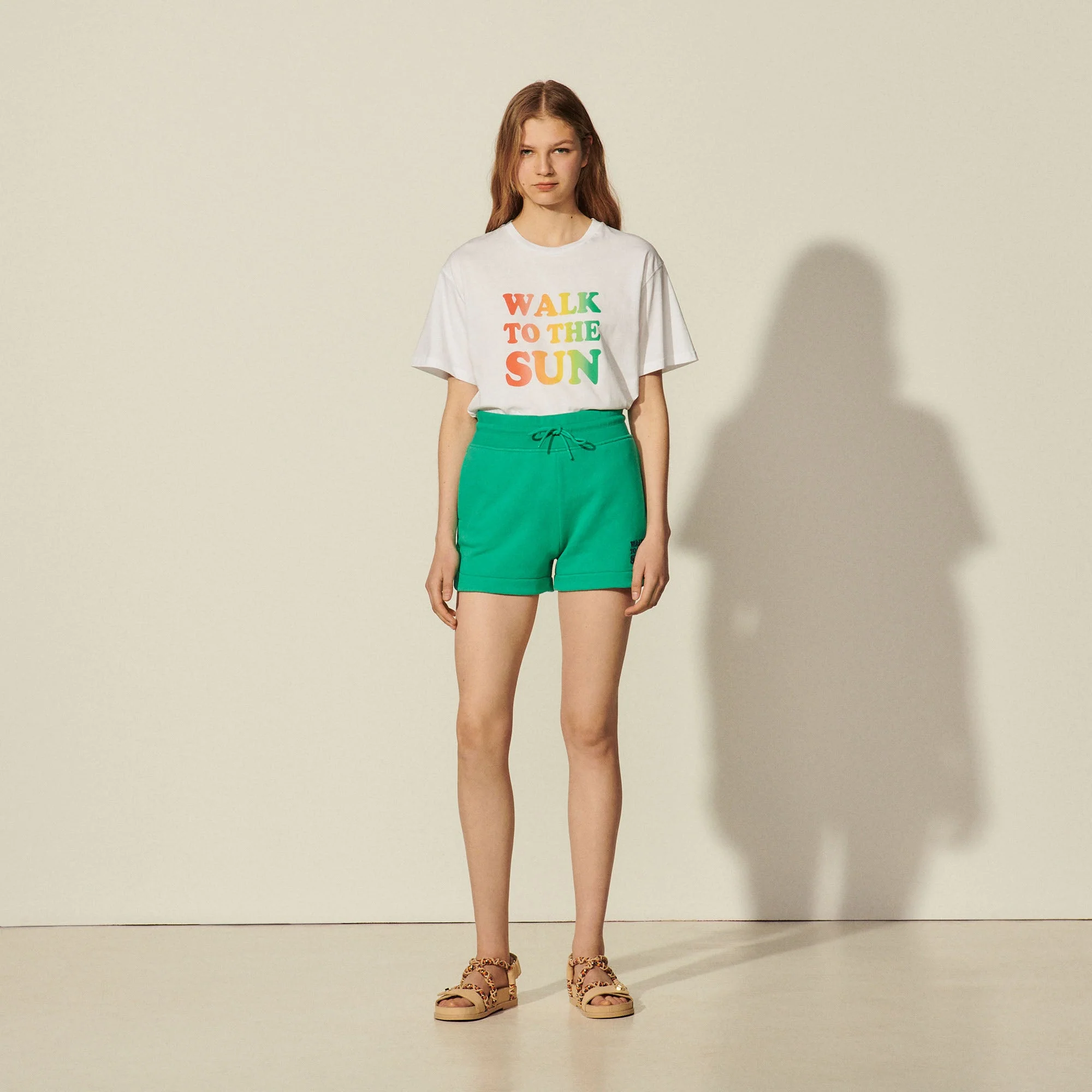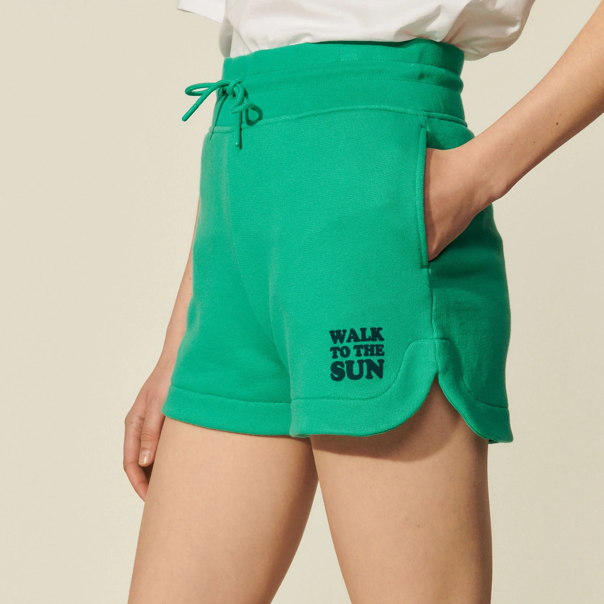 Short de mujer Sandro Short de muletón Adorno con mensaje Cinturón ancho con cordón corredizo y cordón Corte recto y amplio Short a juego con lasudadera La modelo lleva la talla 36 Este modelo está confeccionado en algodón procedente de la agricultura orgánica. El consumo de agua y de sustancias químicas para su cultivo es limitado, lo que lo convierte en un producto respetuoso con el medioambiente y el ser humano. REFERENCIA : SFPSH00130 COMPOSICIÓNTejido principal: 100% algodón Remate elástico: 100% algodón Flocado: 100% poliamida