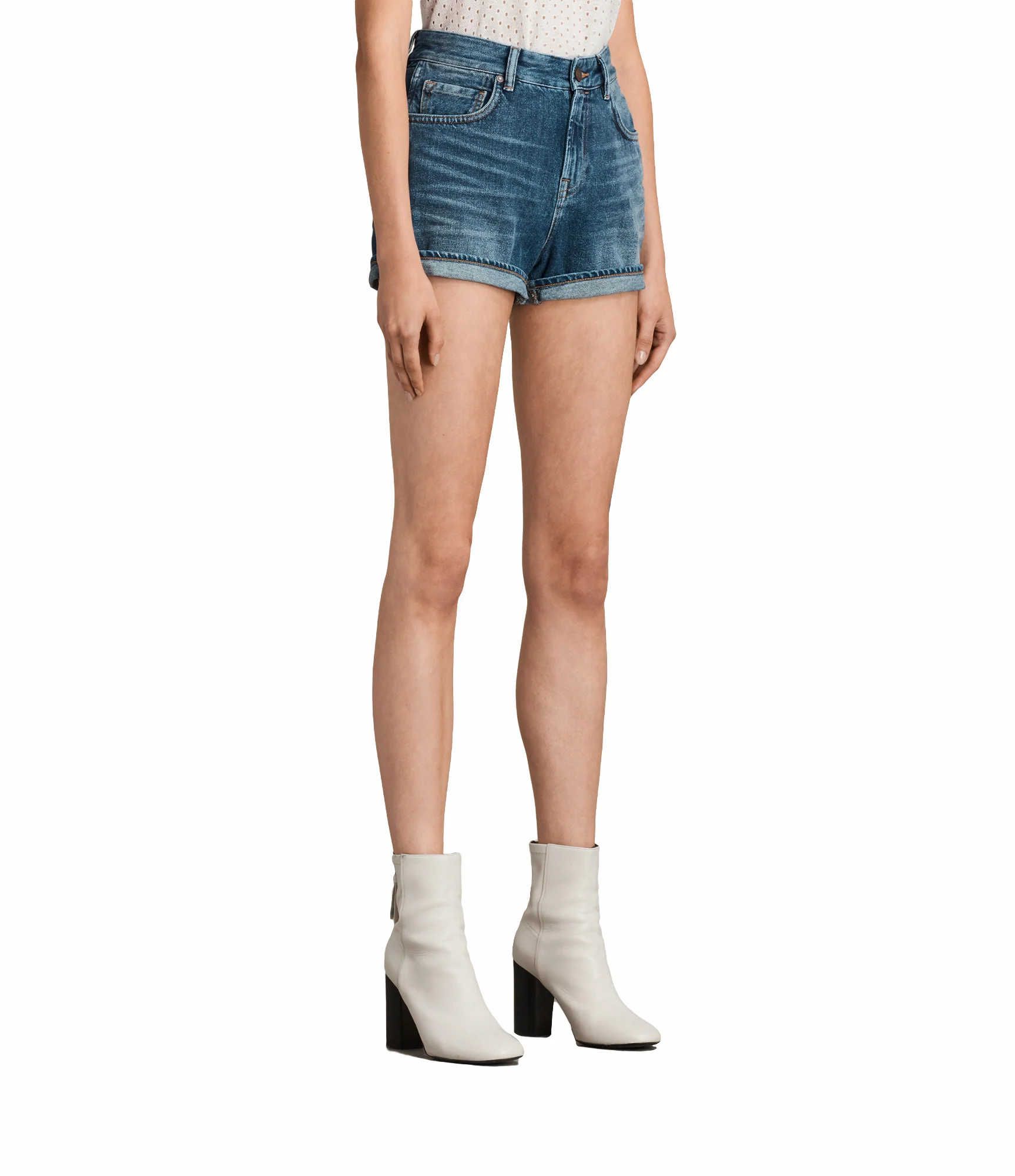 SHORT HELENA HIGHWAIST, MARCA ALLSAINTS. SHORT DENIM CORTE REGULAR, DOBLADILLO, BOLSILLOS Y TRABILLAS, AZUL. 100% ALGODÓN. LAVAR A MÁQUINA AL REVÉS.