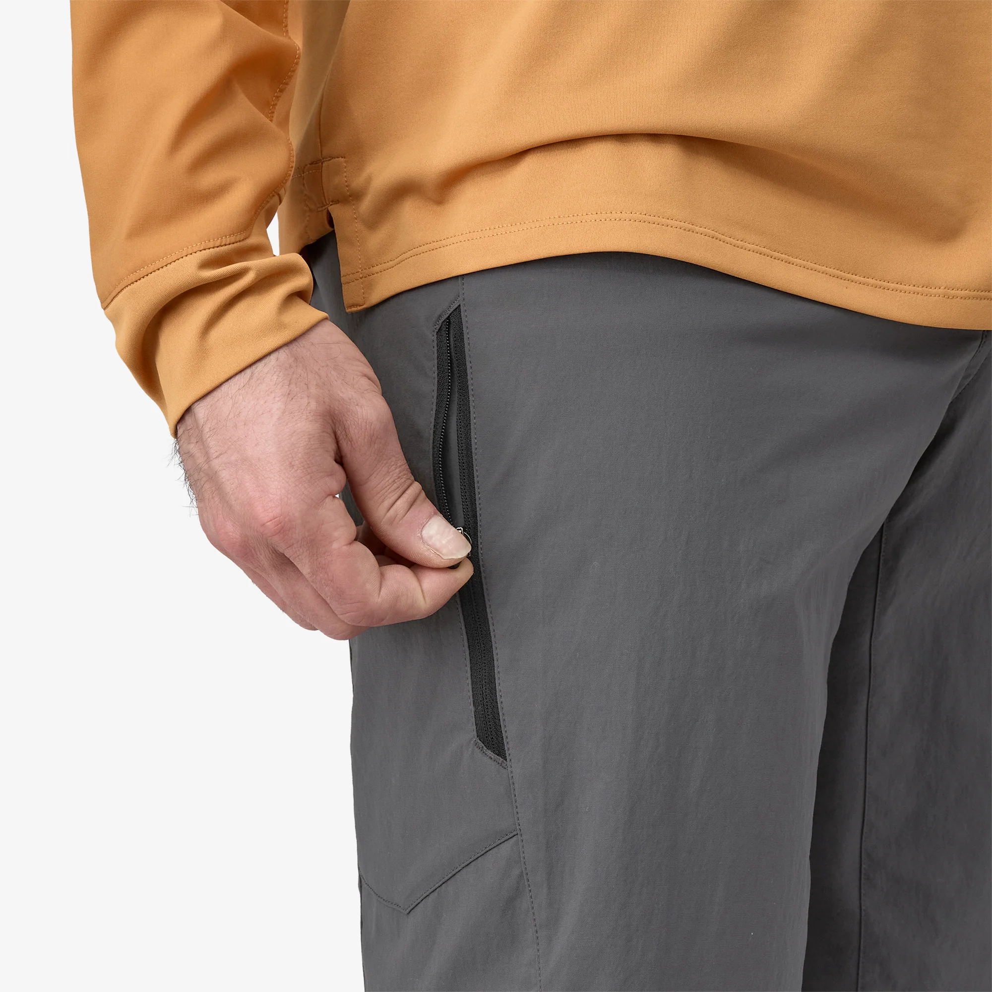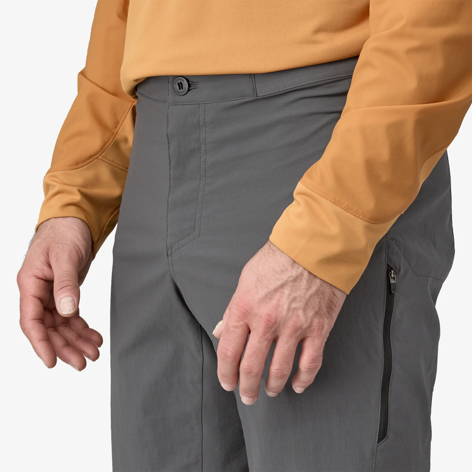 La pretina de bajo perfil con paneles elásticos y bragueta de cremallera con botón minimizan las molestias y dobleces en la cintura para un calce sin rozaduras bajo cinturones de mochila.