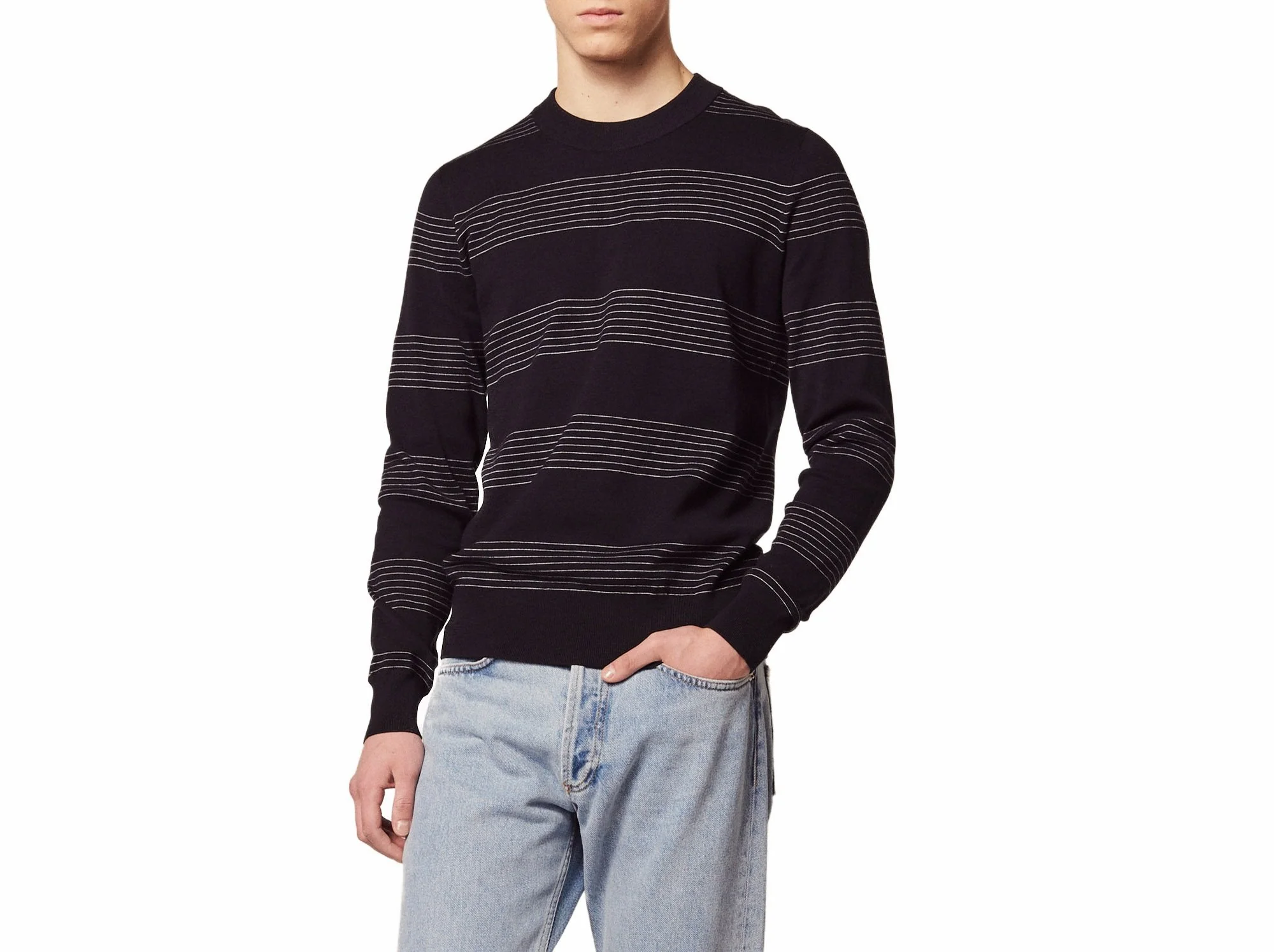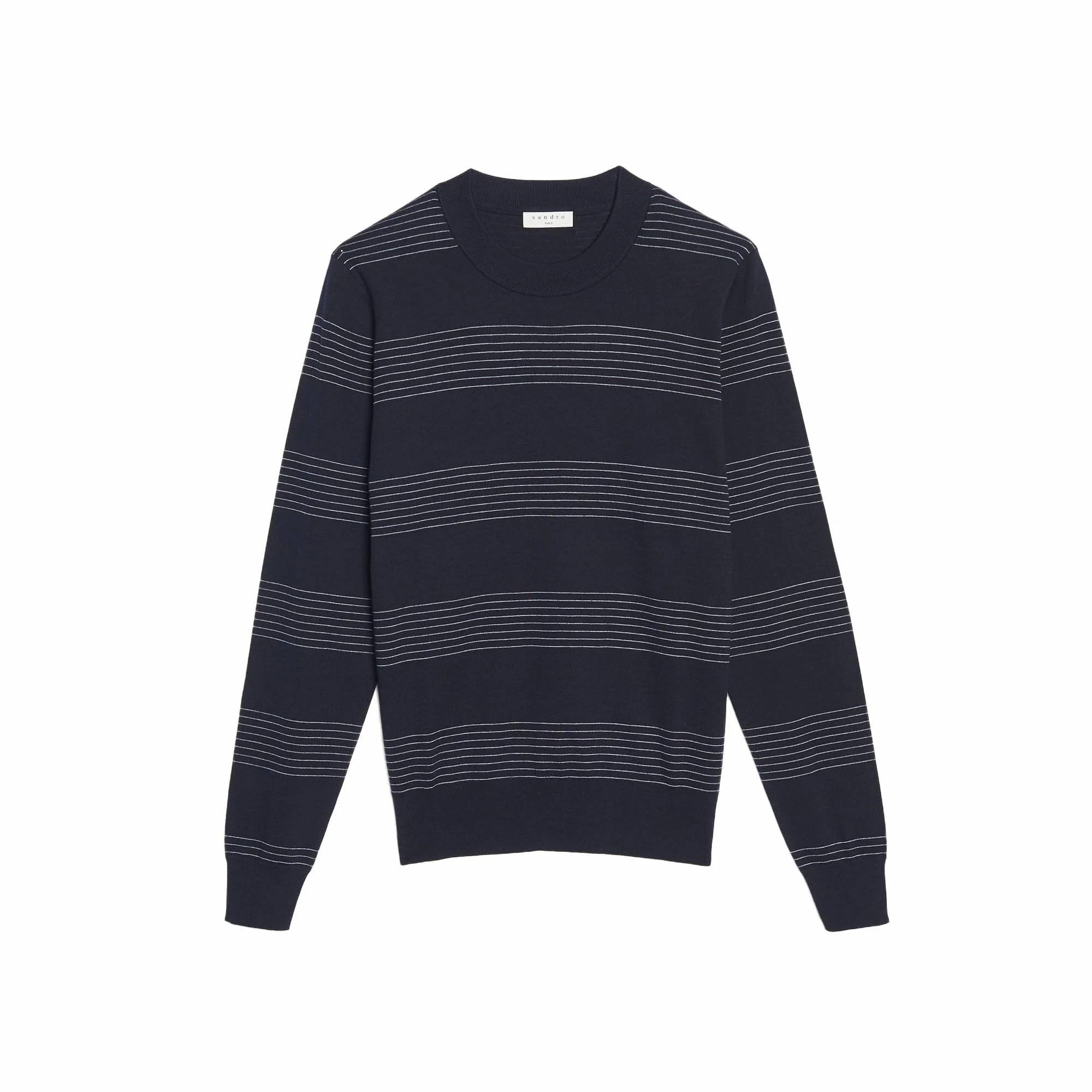 SWEATER MANGA LARGA CUELLO REDONDO EN DISEÑO A RAYAS, MARCA SANDRO. 100% ALGODÓN. LAVADO A MANDO DELICADO, SIN BLANQUEADOR, NO SECADORA. REVISAR ETIQUETA INTERNA DE LAVADO PARA MÁS INFORMACIÓN.