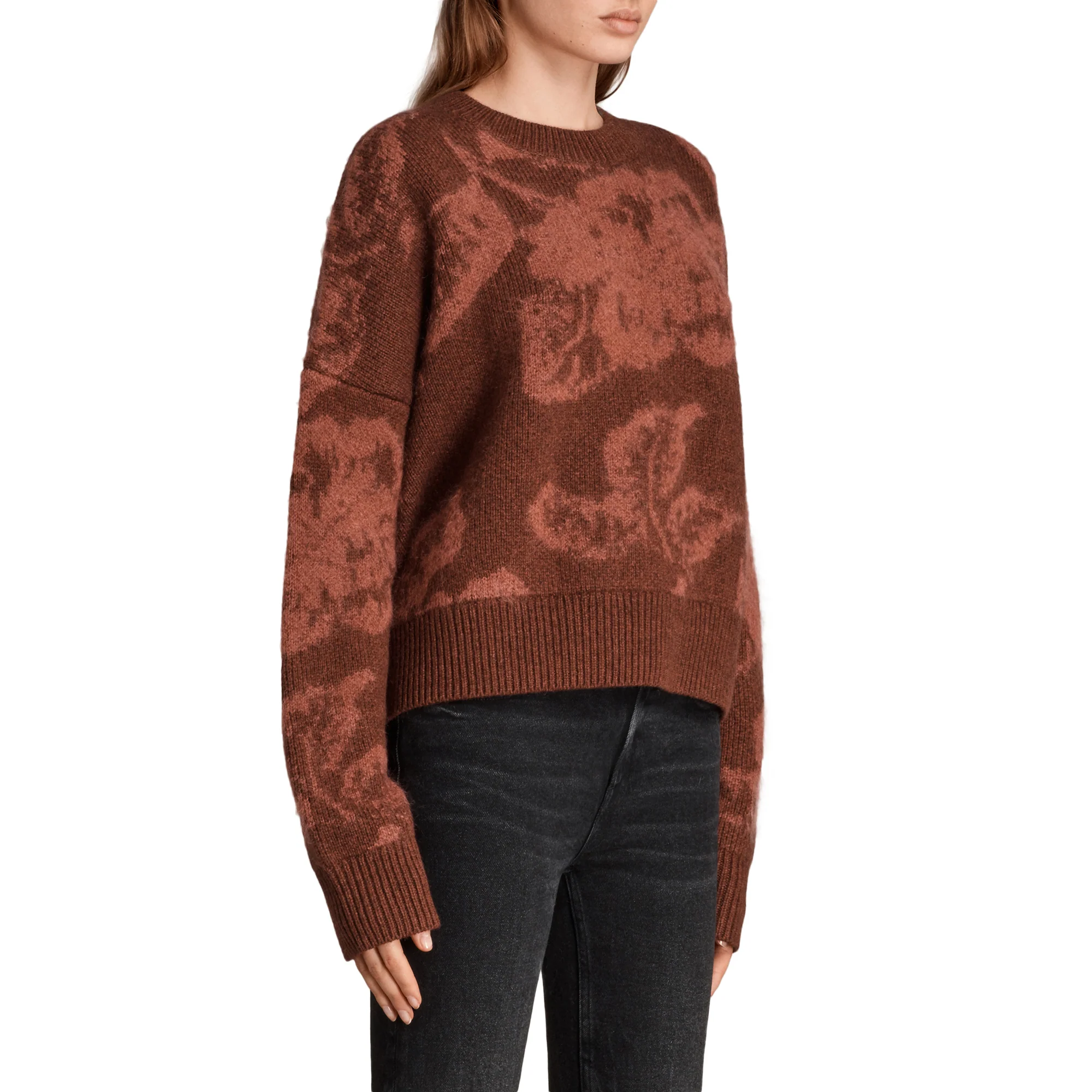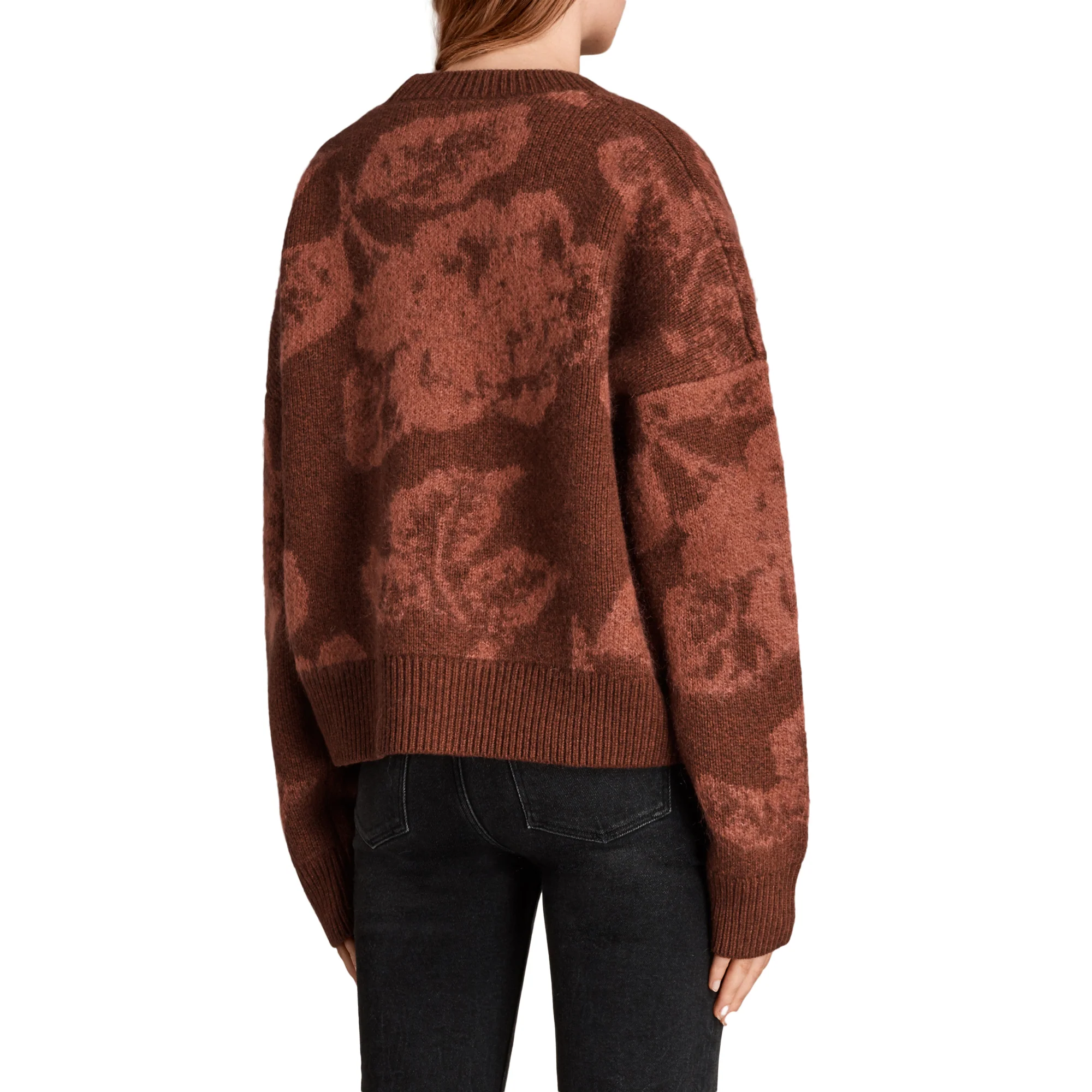 SWEATER KASURI CREW, MARCA ALLSAINTS. SWEATER OVERSIZE CUELLO REDONDO, MANGAS LARGAS HOLGADAS. 31% LANA, 27% NYLON, 21% MOHAIR, 16% VISCOSA, 5% CACHEMIR. LAVADO A MANO O LAVADO EN SECO.