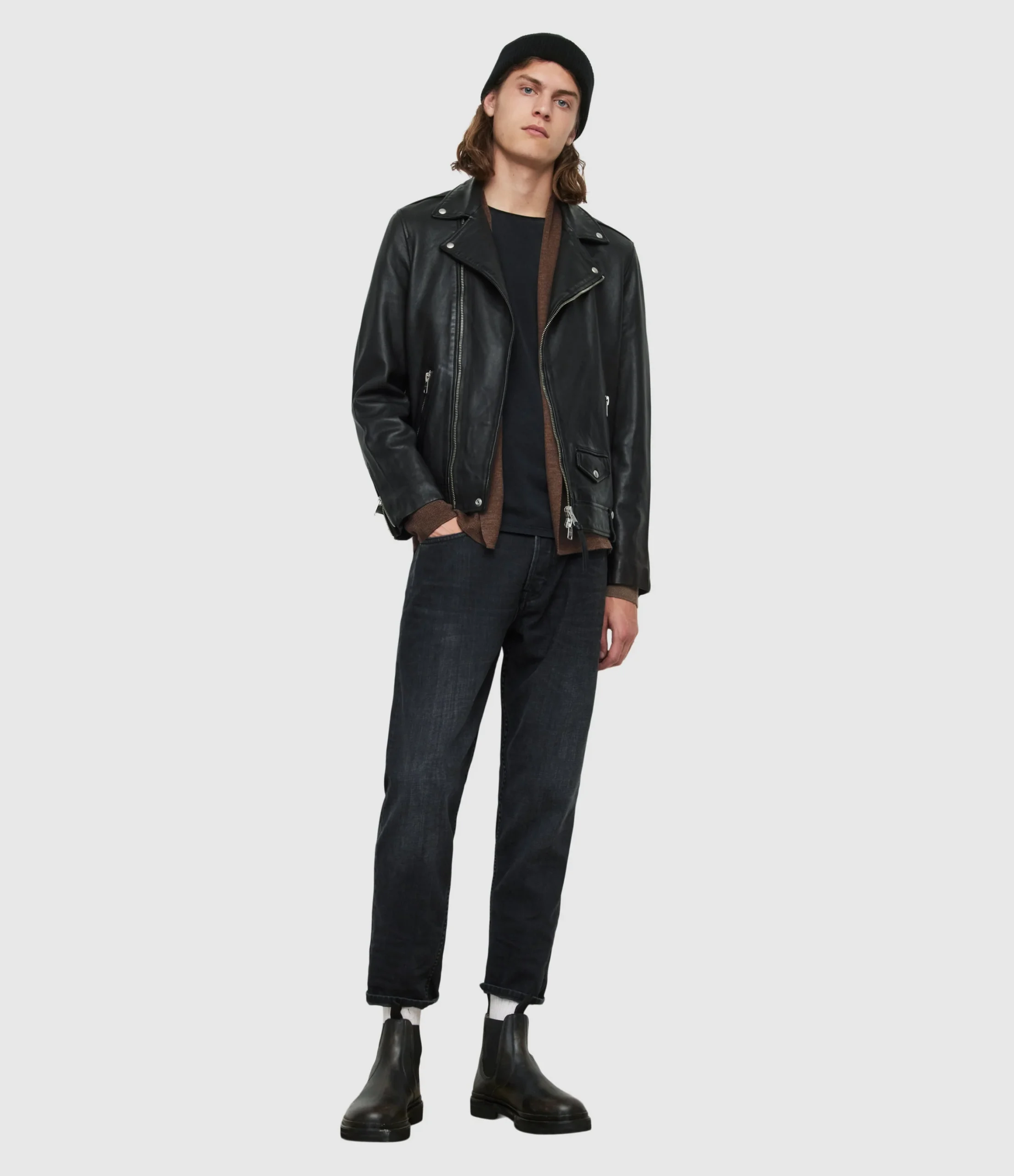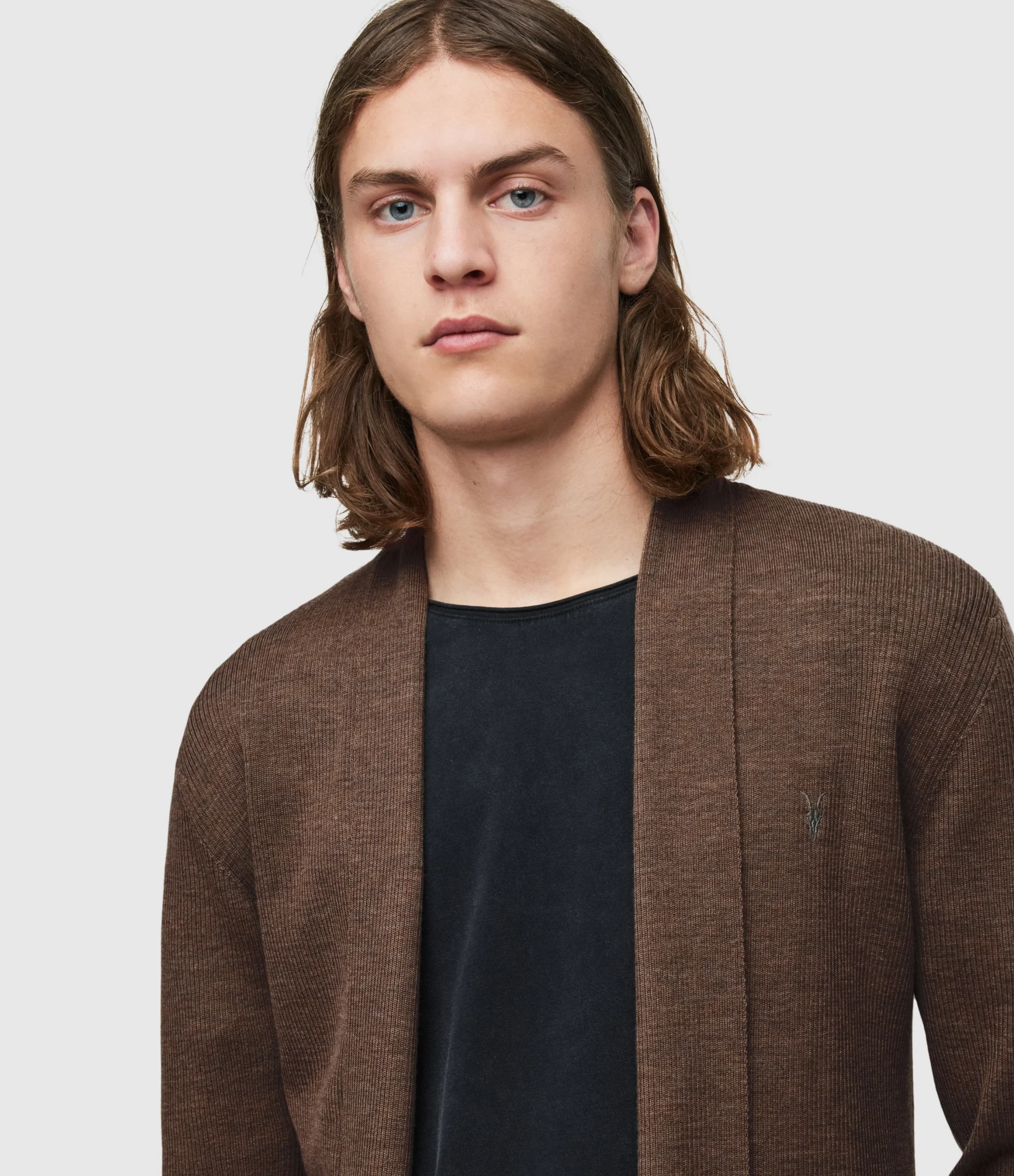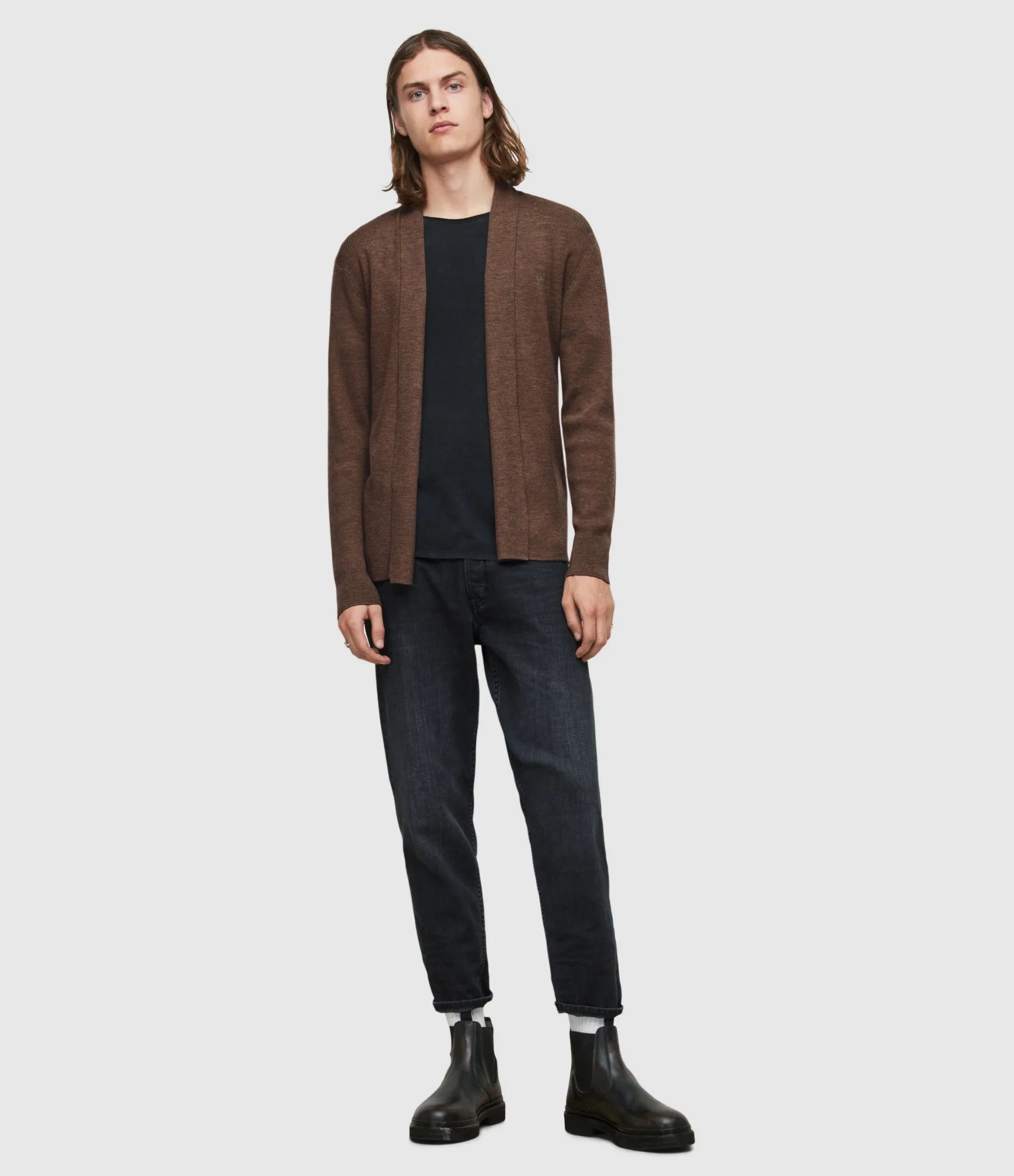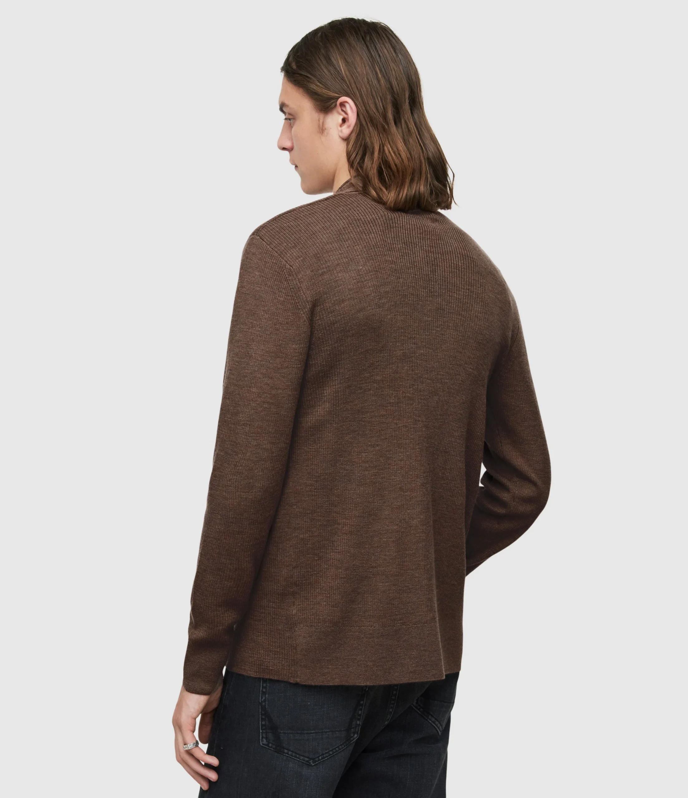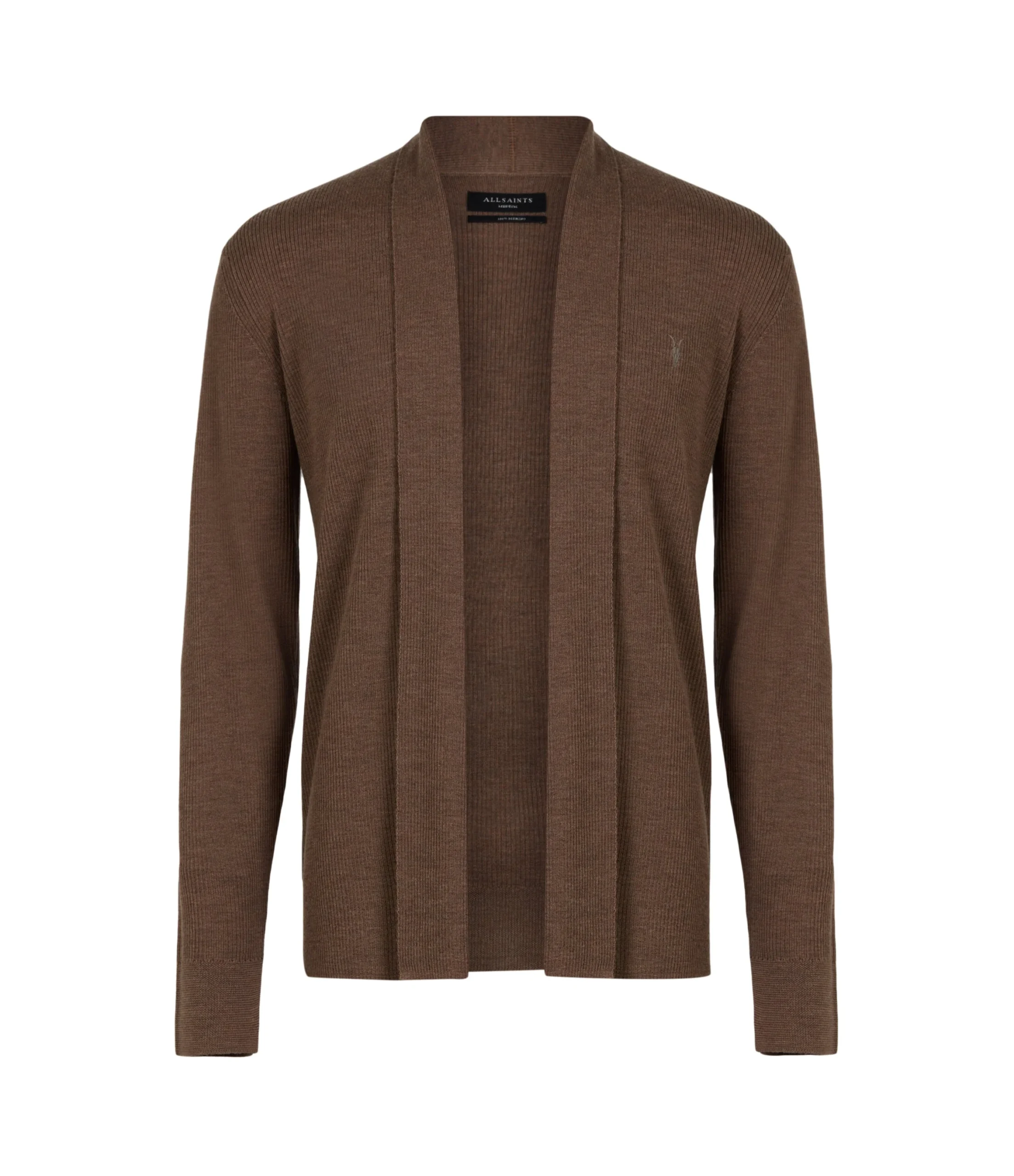 Tejido Mode Merino Café para hombre, marca AllSaints, cardigan abierto. COMPOSICIÓN Y LAVADO: Consultar etiqueta interna.